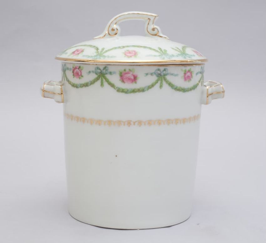 Porcelain cylindrical tea caddy with lid. Decorated with a swag of greenery held up by blue ribbons. Above each curve of the swag is a pink rosebud. Also decorated with gilt designs. Base with squared handles. Lid with squared loop finial.