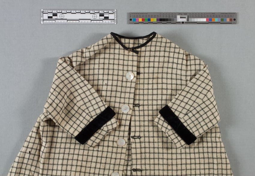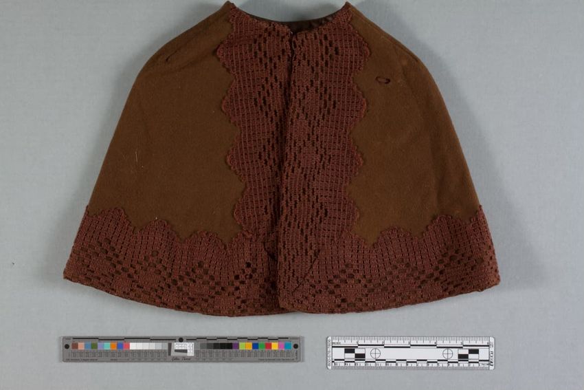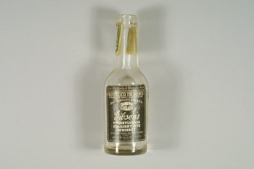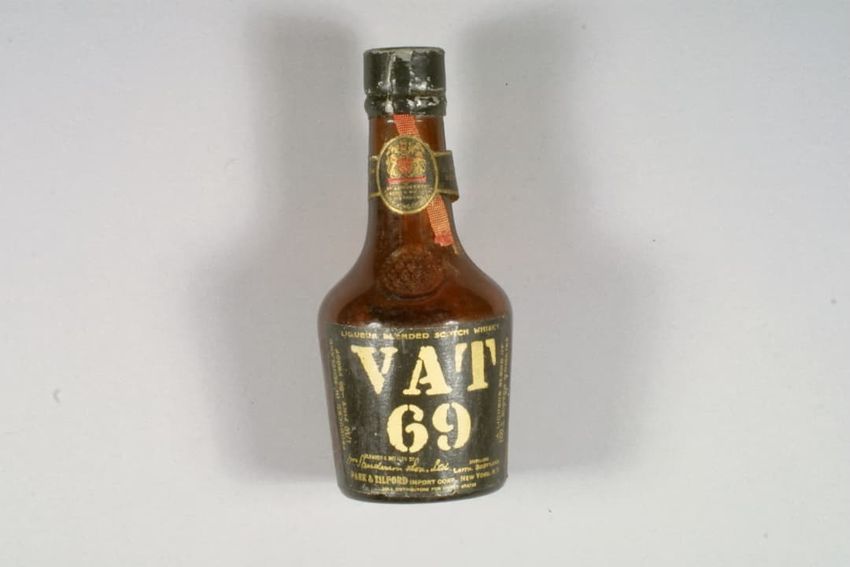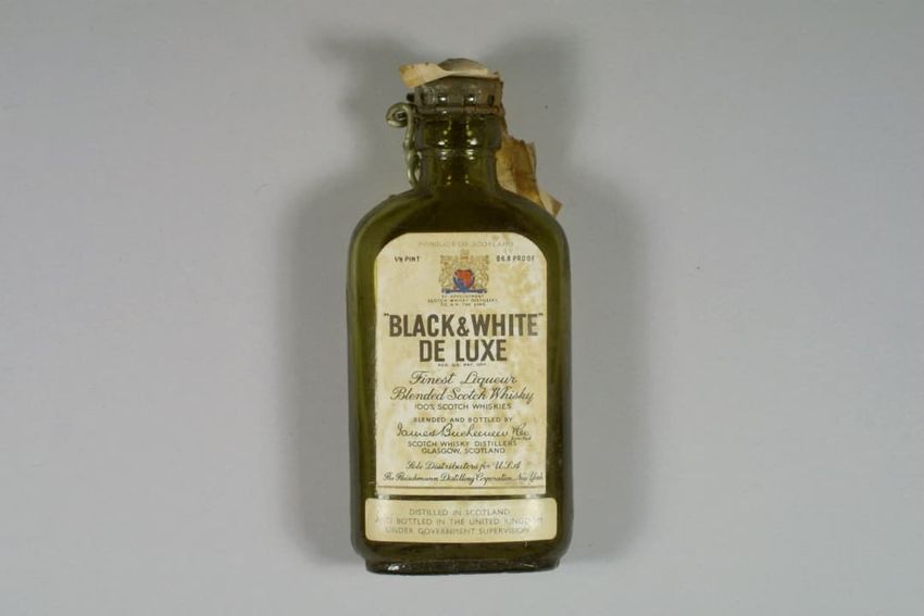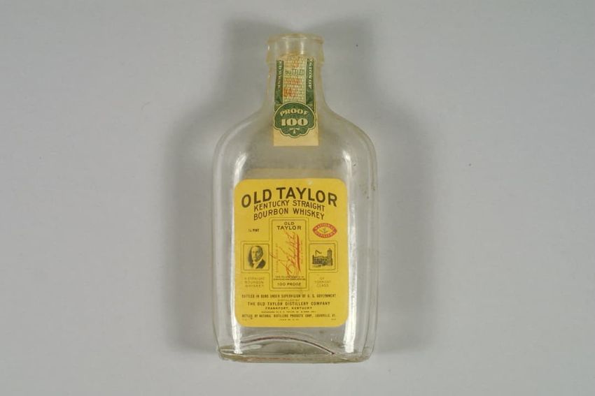 Wooden cigar box covered in paper labels, box contains sheet of three cent stamps, six match books, a clear round plastic box, tube of lipstick, tube of lip pomade, white button, paper advertisement for window screens, sticker with words "HOUSE / ESSEX, MASS.", and three unidentified objects.