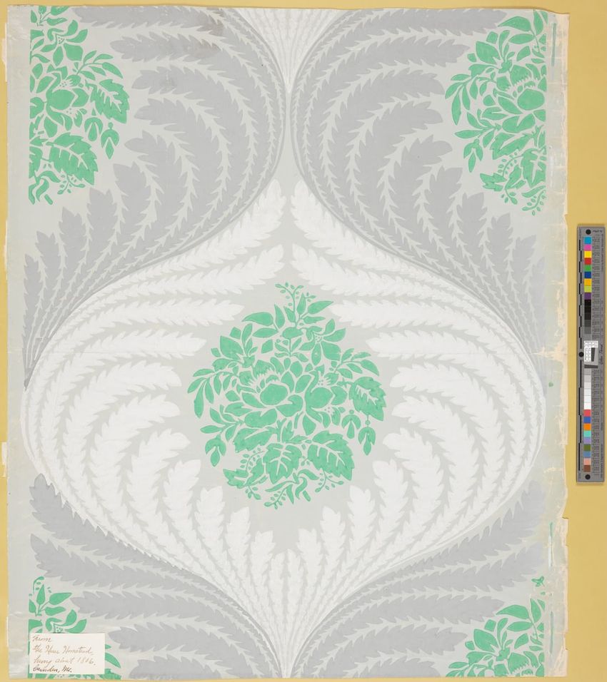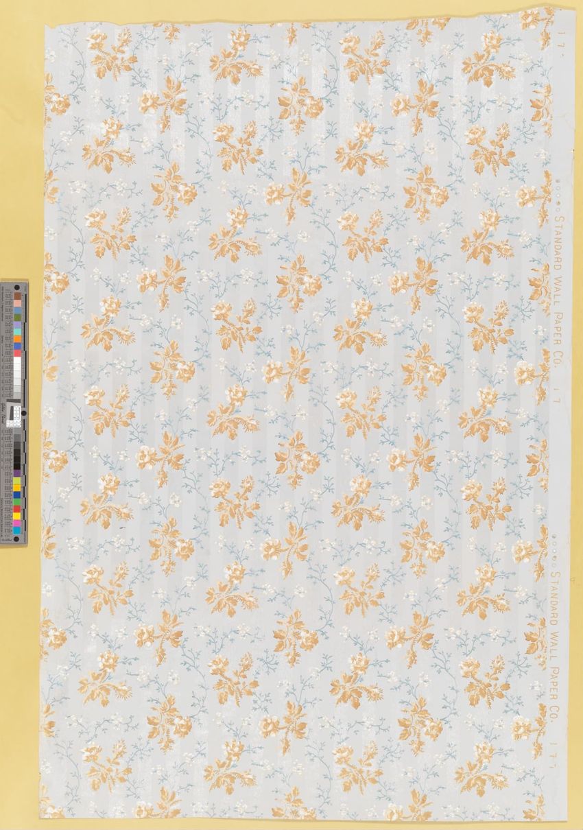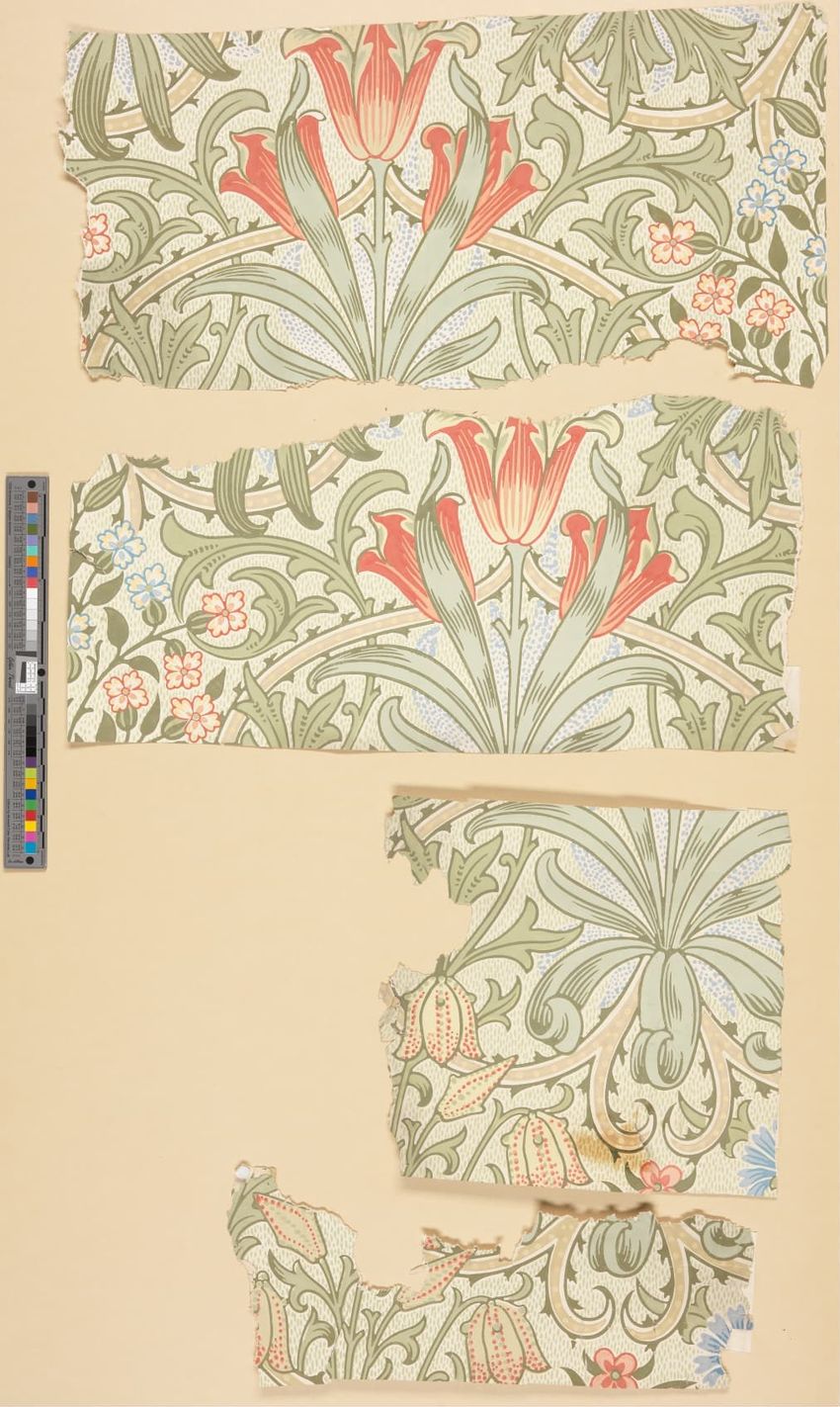 Partial roll. Large-scale, meandering, woody vine sprouting stylized blossoms. Printed in red, rose, pink, two lavenders, three greens, two blues, yellow, two browns, tan and white. Drop match.