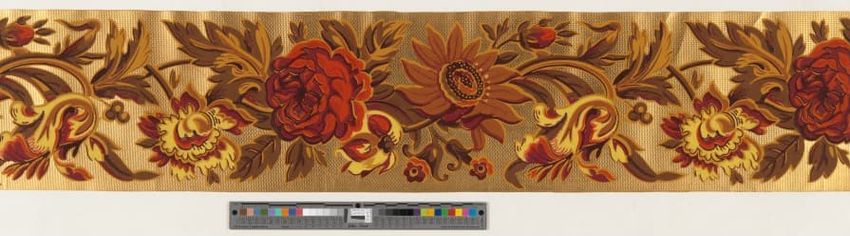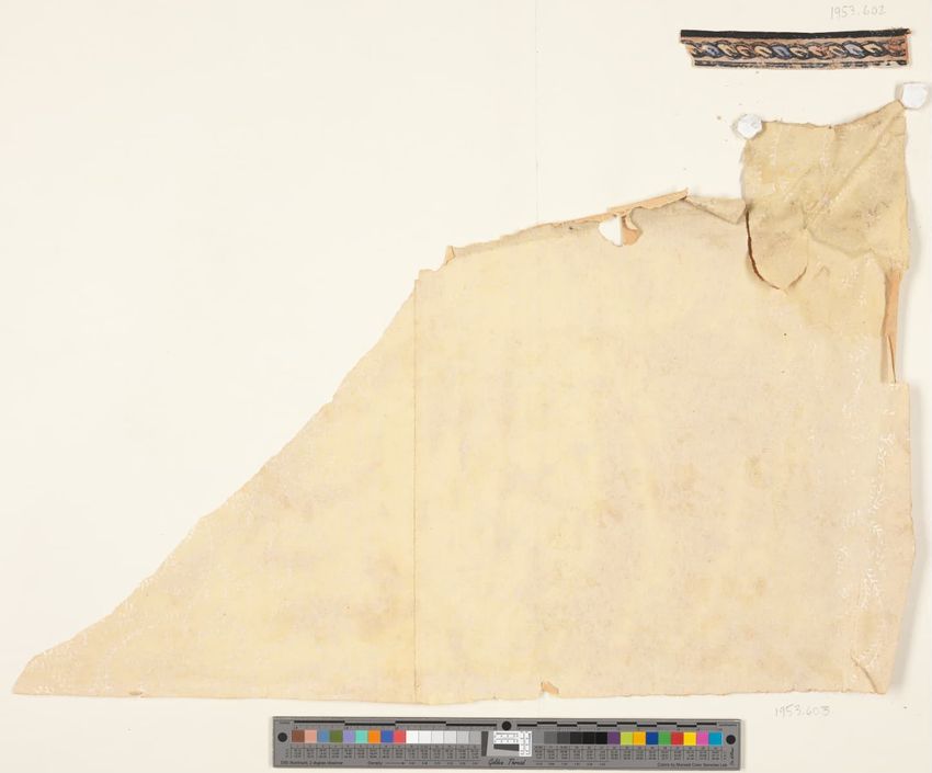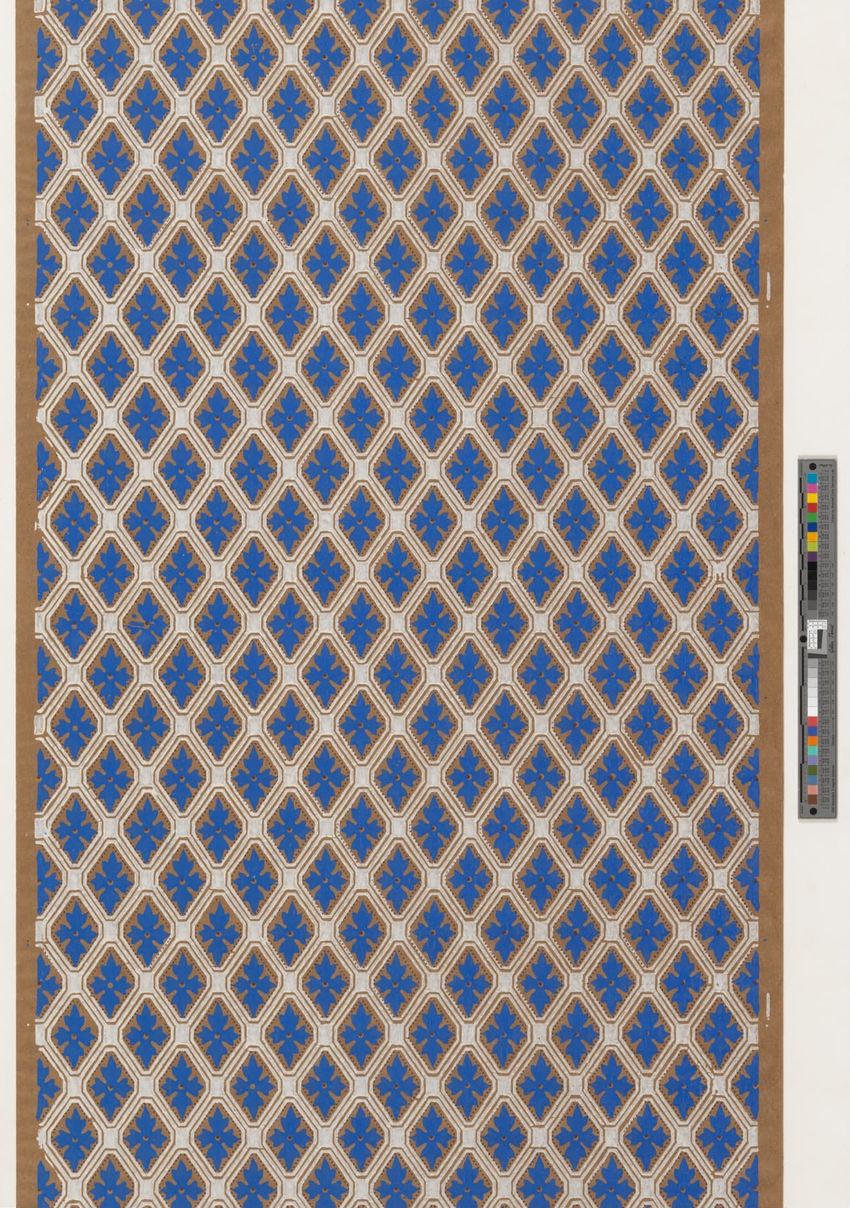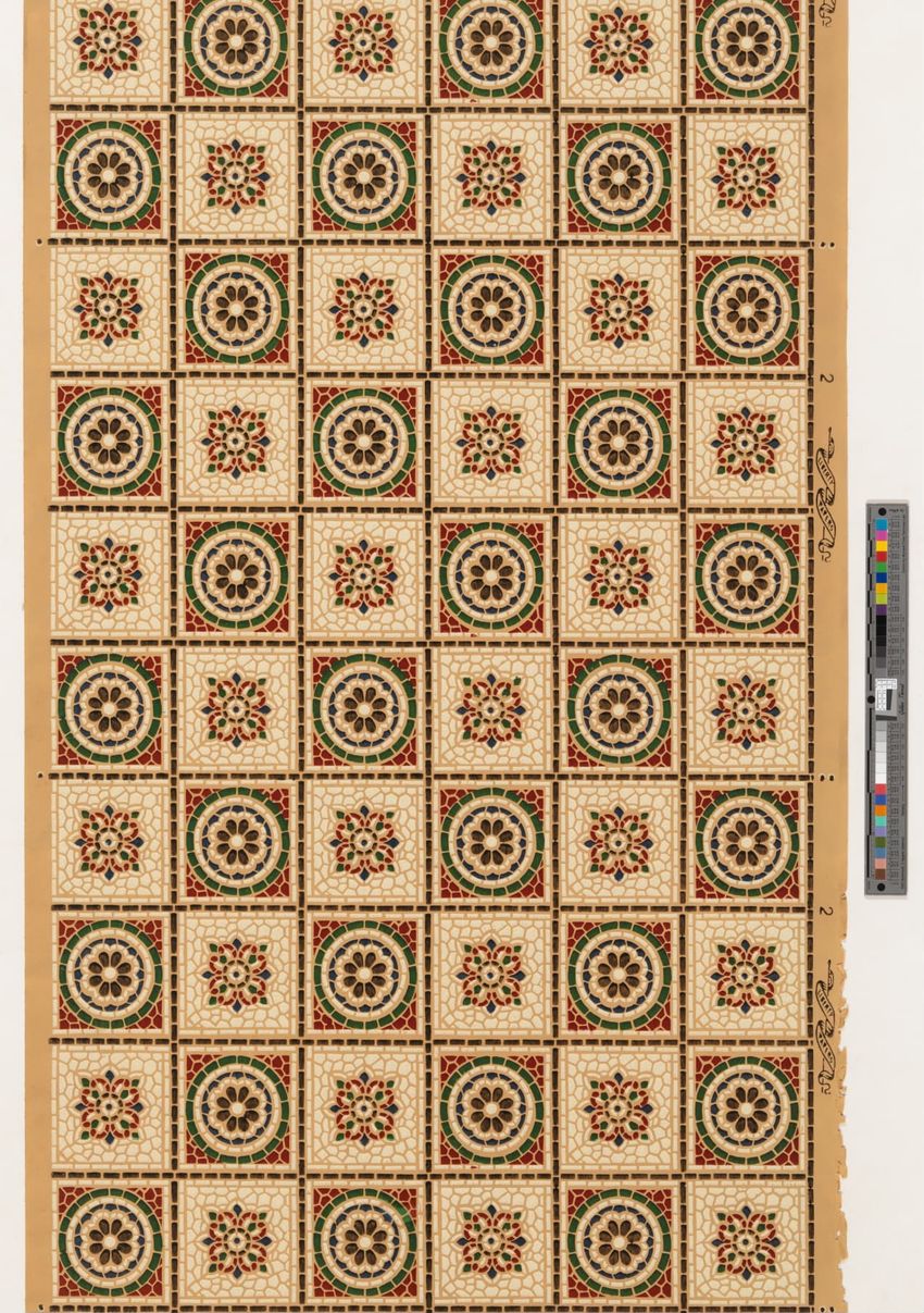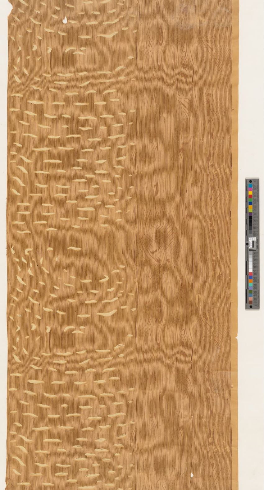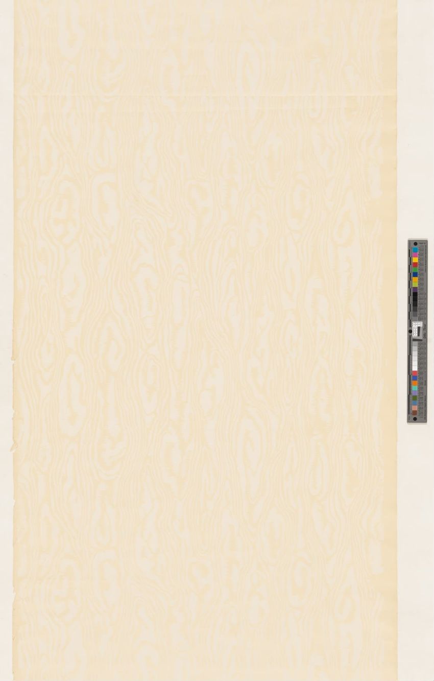 Wallpaper fragment. Scenery figure pattern with alternating scenes of bridges, water, sailboats, buildings. Scenes are framed by Rococo style cartouche with C-scrolls and foliage. In the background is an imitation marble pattern between the cartouches. Printed in three browns, blue, pink, white, gre...