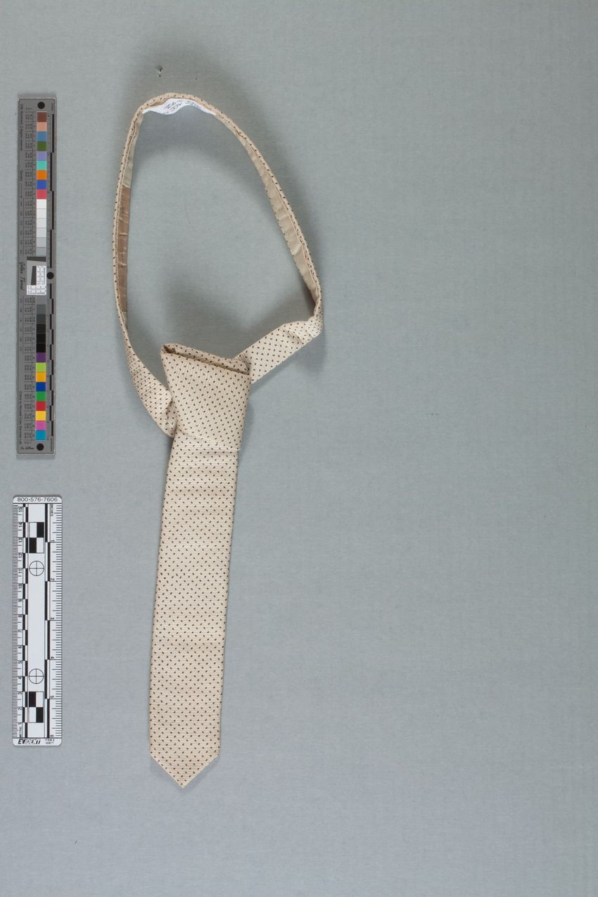 Cream ribbed silk printed with black dots arranged geometrically; four-in-hand knot sewn in place; metal tab in narrower end; narrow tie with pointed tip.