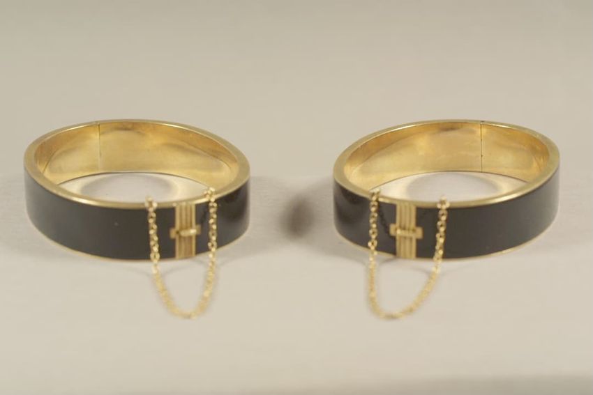 Jewelry set consisting of a pair of bracelets, earrings and brooch all featuring miniatures paintings on ivory set in gold and surrounded by a row of diamonds. One bracelet clasp miniature depicts Joseph Barrell and his wife Sarah and daughter Hannah standing under the word "Enjoyment," the other d...