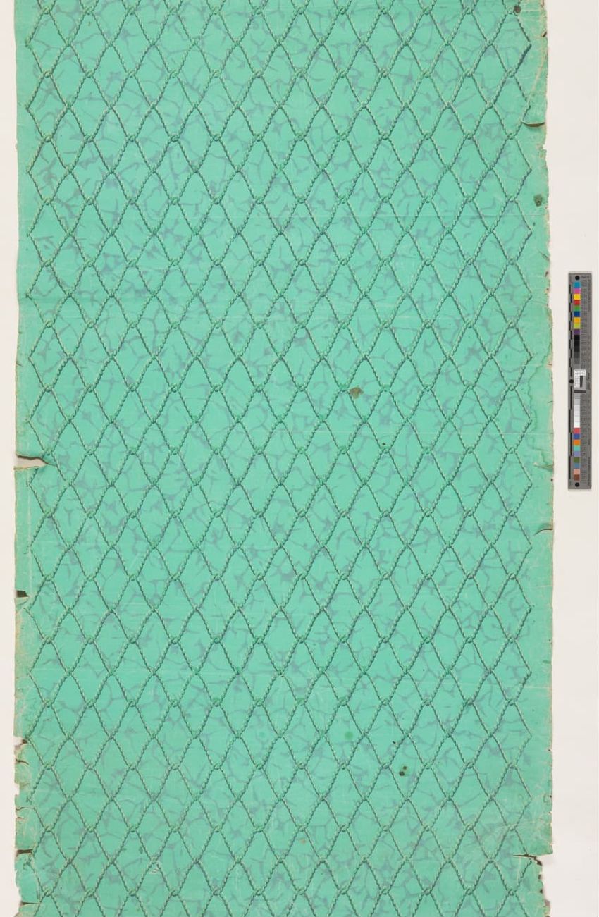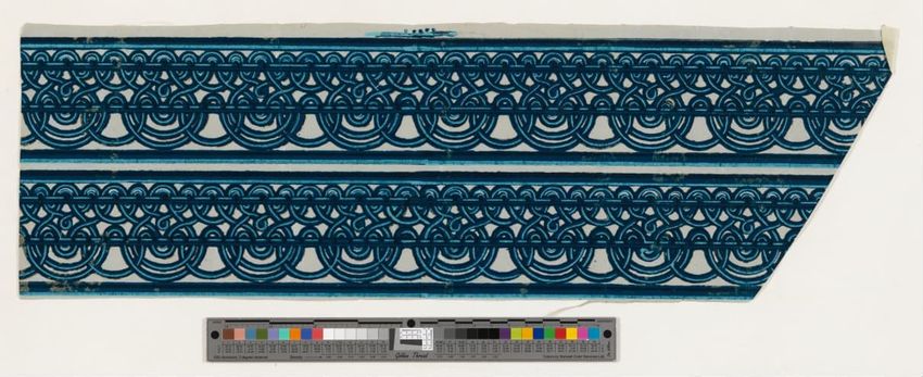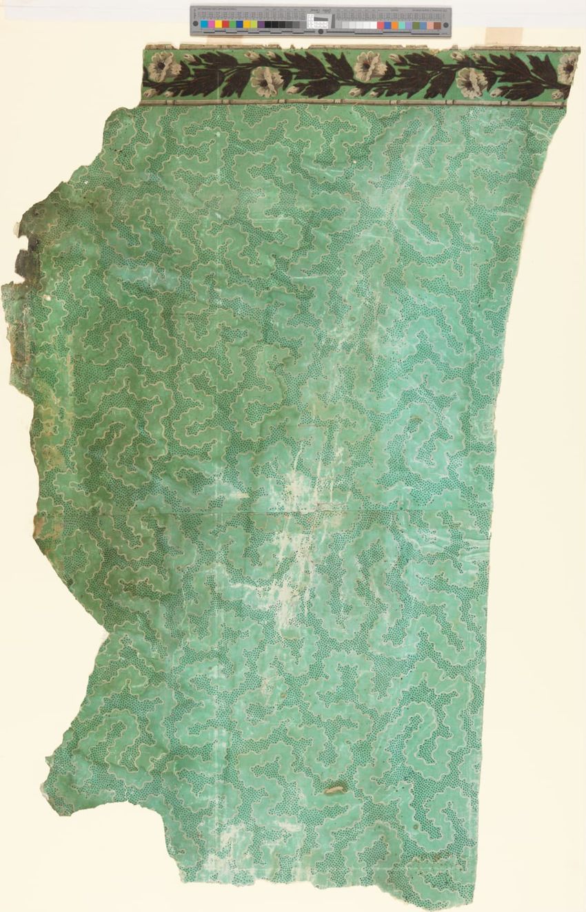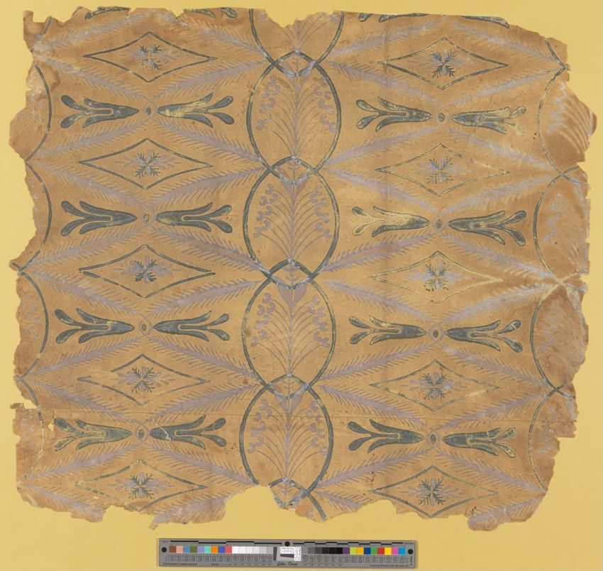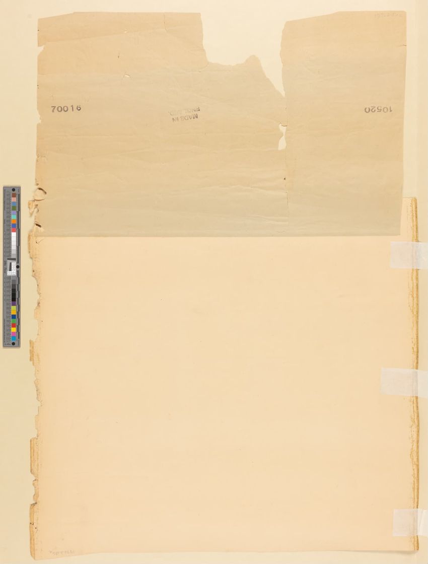 Writing set including three red-orange pieces of sealing wax, two black pieces of sealing wax, two metal wells with copper tops (one well with lid, one well with perforated top), one wood pencil with metal fasteners. Five metal quill tips, and a menagerie of colored circles of dried ink. All housed ...