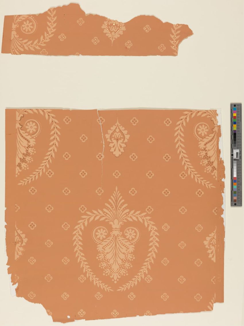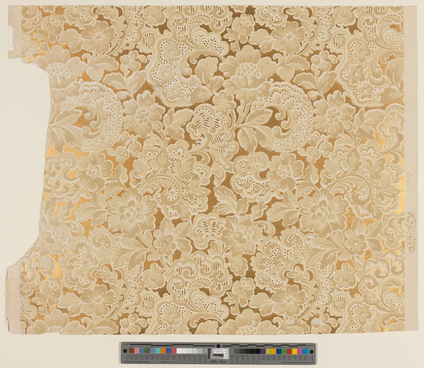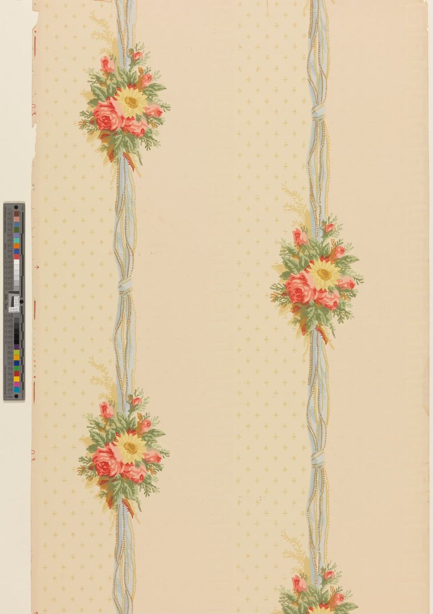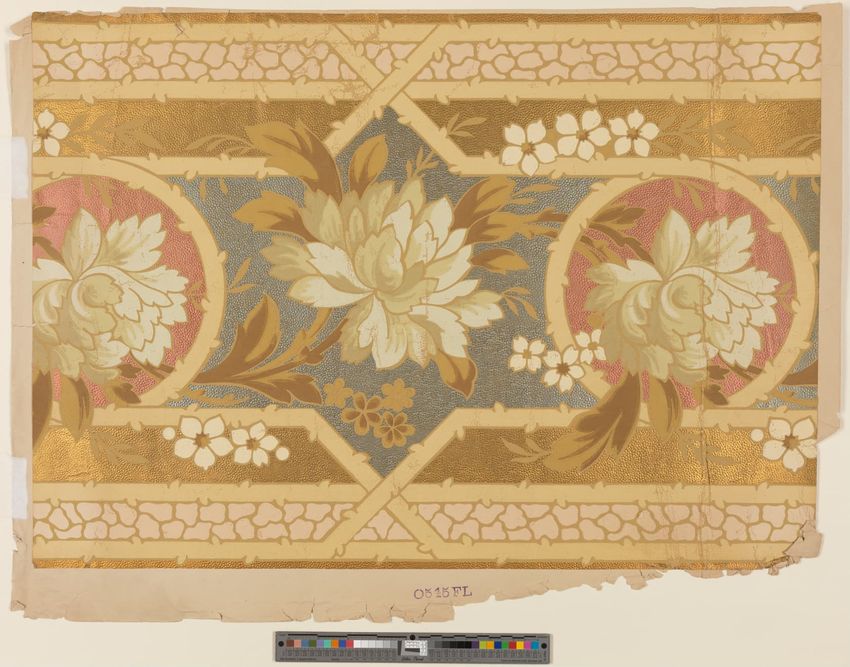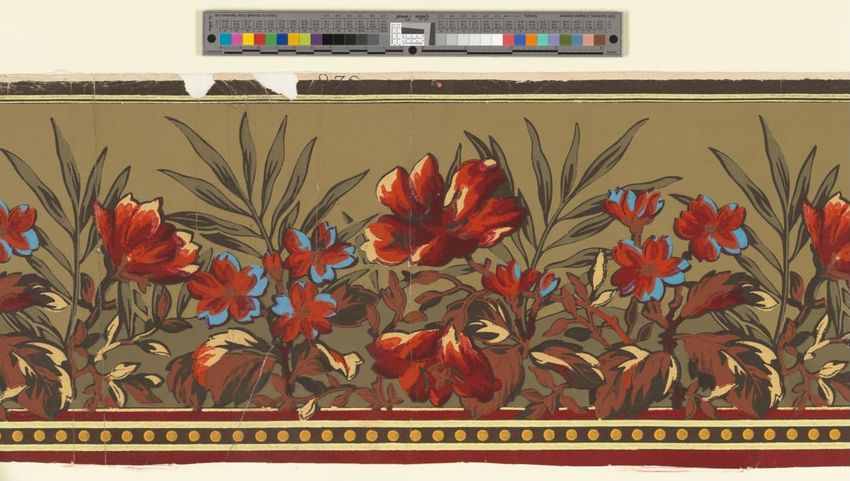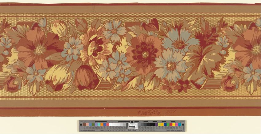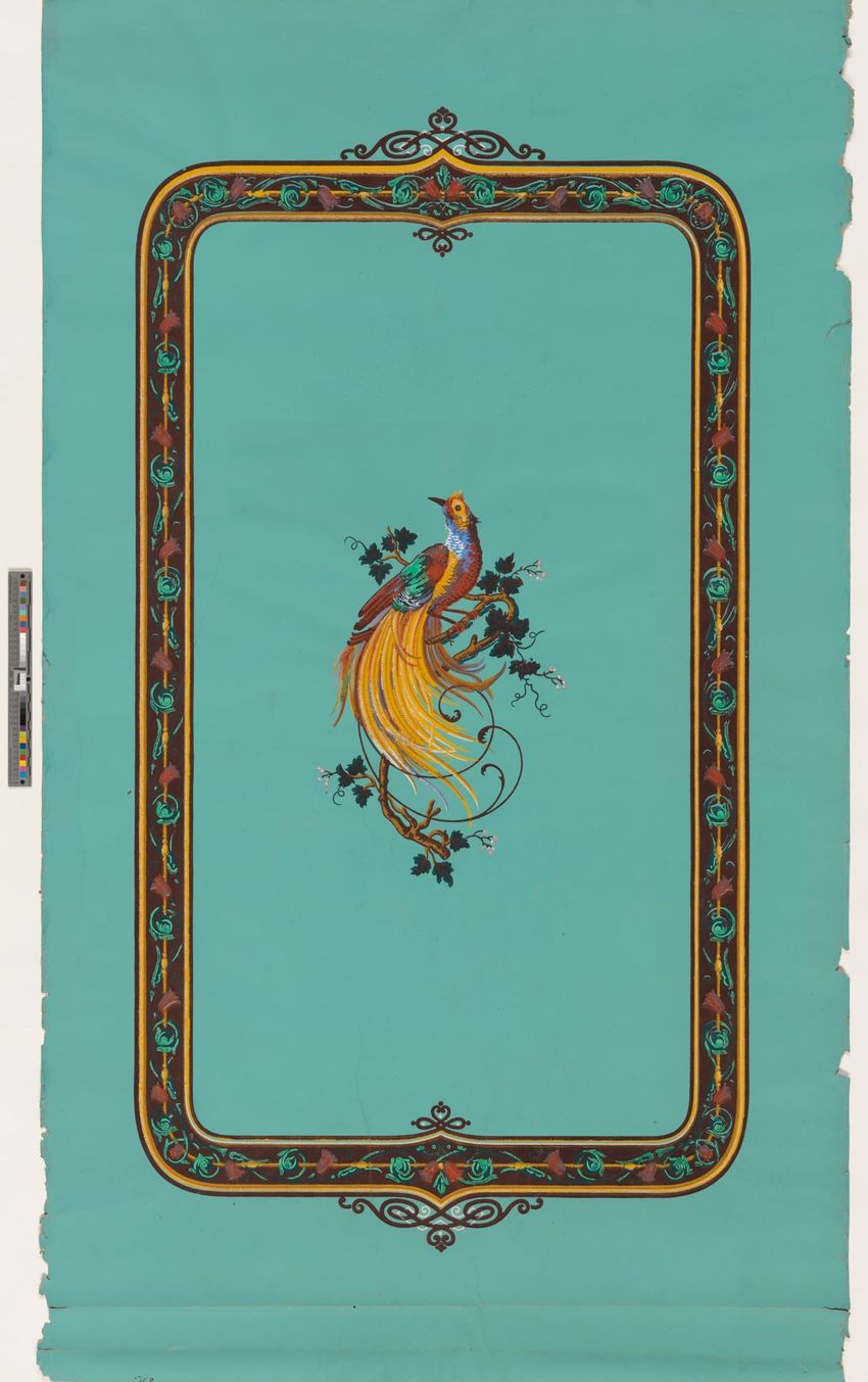 Paper window shade. Exotic and colorful bird is perched on a branch. "Bird of Paradise." Framed by a border of flowers and scrolling foliage. Interlacing detail on the top and bottom of frame. Printed in yellow, purple, red, burgundy, blue, grey, white, brown, caramel on a teal ground. Reverse side ...
