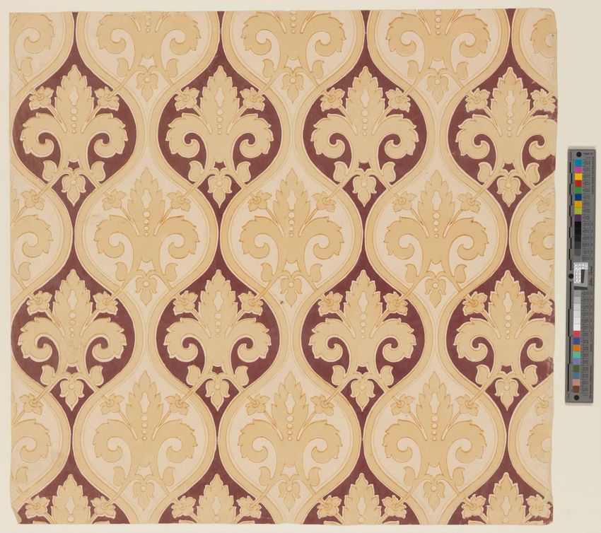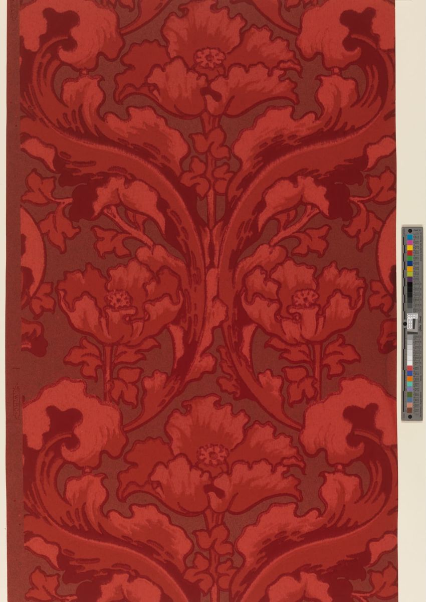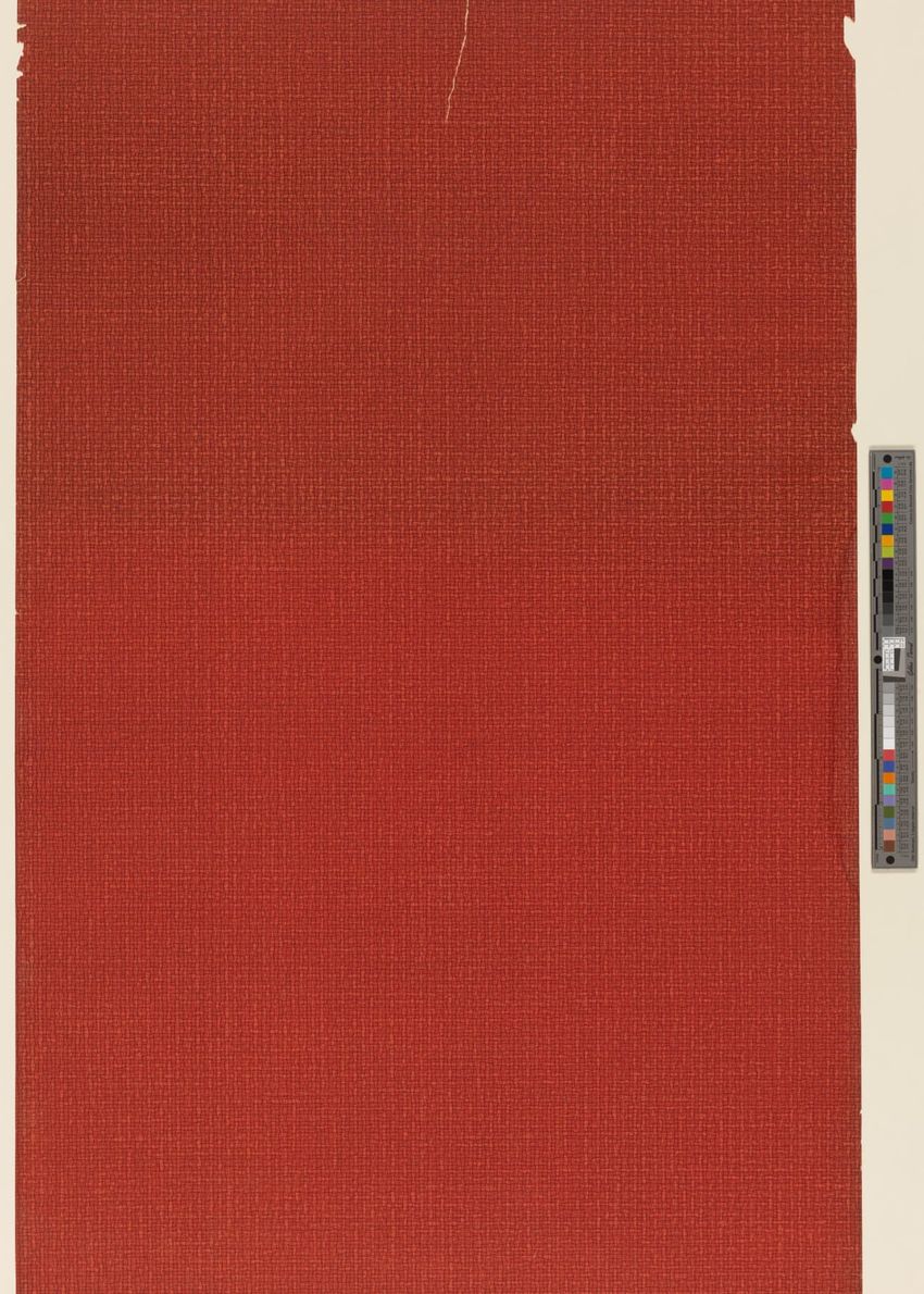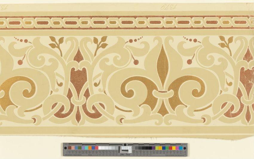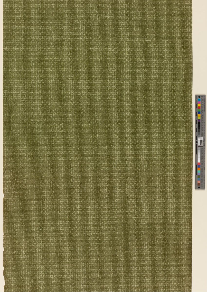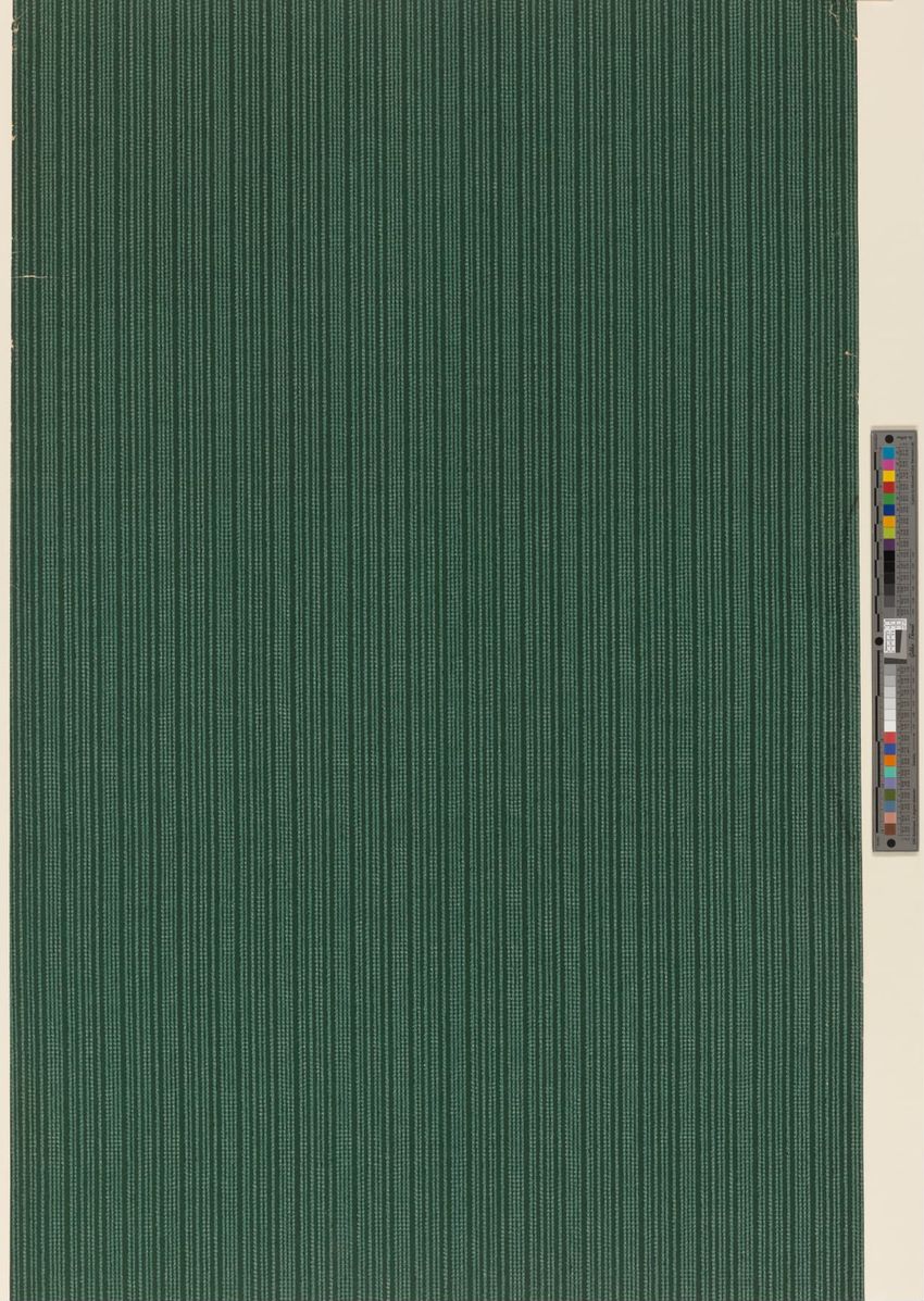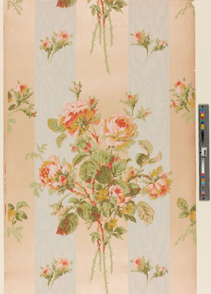 Paper window shade. Exotic and colorful bird is perched on a branch. "Bird of Paradise." Framed by a border of flowers and scrolling foliage. Interlacing detail on the top and bottom of frame. Printed in yellow, purple, red, burgundy, blue, grey, white, brown, caramel on a teal ground. Reverse side ...