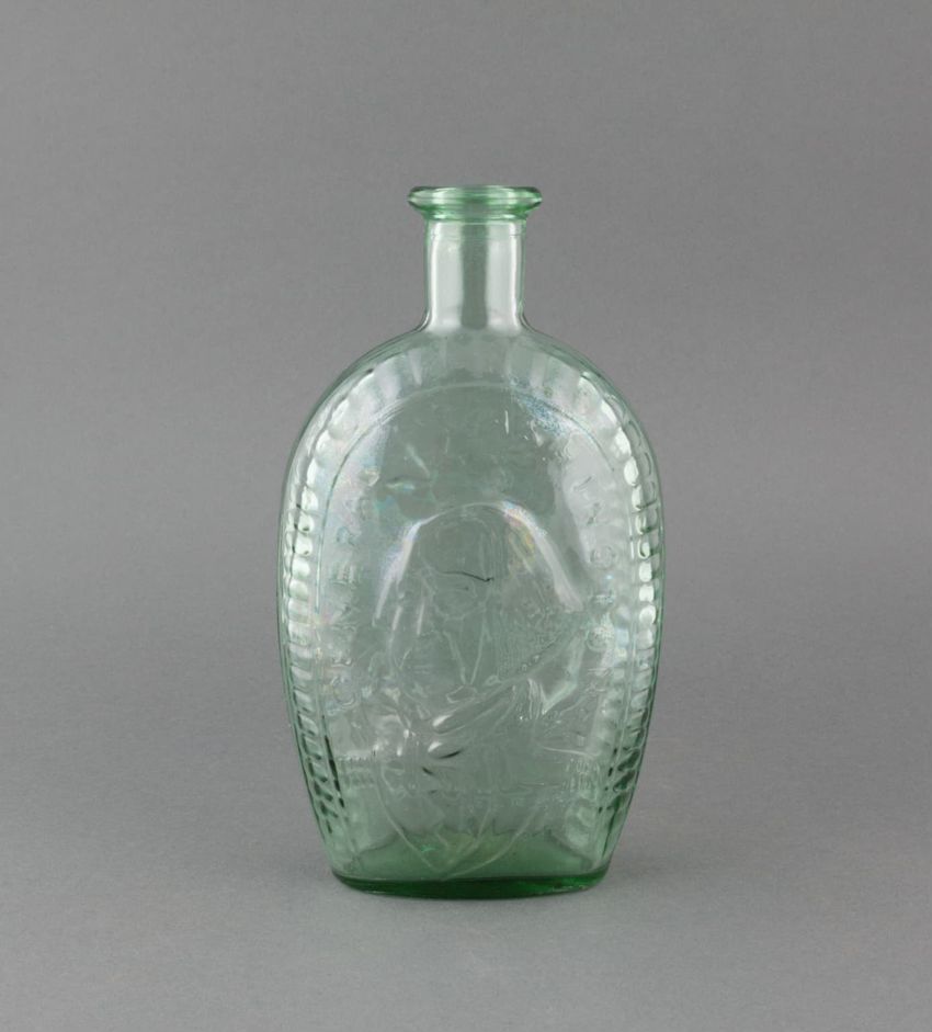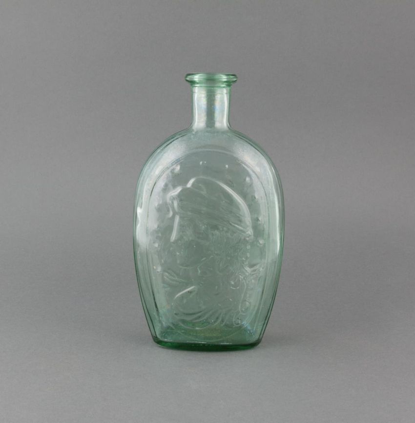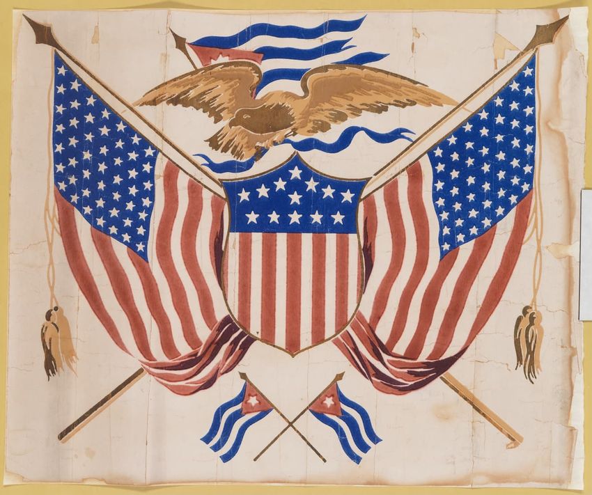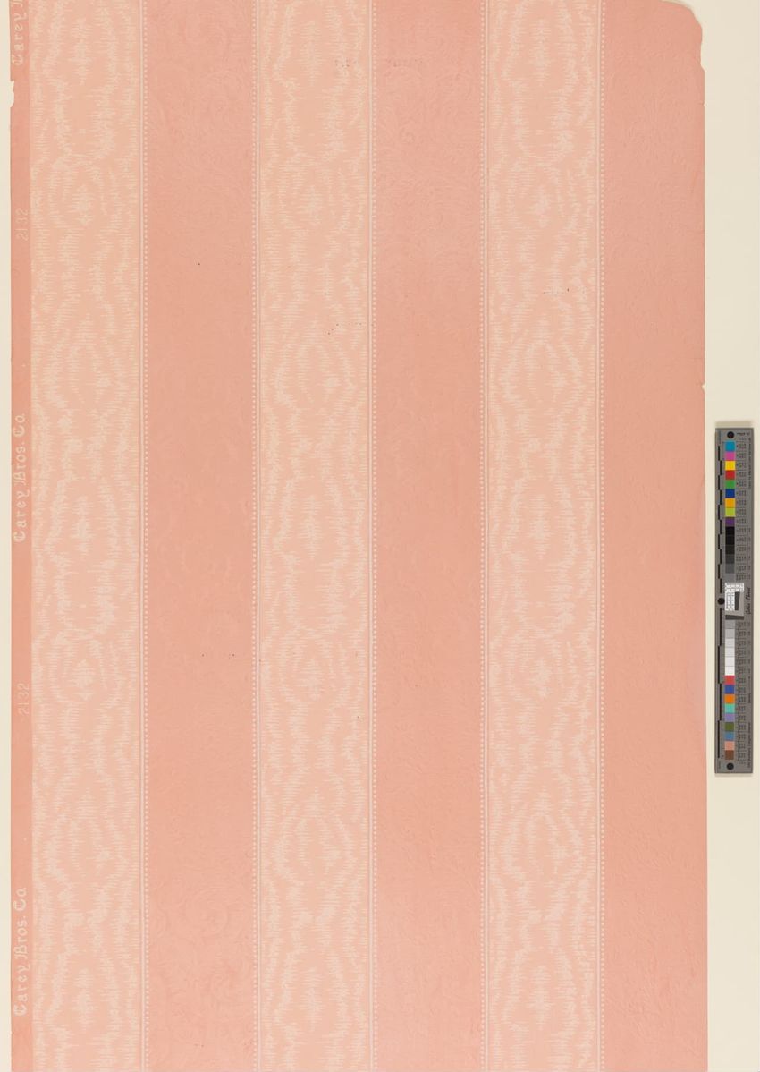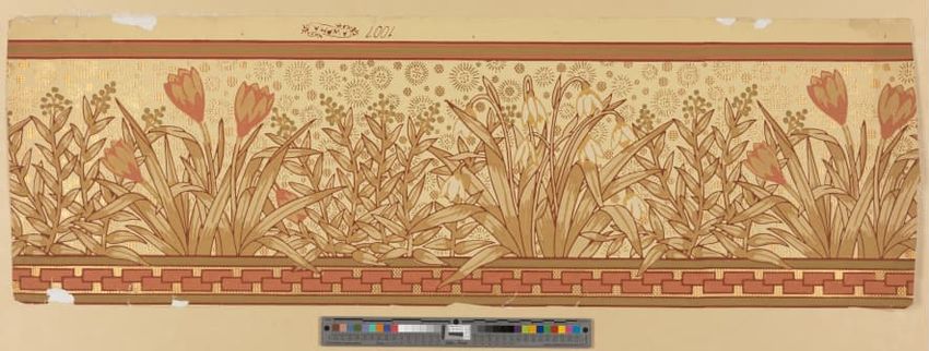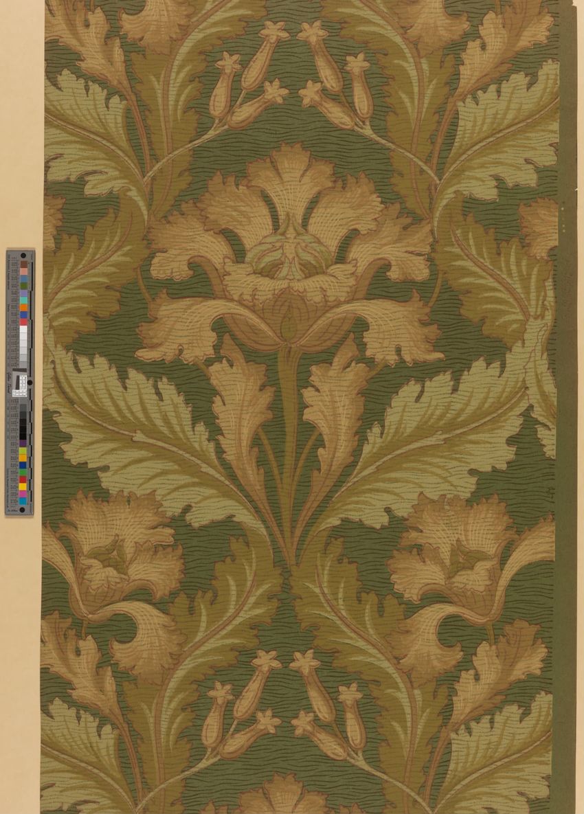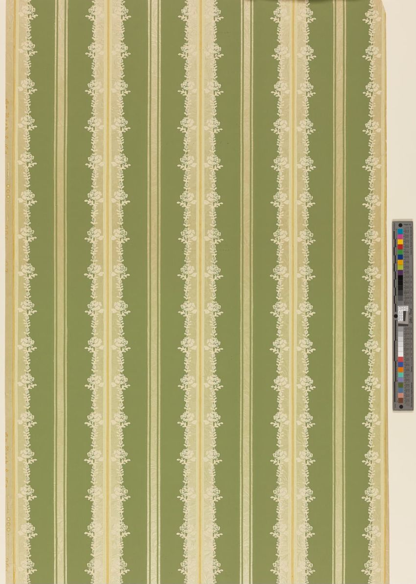 Paper window shade. Exotic and colorful bird is perched on a branch. "Bird of Paradise." Framed by a border of flowers and scrolling foliage. Interlacing detail on the top and bottom of frame. Printed in yellow, purple, red, burgundy, blue, grey, white, brown, caramel on a teal ground. Reverse side ...