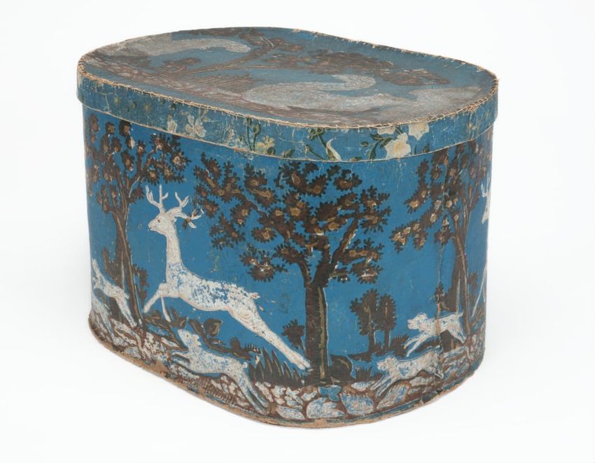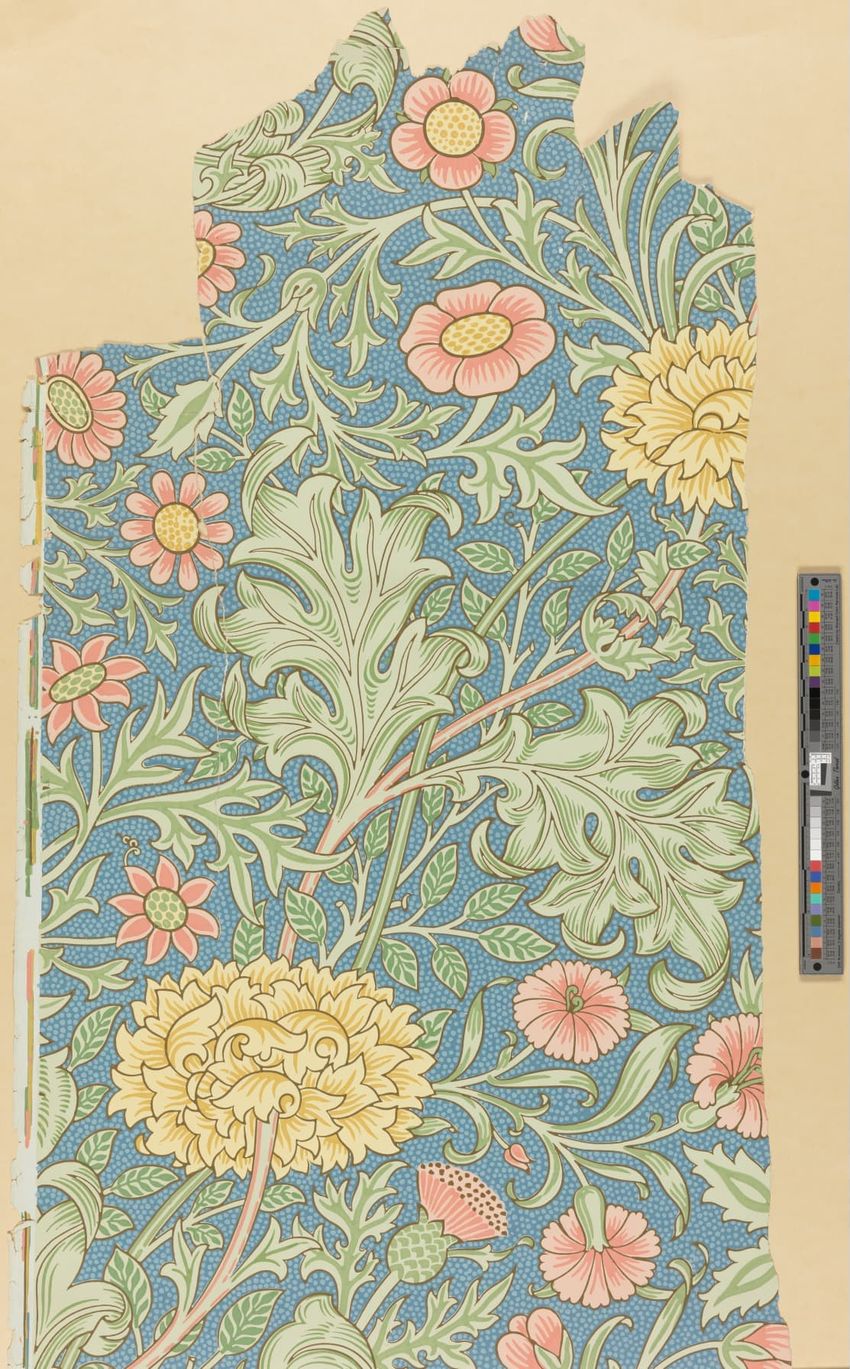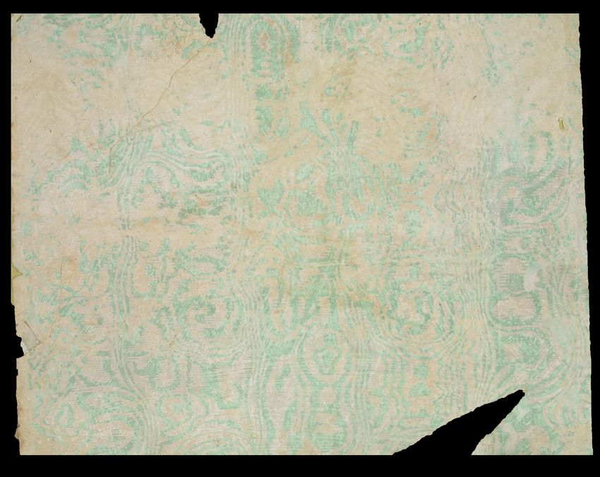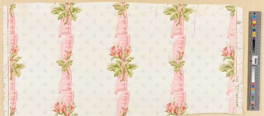 Unused sample. An imitation of 18th-century, French, silk brocade with a large bouquet of flowers, lacy ribbons, and bowknots. Printed in two greens, two browns, tan, rose, ochre and gilt on a dark blue ground. Straight match.