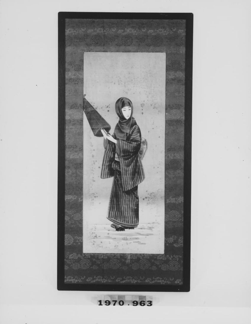 Armchair. Rattan wicker, maple, tufted chintz upholstery. Woven back in diamond pattern with arched crest; wicker braid applied to stiles and half arms; wooden seat frame; red-pattered rep tufted seat cushion covered with polished cotton chintz; woven arched front, side, and back skirts. Rests o...