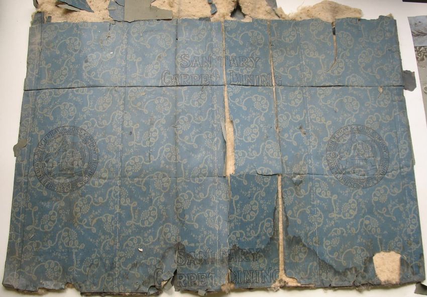 Fragments of embossed leather paper. Scrolling foliate design with exotic flowers, fruit, bird and dragon. Metallic green, yellow, and orange on bronze ground. Two fragments [.1 and .2] removed from behind wall sconces still retain original colors. Remaining fragments are in various stages of fading...