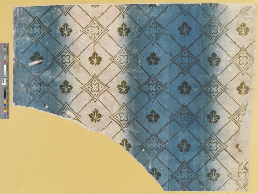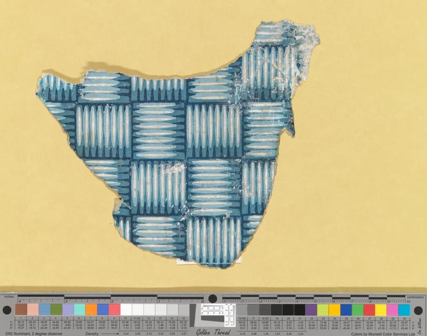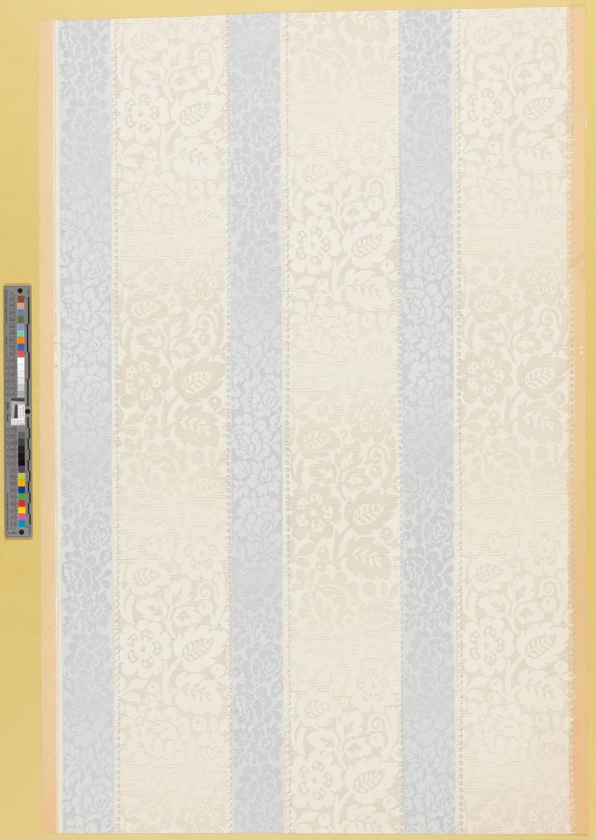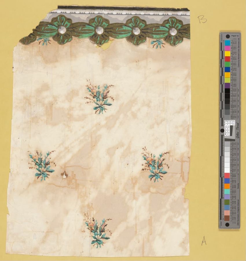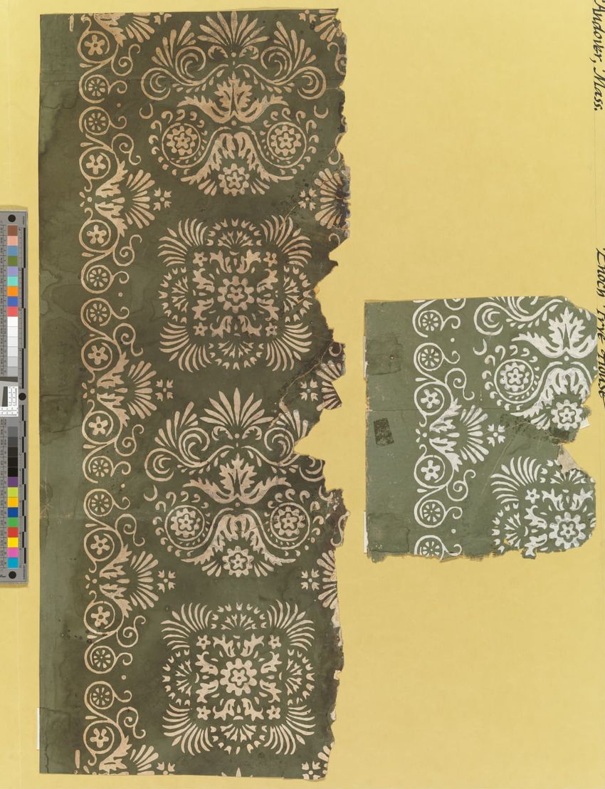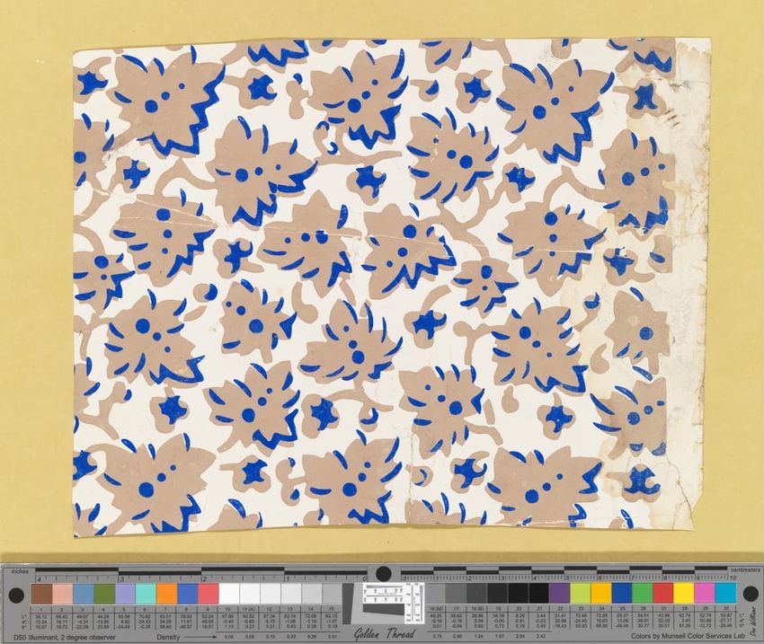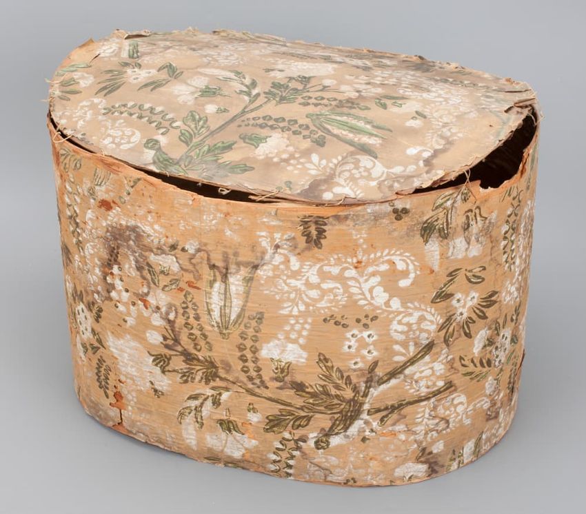 Oval bandbox (A) with lid (B). Dense pattern featuring bright colored flowers on a background of amoeba-like bushes. Blockprinted in olive green, three pinks, black, chartreuse, and yellow on blue ground.