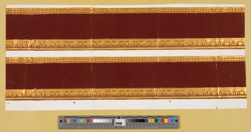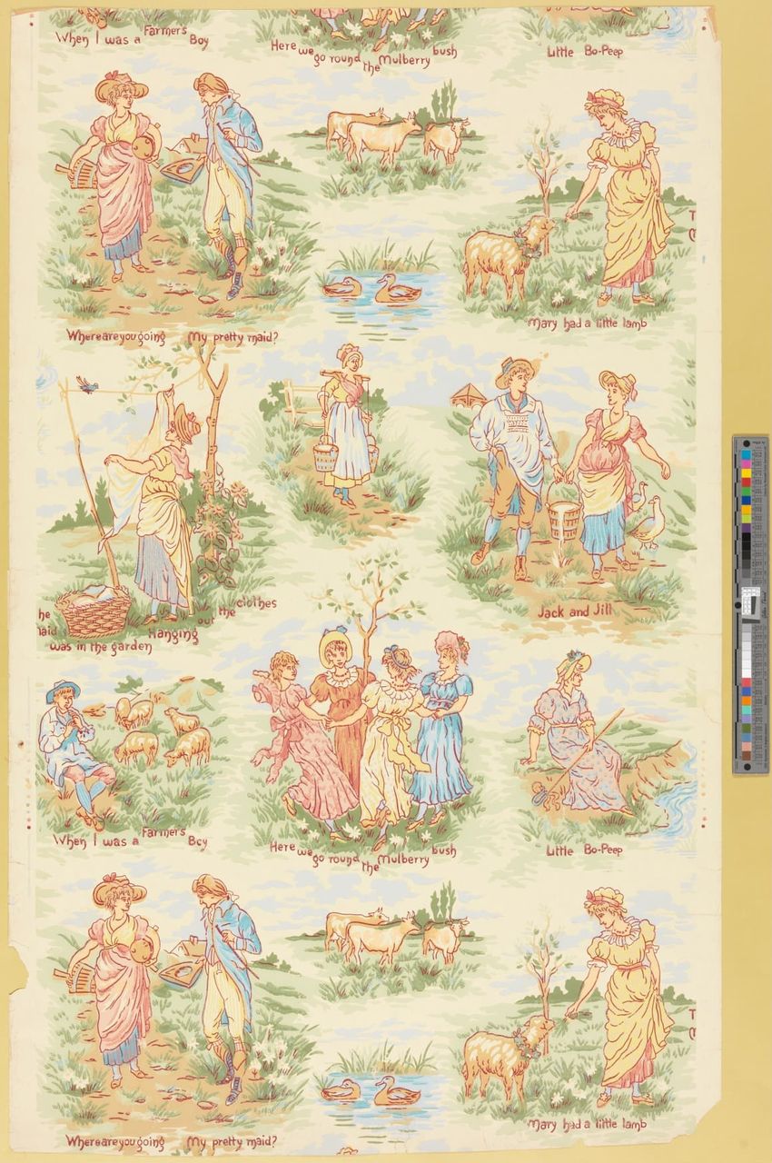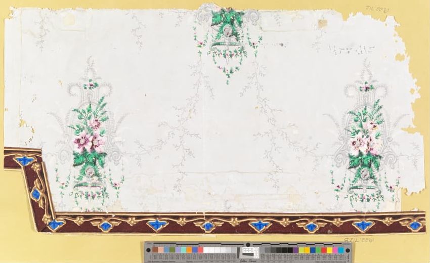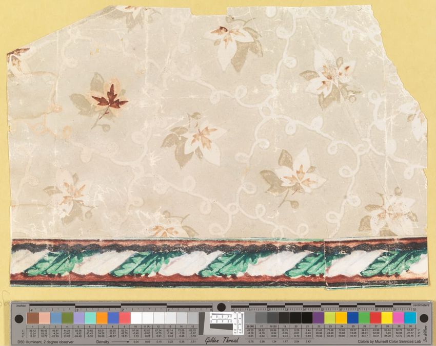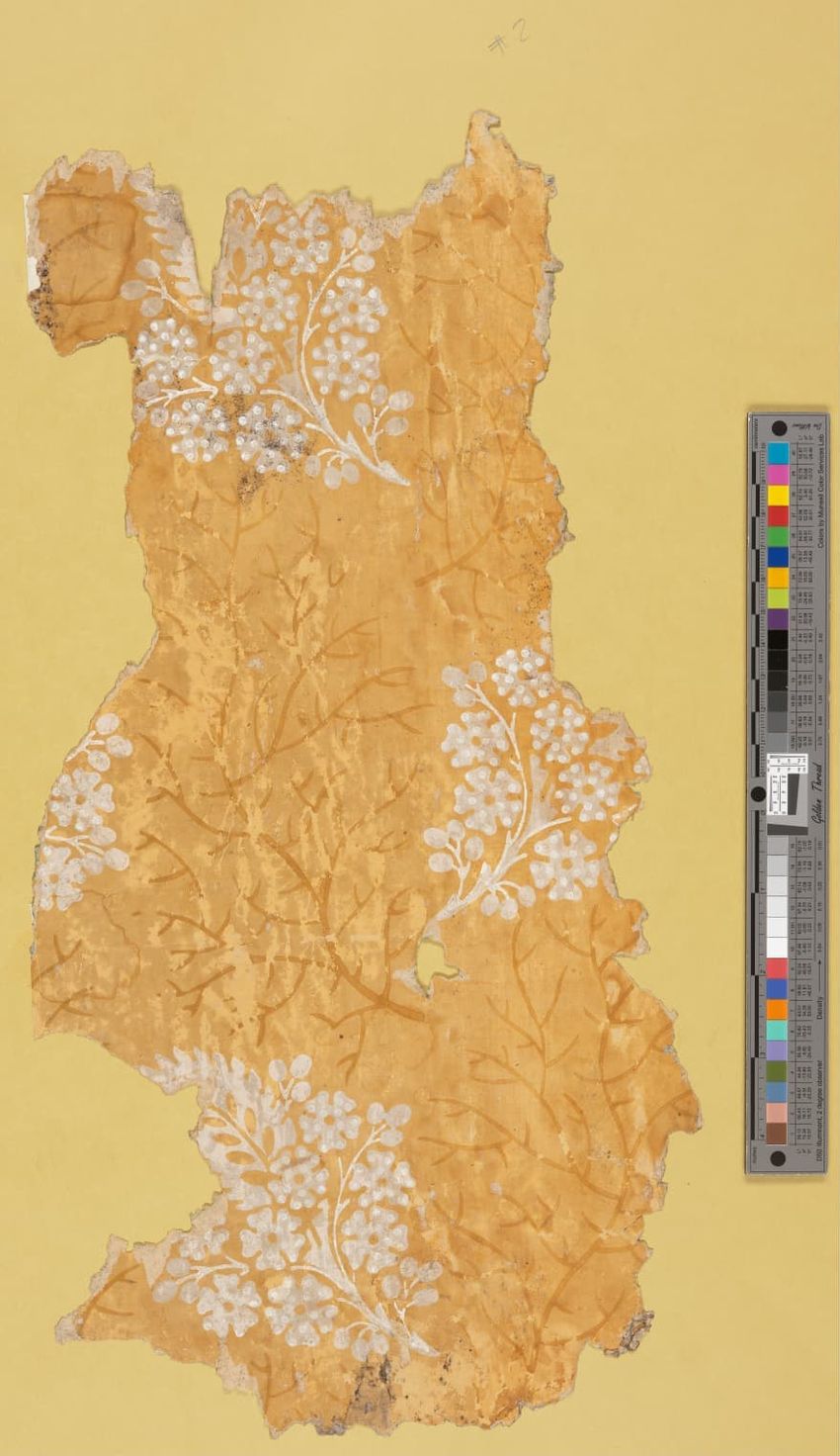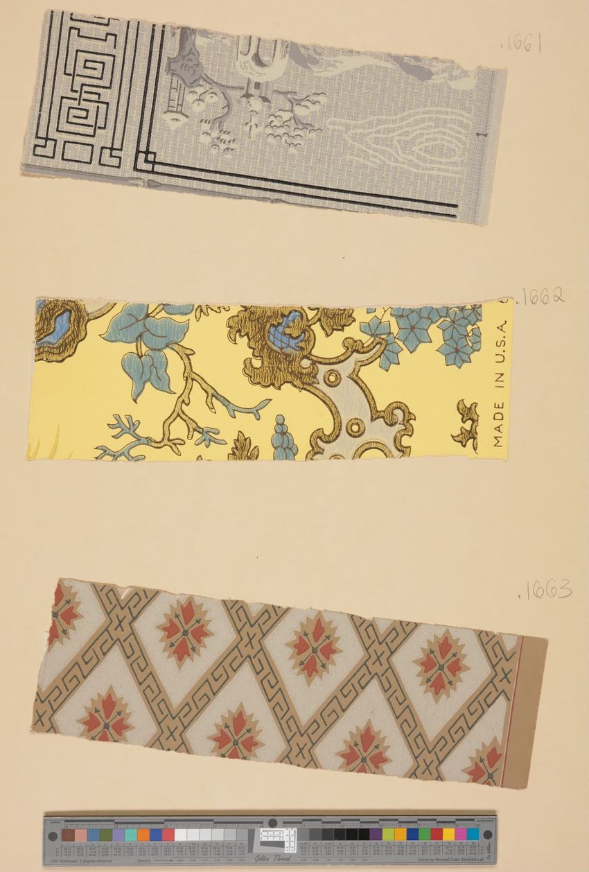 Oval bandbox (A) with lid (B). Dense pattern featuring bright colored flowers on a background of amoeba-like bushes. Blockprinted in olive green, three pinks, black, chartreuse, and yellow on blue ground.