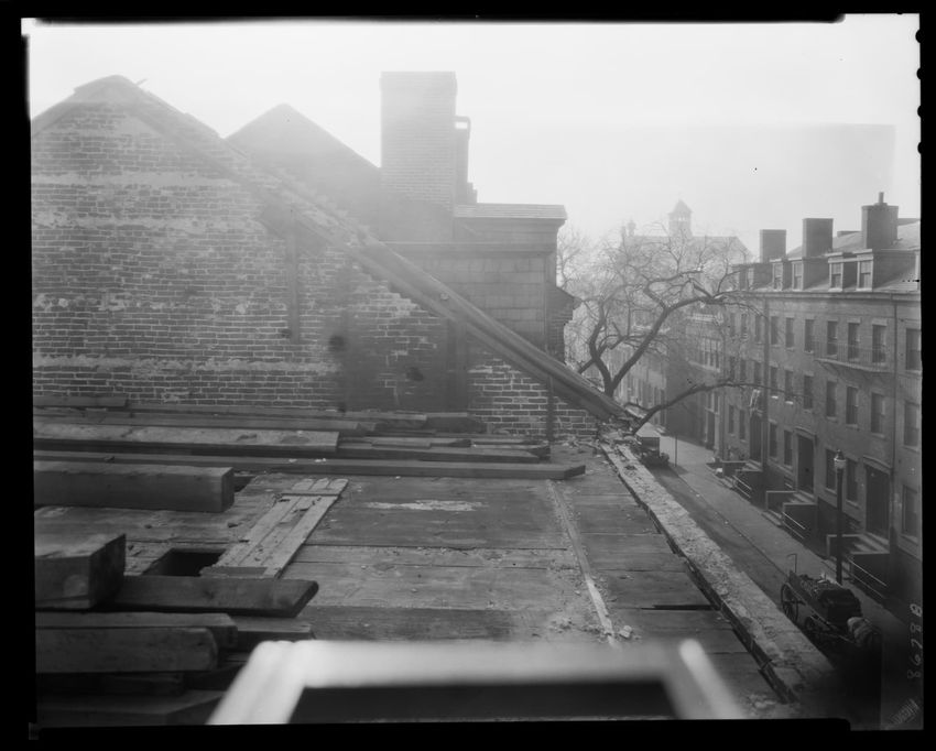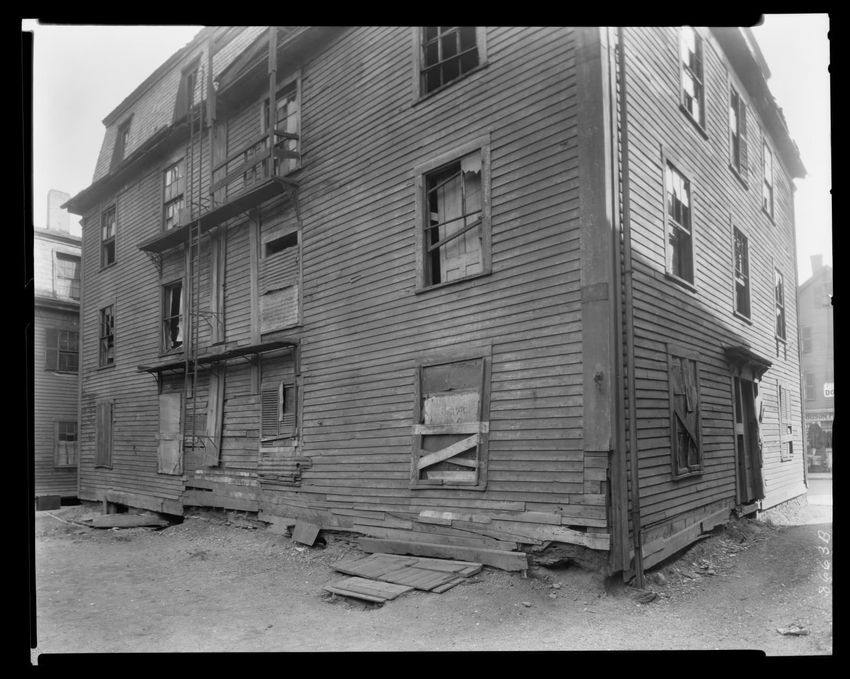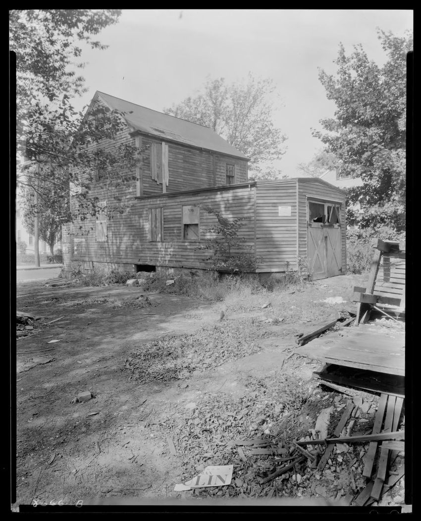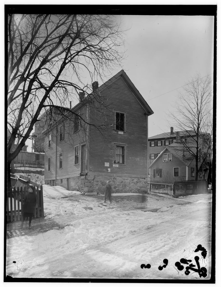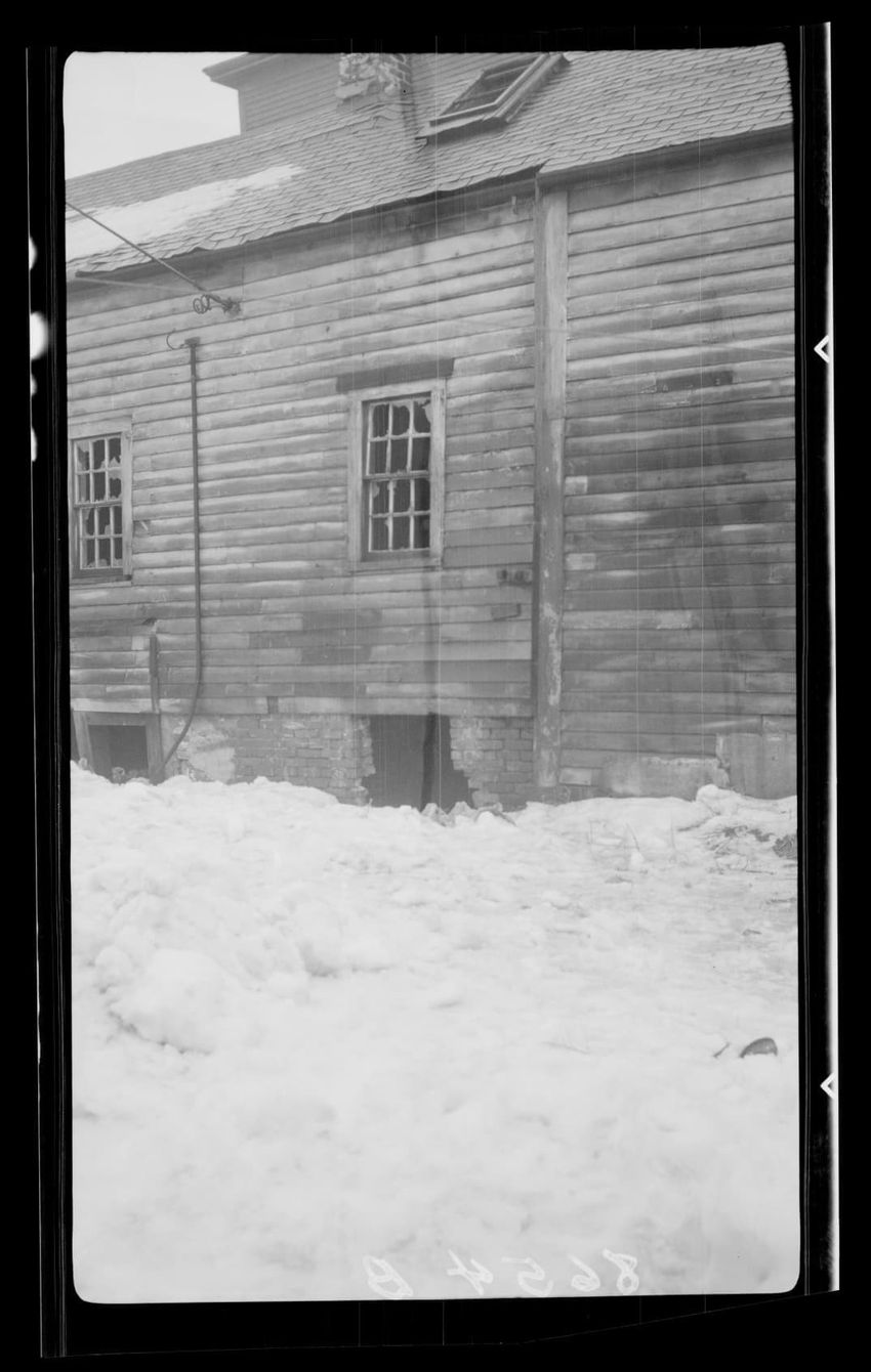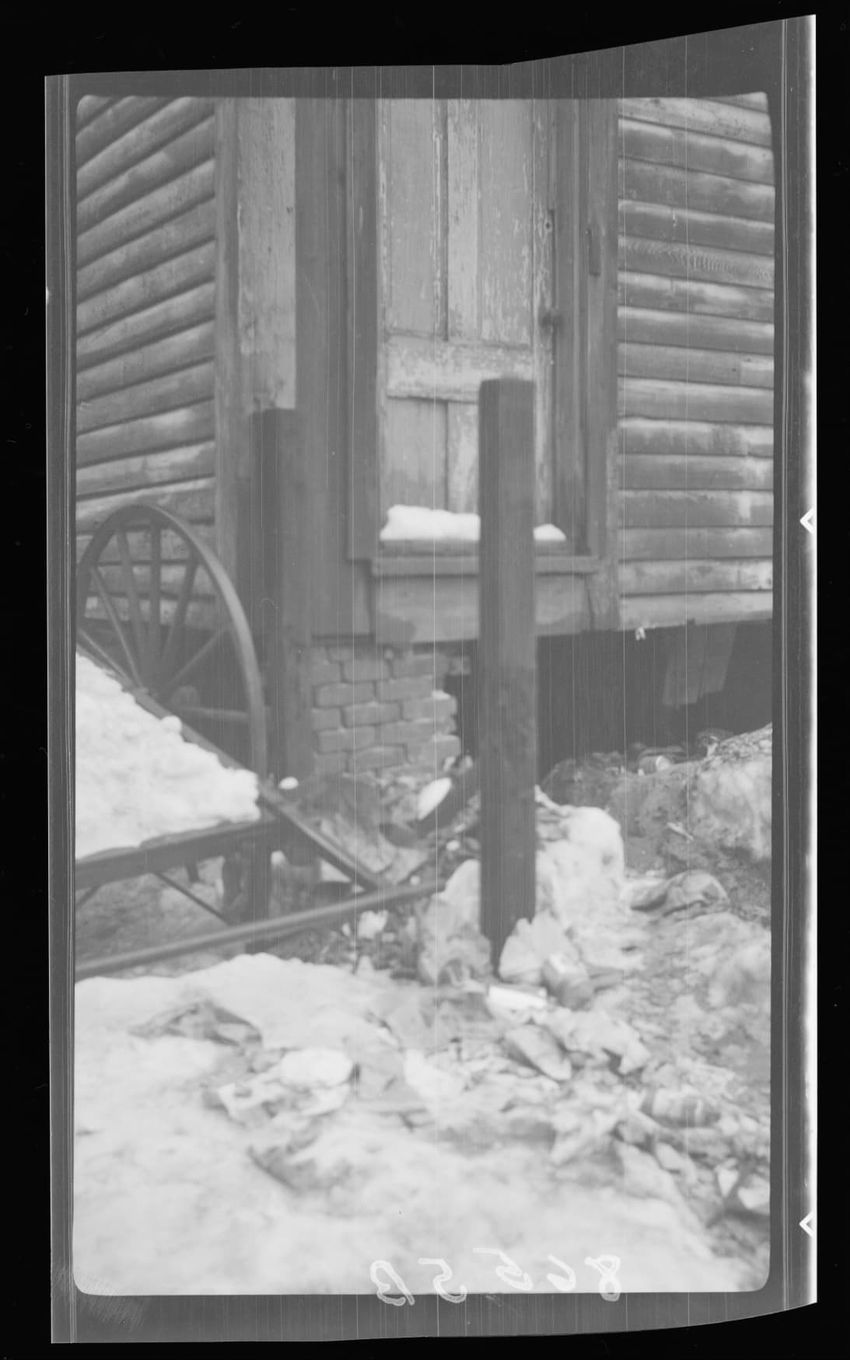 The image depicts the side exterior of a house located at 11 Lincoln Place, Brighton, Boston, Massachusetts. It shows a wooden door with visible wear, part of the house's siding, and a wagon wheel leaning against the structure. Snow is present on the ground and on surfaces, with scattered debris and...