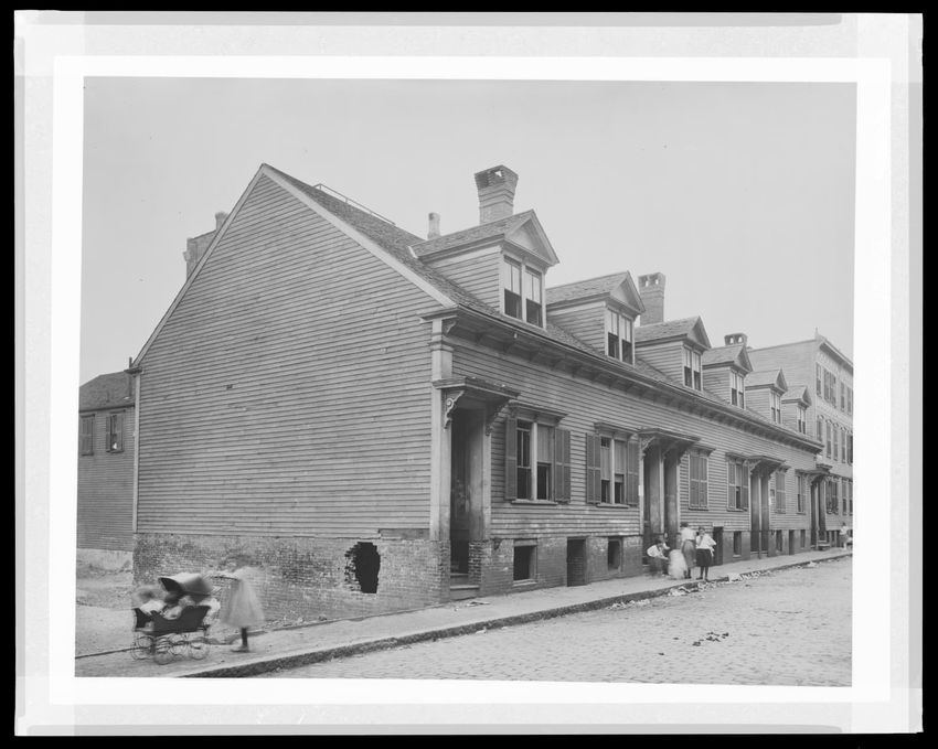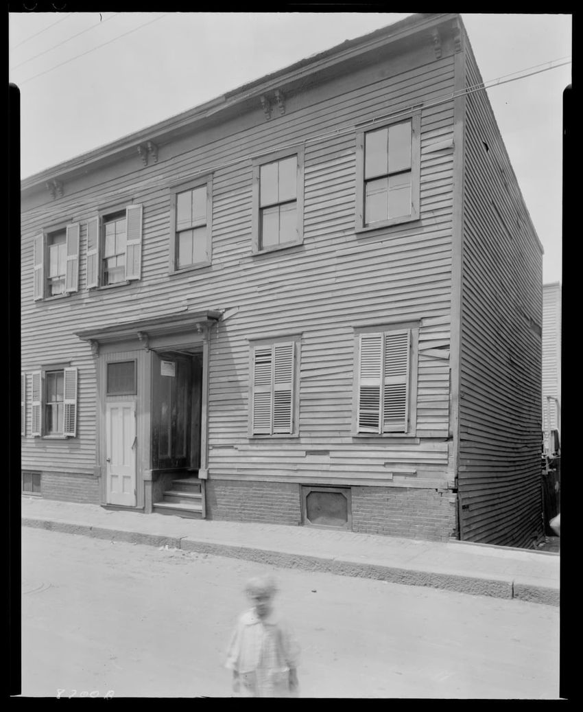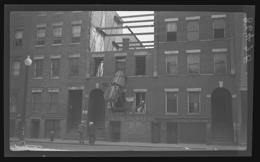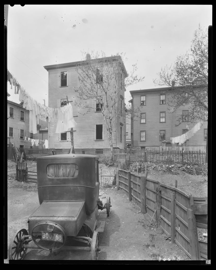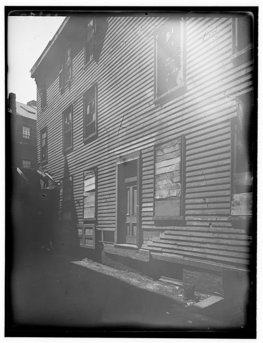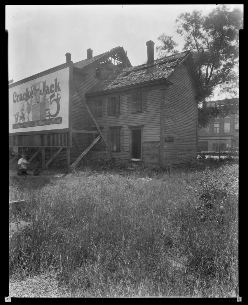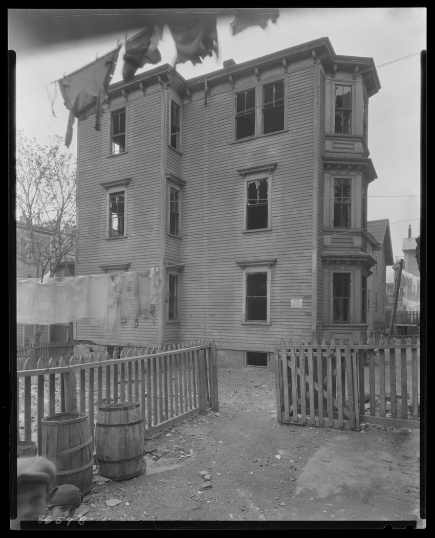 The image depicts the side exterior of a house located at 11 Lincoln Place, Brighton, Boston, Massachusetts. It shows a wooden door with visible wear, part of the house's siding, and a wagon wheel leaning against the structure. Snow is present on the ground and on surfaces, with scattered debris and...