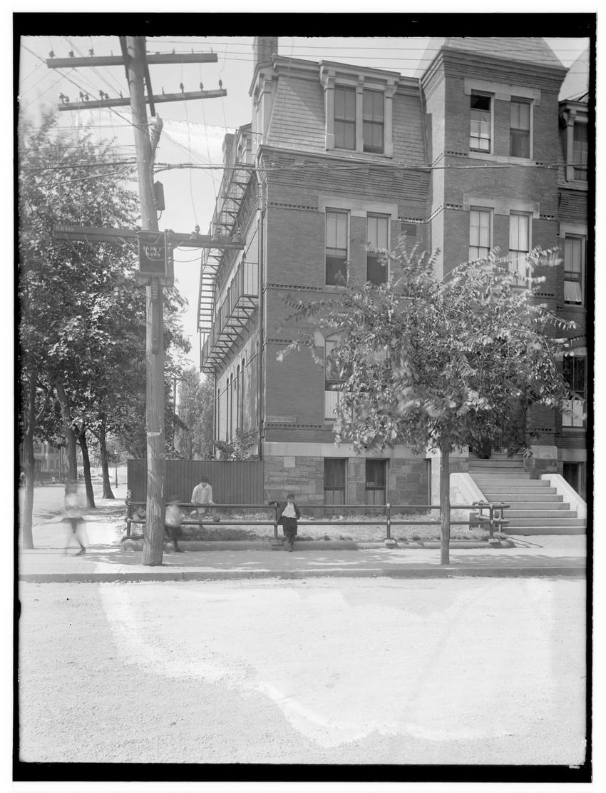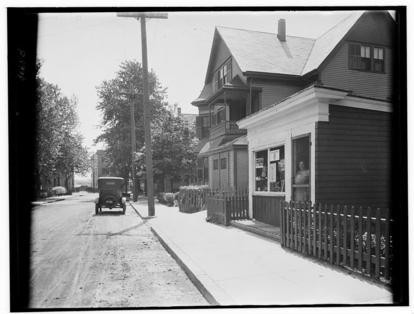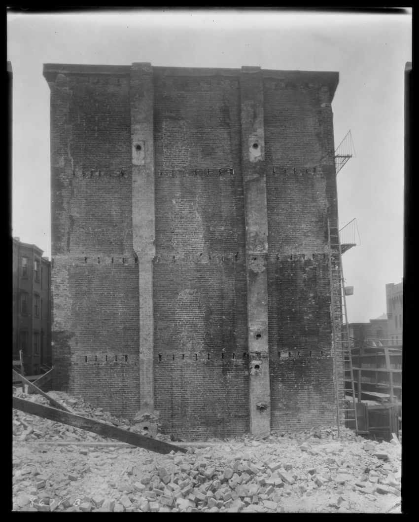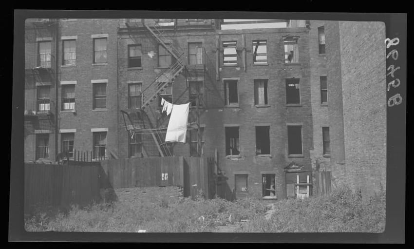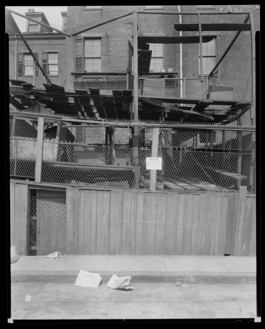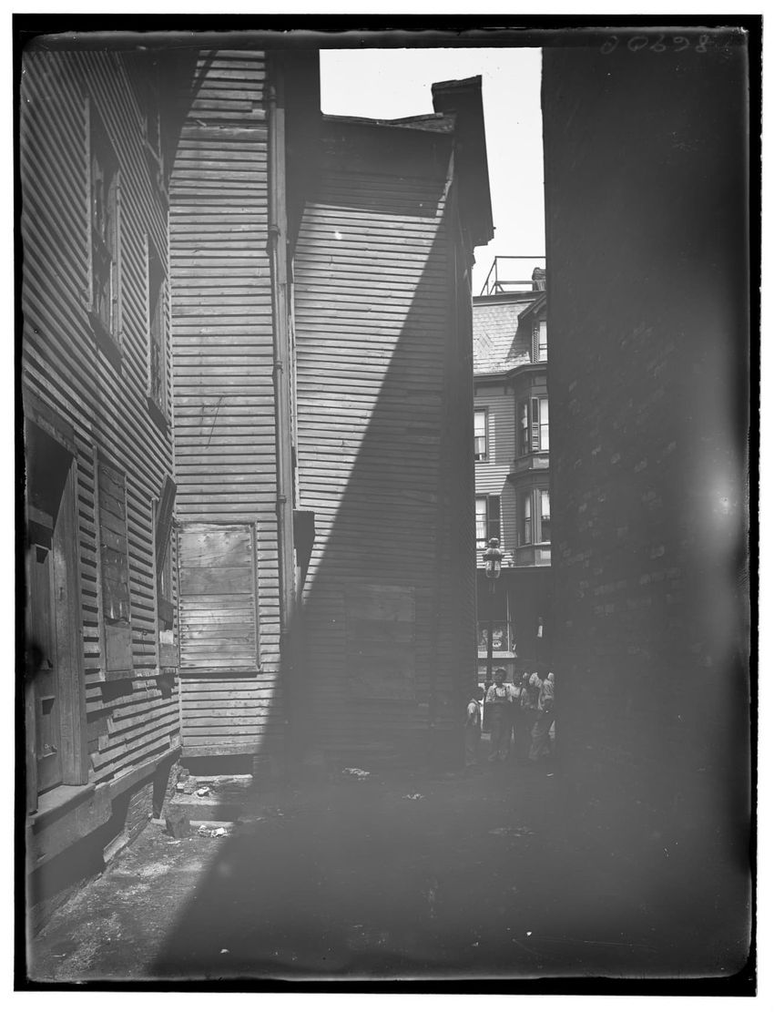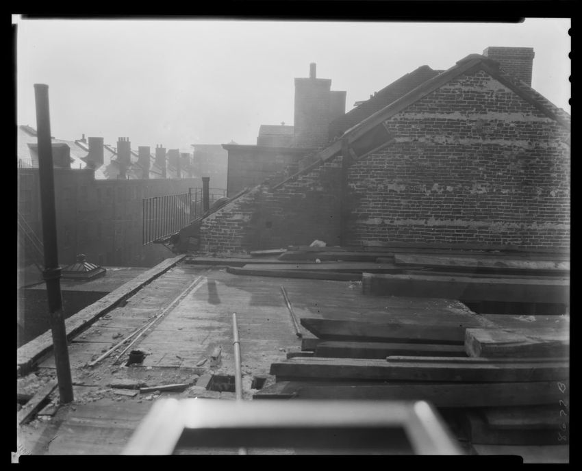 The image depicts the side exterior of a house located at 11 Lincoln Place, Brighton, Boston, Massachusetts. It shows a wooden door with visible wear, part of the house's siding, and a wagon wheel leaning against the structure. Snow is present on the ground and on surfaces, with scattered debris and...