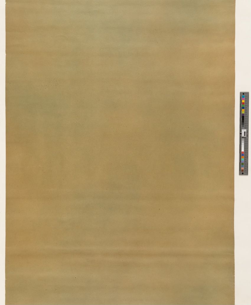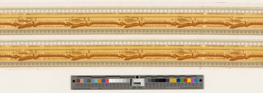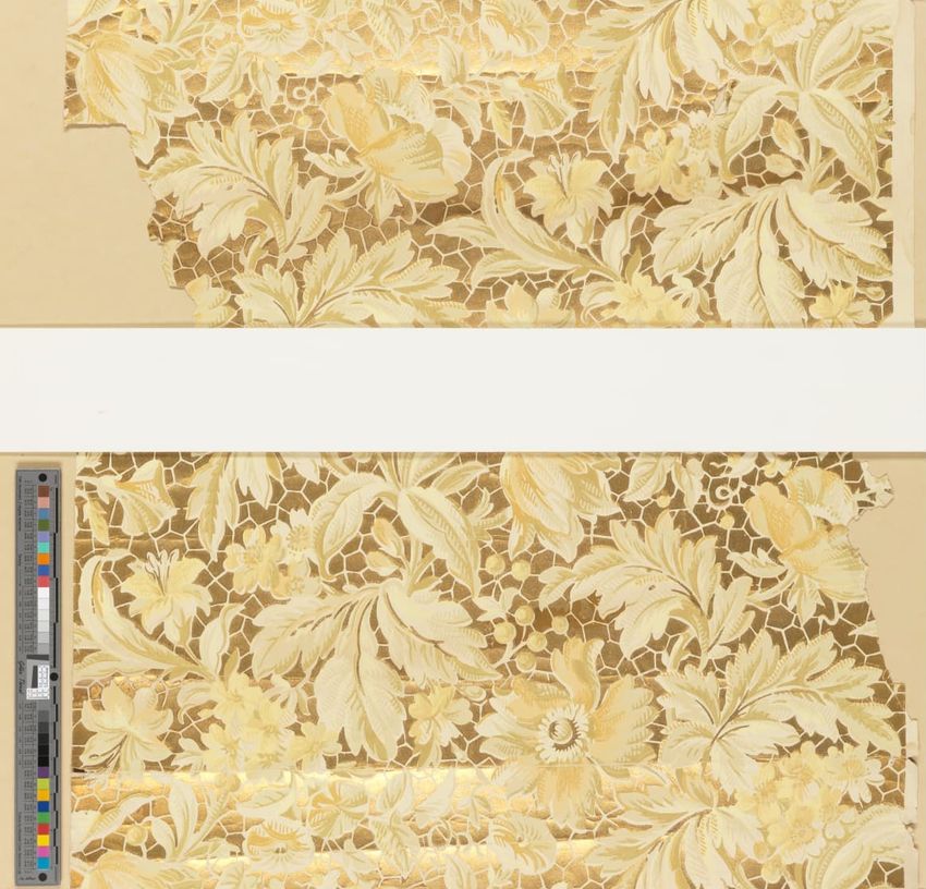 Unused wallpaper sample. Allover floral design of peonies, lilies, daffodils, and passion flowers. Printed in cream, tan, brown, and olive green against a metallic gold field on an ochre ground and over printed with sepia pin stripes. Straight match.