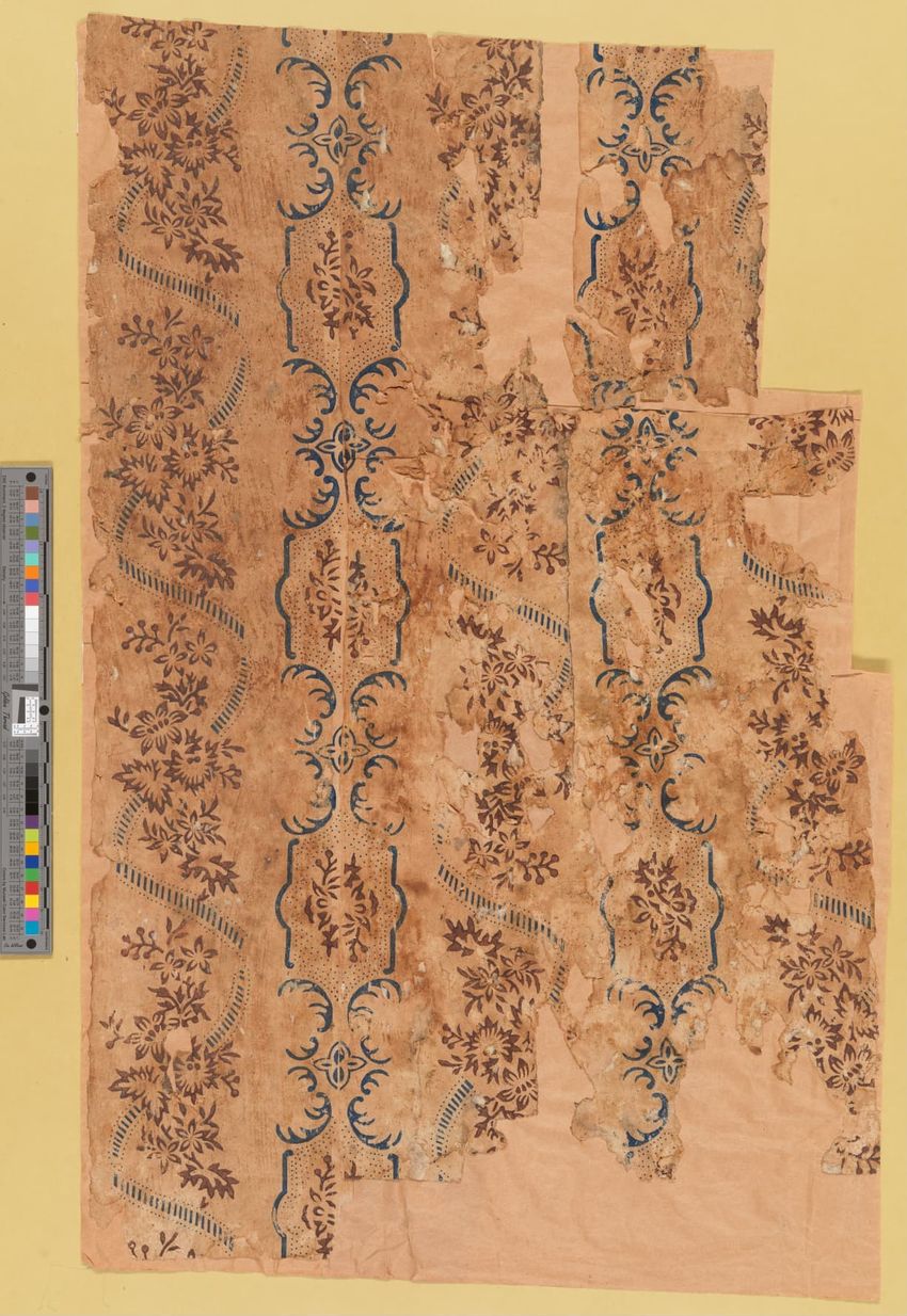 Fragment. Renaissance Revival pattern with thick scroll or strapwork with a faux woodgrain pattern inside scrolls. Printed in brown and blue on an unground.