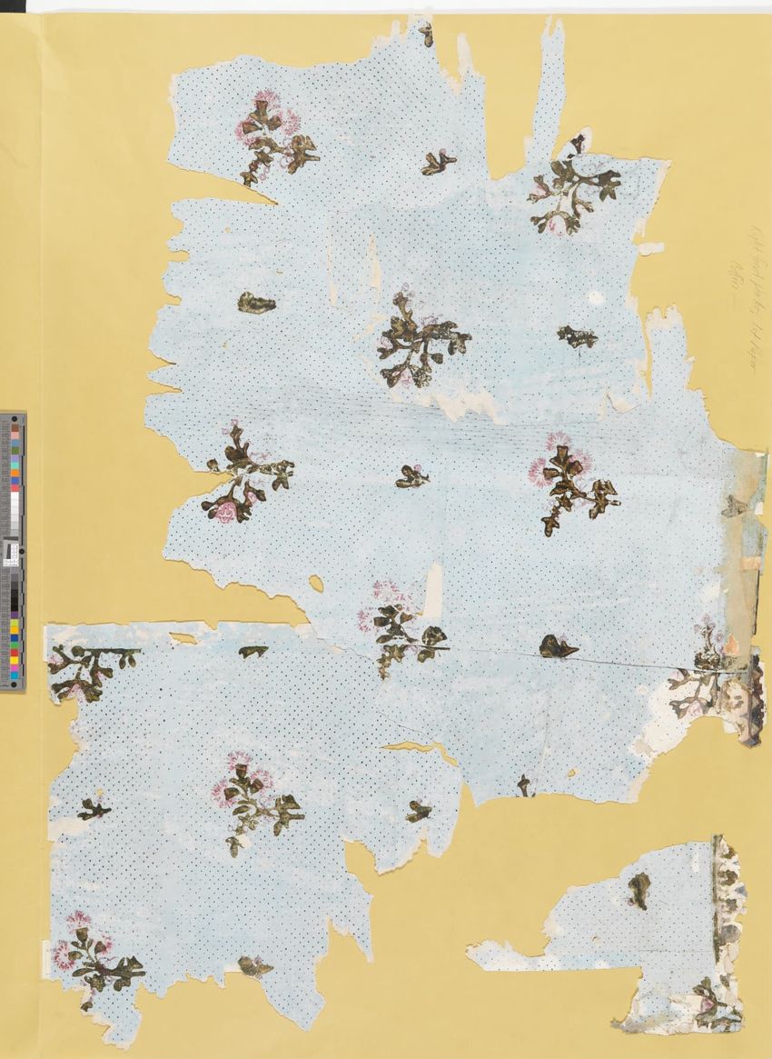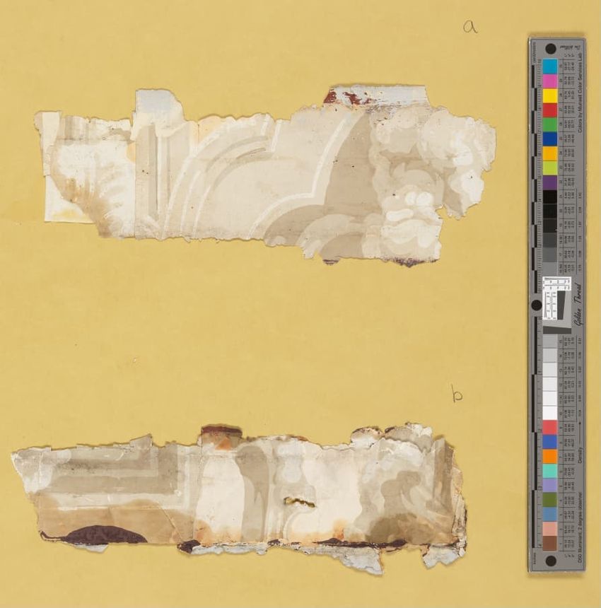 Wallpaper fragments with a Gothic Revival pattern. Printed in white, brown, and grey on a beige ground.