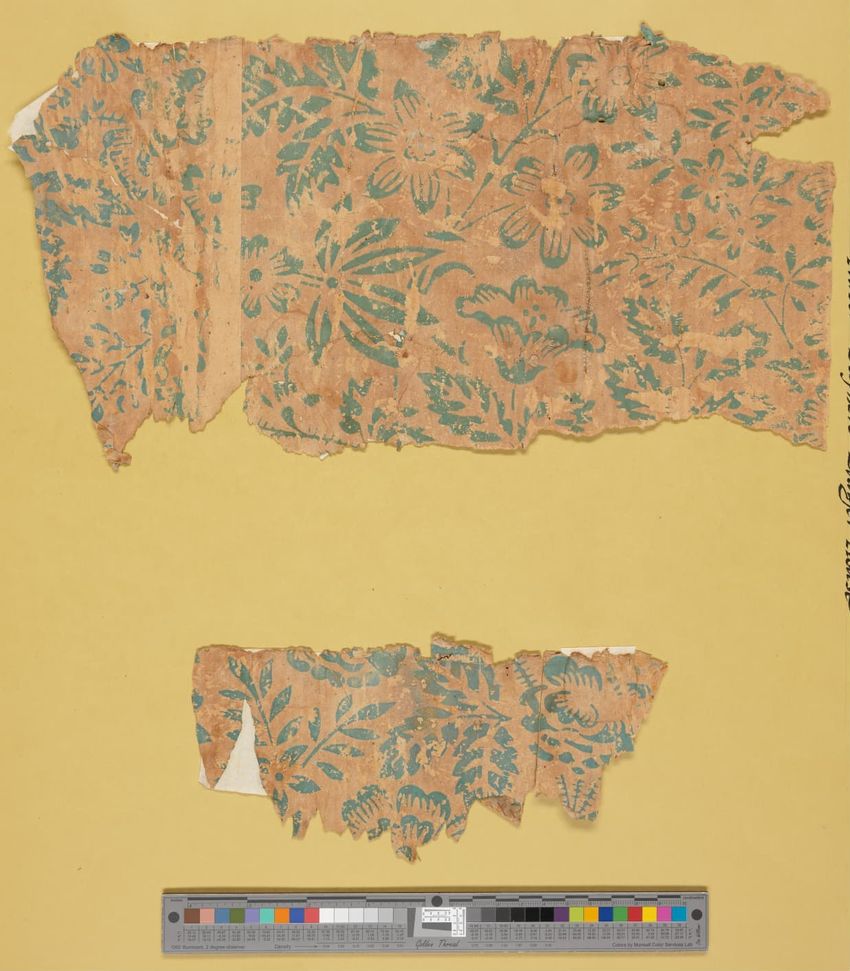 Two fragments of allover, stylized floral patterned paper. Printed in blue and green on beige ground.
