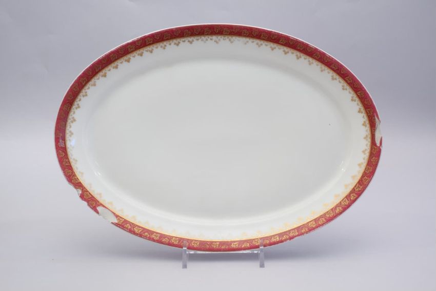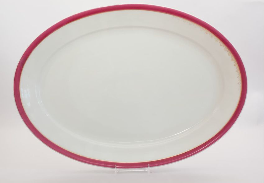 Porcelain oval platter with gilt vine decoration on a raspberry border.