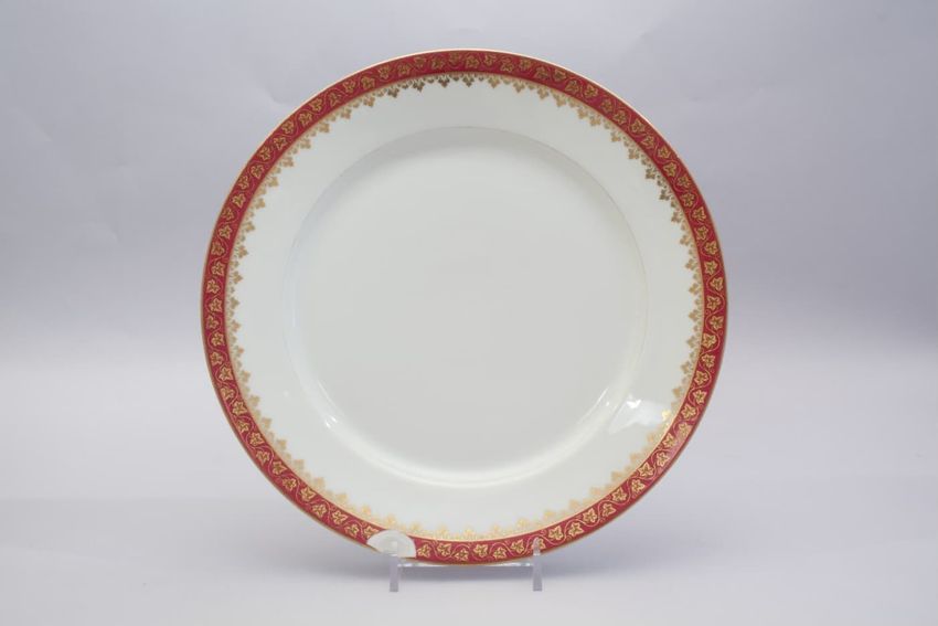 Porcelain dinner plate with gilt vine decoration on a raspberry border.