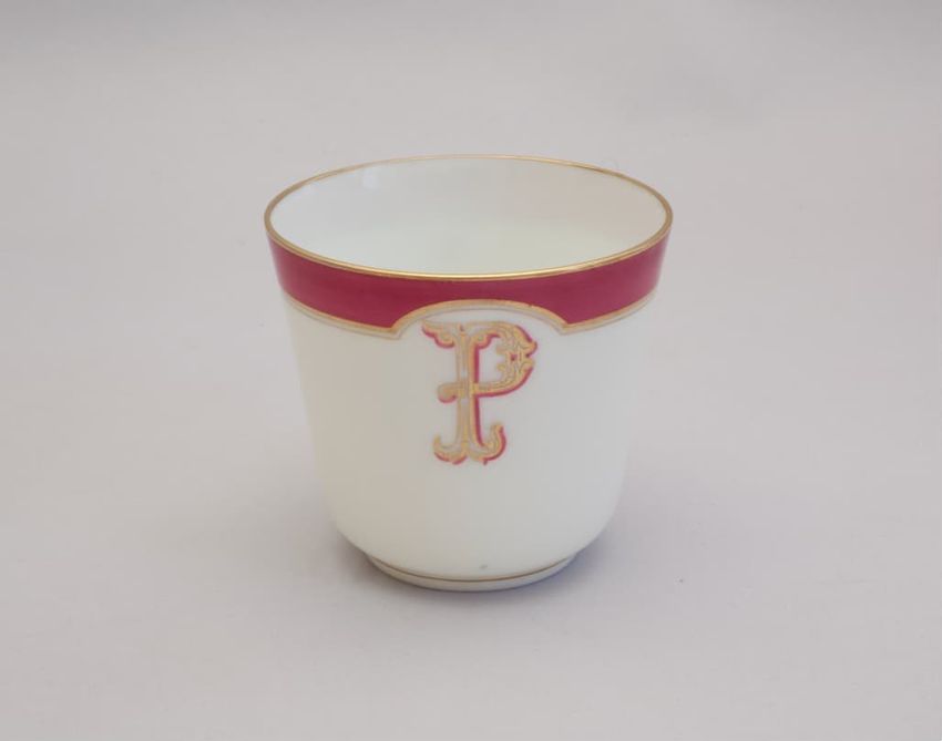 Porcelain Demitasse cup with a white body and a raspberry and gold banded rim with a monogrammed "P".