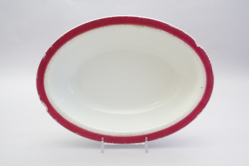 Porcelain oval serving dish with gilt vine decoration on a raspberry border.