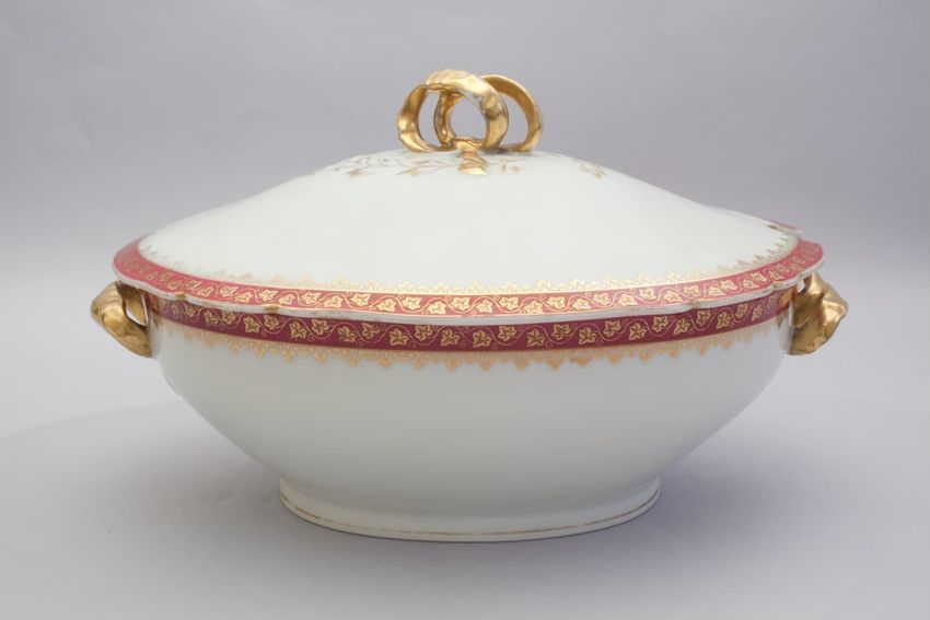 Porcelain soup tureen with cover with gilt vine decoration on a raspberry border.