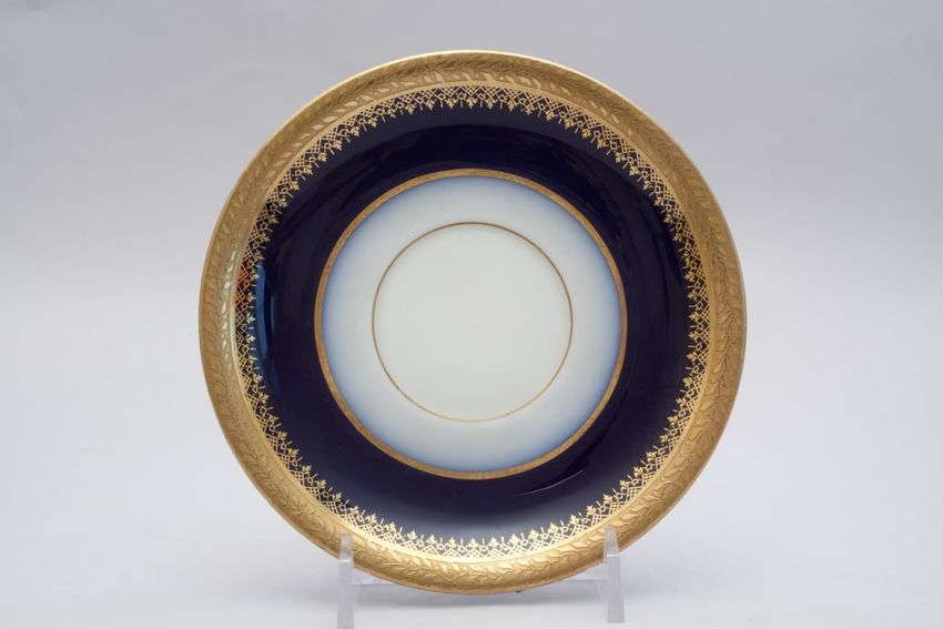 Porcelain saucer with a white body and a gold ivy, floral and foliate borders over a cobalt blue band.