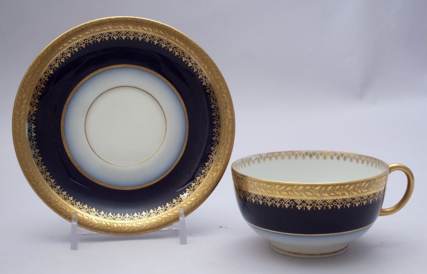 The saucers are gold and blue and the blue fades to white in the center of the saucer. The trim is gold with a leaf and tassel pattern within it.