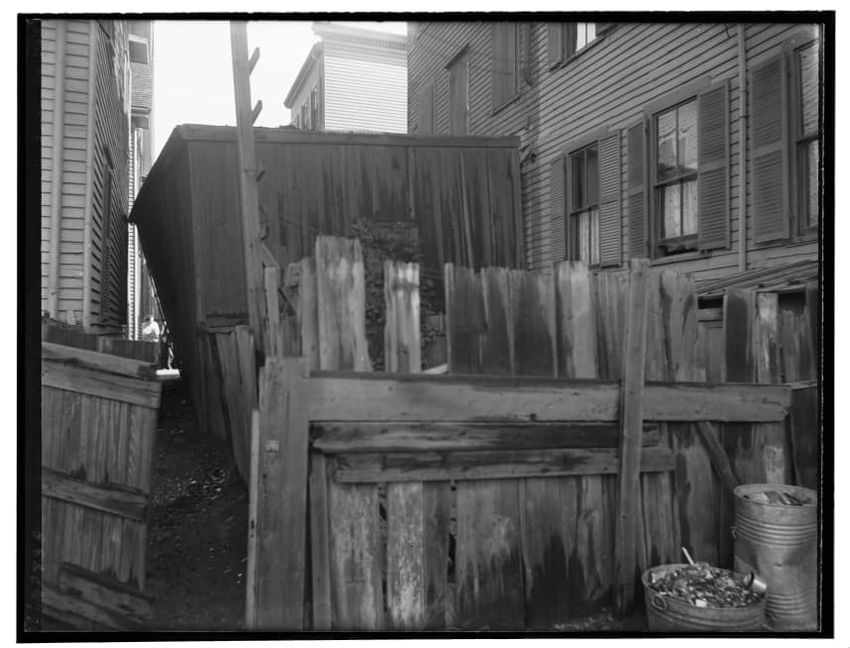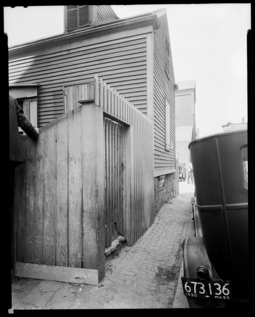 The image depicts the side exterior of an apartment building located at 4 Ambrose Street, Roxbury, Boston, Massachusetts. The view includes the brick walls of the building, several window openings, and an alleyway adjacent to a wooden fence. Debris is visible on the ground in the alley. Nearby resid...