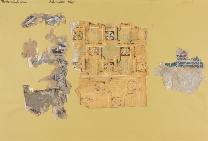 Fragment. Pattern of rose bouquets, with smaller flowers and sprigs. Printed in two shades pink, two shades purple, three shades green, brown-red, ochre and gray on a pale green ground.
