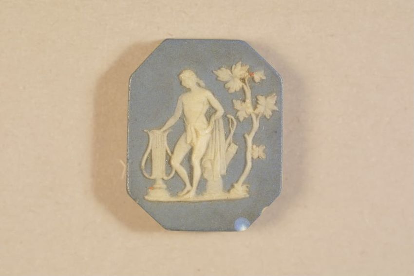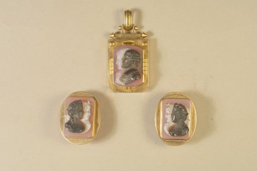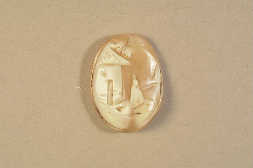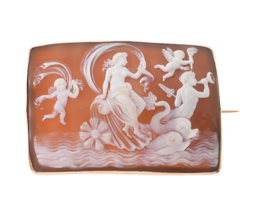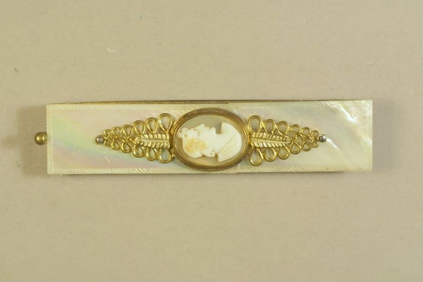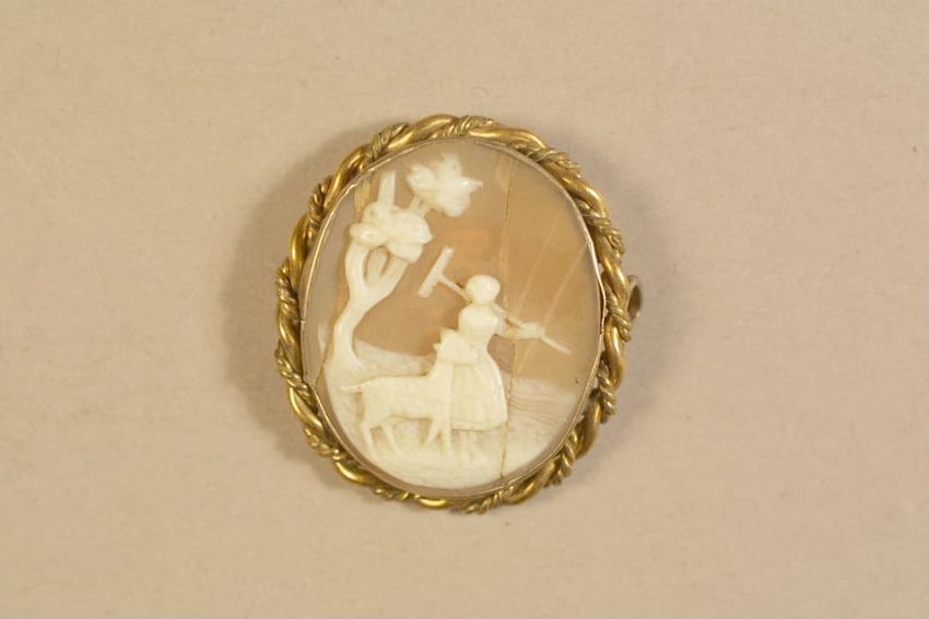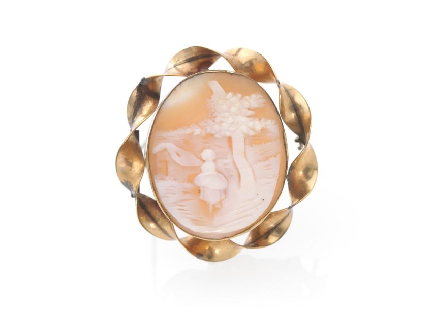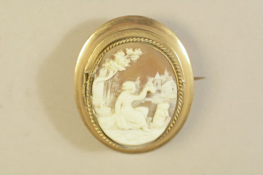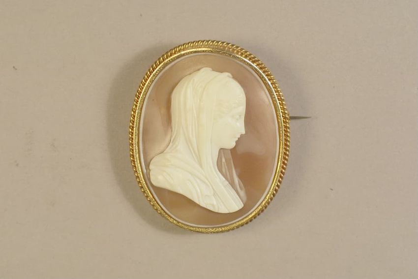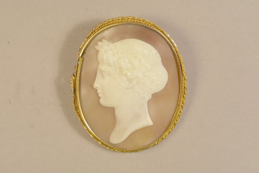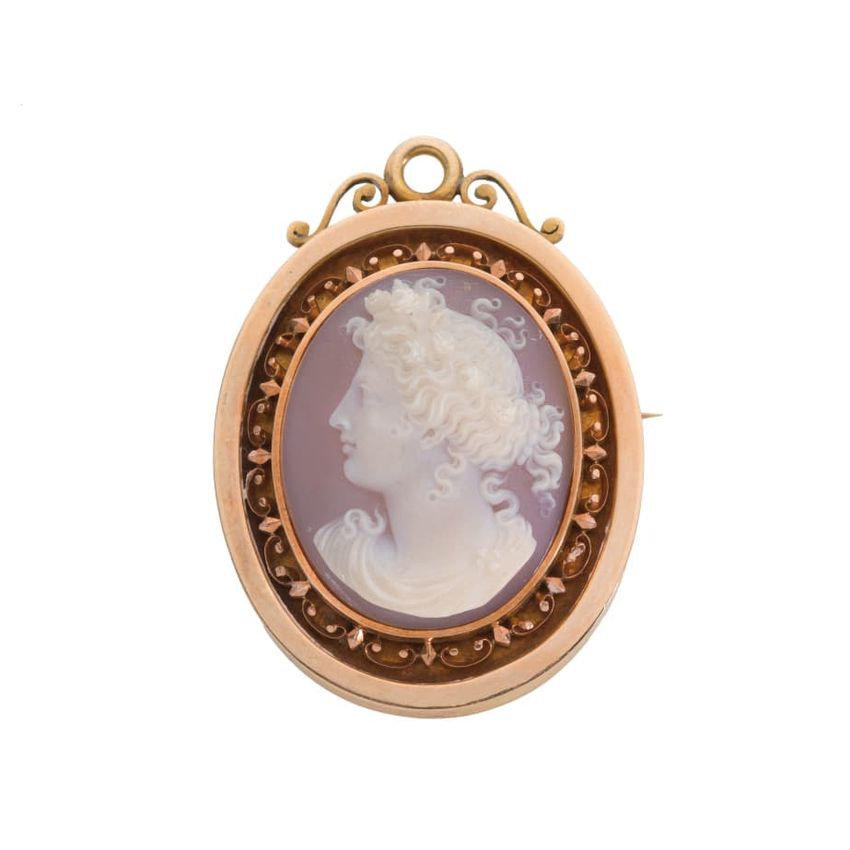 Oval chalcedony cameo brooch in gold mount, depicts woman in profile in classical costume with a garland of roses in hair, row of applied alternating scrolls and diamonds around edge of cameo, applied loop and scrolls at top, hinged pin and hook on reverse.
