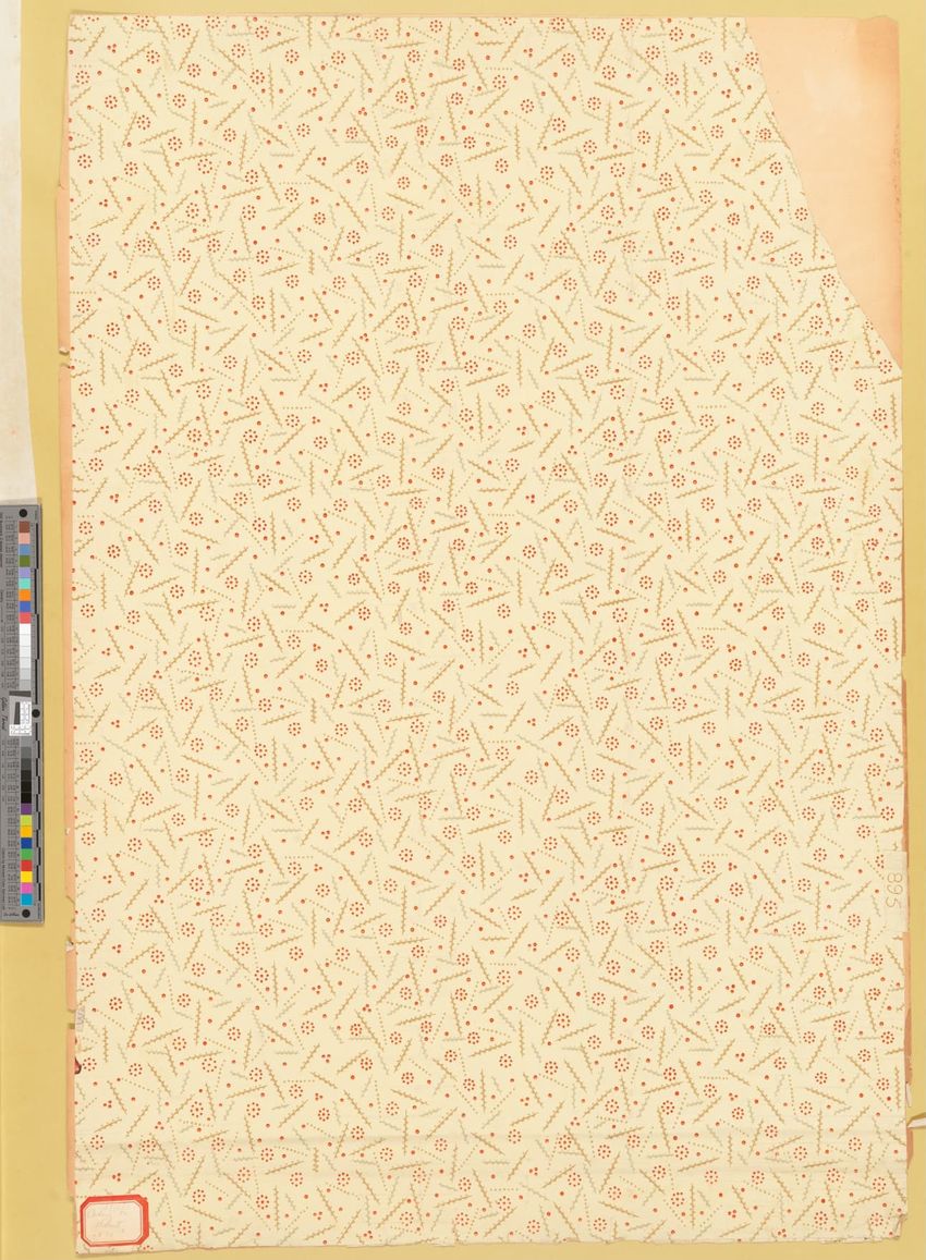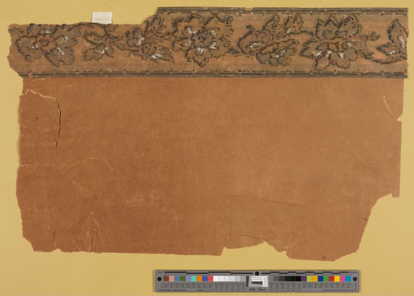 Fragment of Walt Disney cartoon character paper showing Mickey and Minnie Mouse on a picnic with Pluto, Donald Duck with train, Goofy, Pinocchio with Bambi, and two of the seven dwarfs. Light pink (?) ground with pattern printed in blue, pink, yellow, brown, black, red, orange.