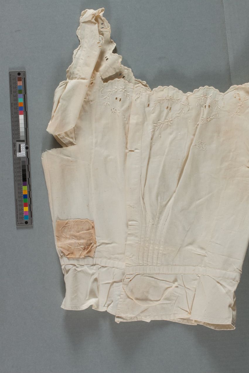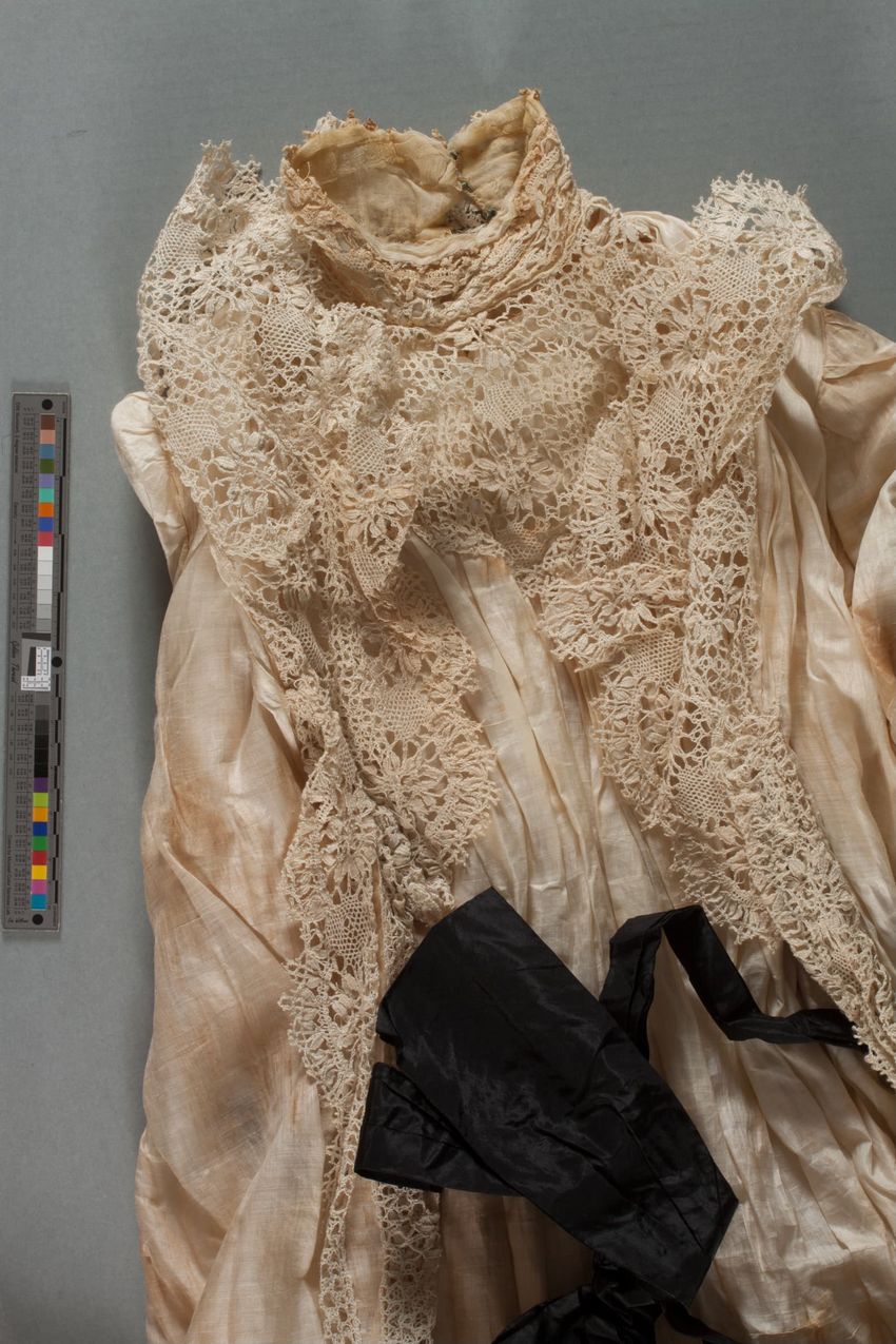 Irridescent purple taffeta with white pinstripes; sheer lawn collar, embroidered with floral sprays, french knots and scalloped edge; inner collar (chemisette) of same with overlap snap closure; long sleeves with scalloped, piped edge, and undersleeves of net with same embroidered lawn at cuffs; dr...