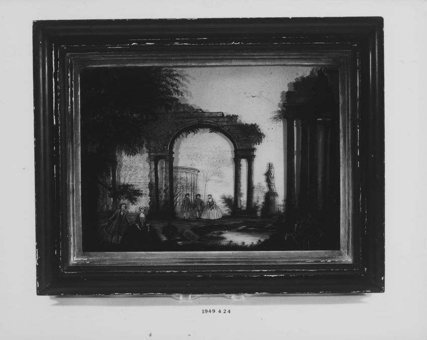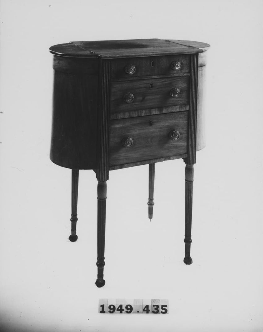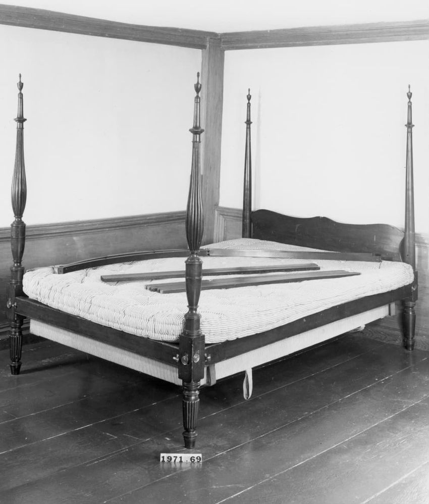 Federal four-poster bed with two turned foot posts with swelled reeding and urn above rail, heavily reeded below rails. Turned tapered head posts. Pine headboard with serpentine crest. Maple rails have beaded outside edges. Bolt caps on foot posts, none at head. Fitted with a modern boxspring and ho...