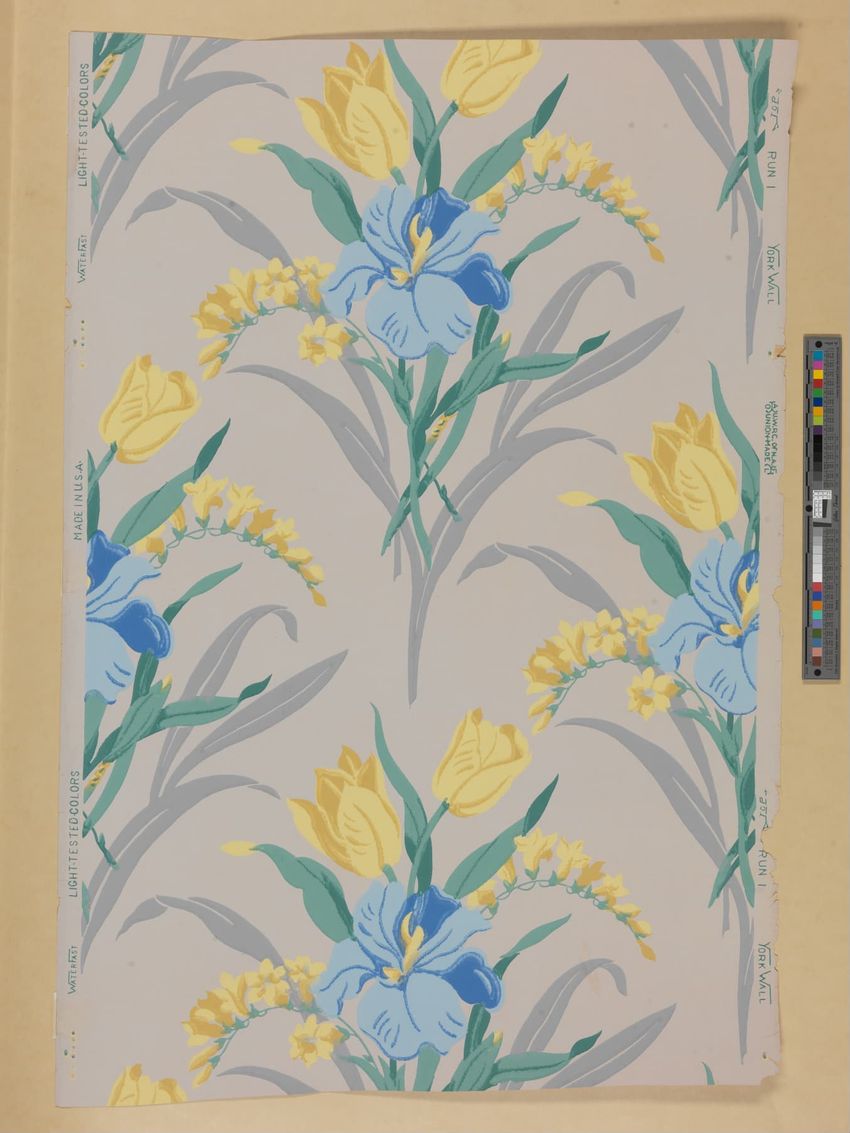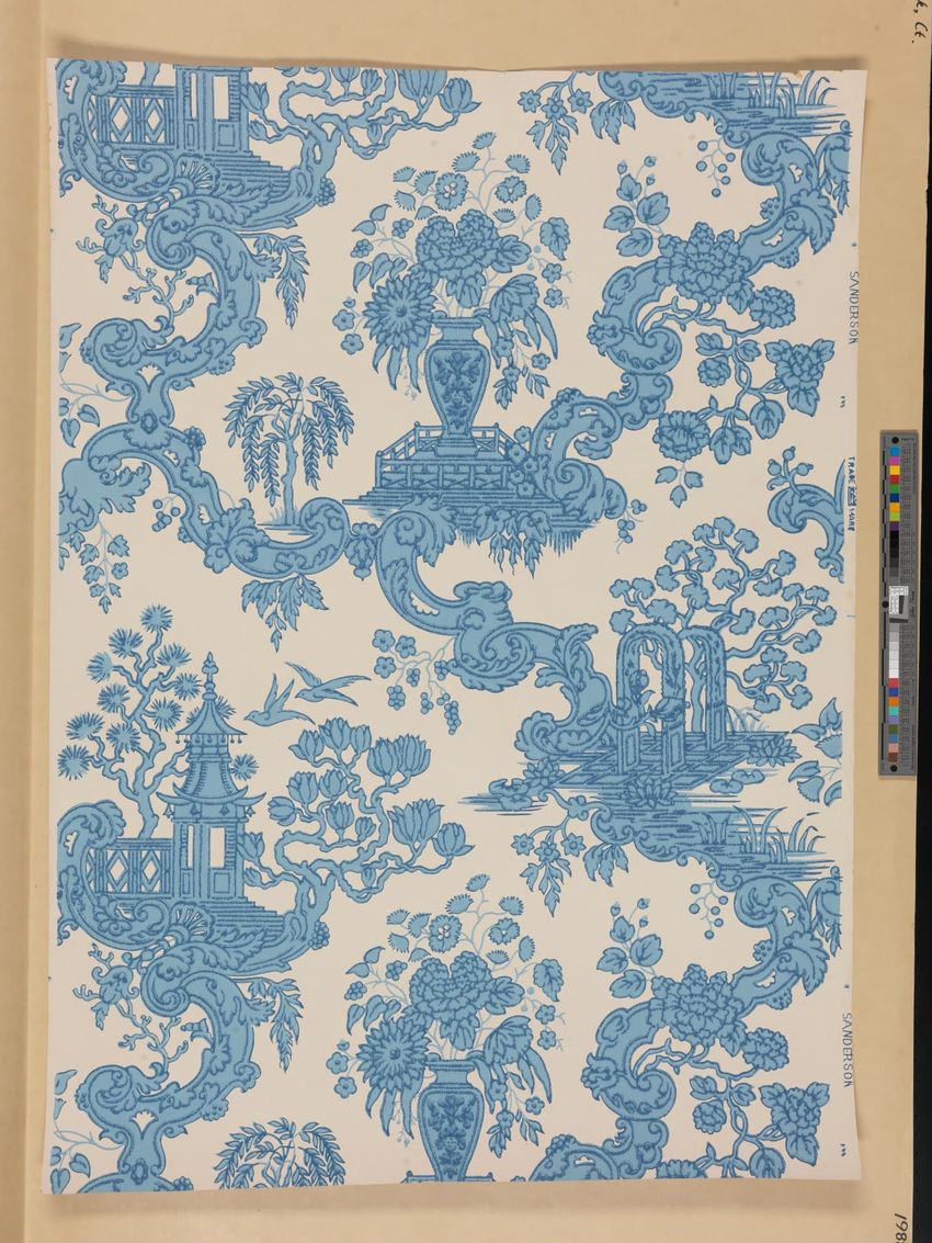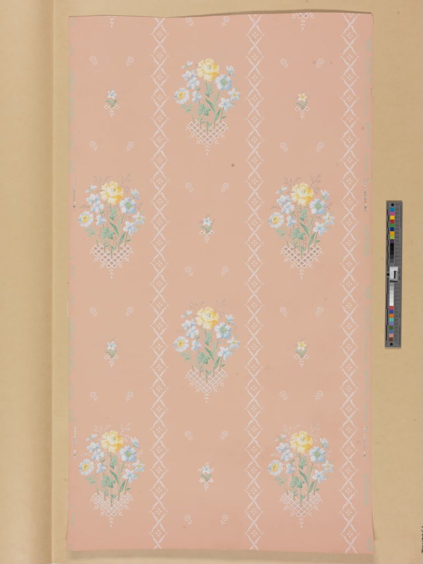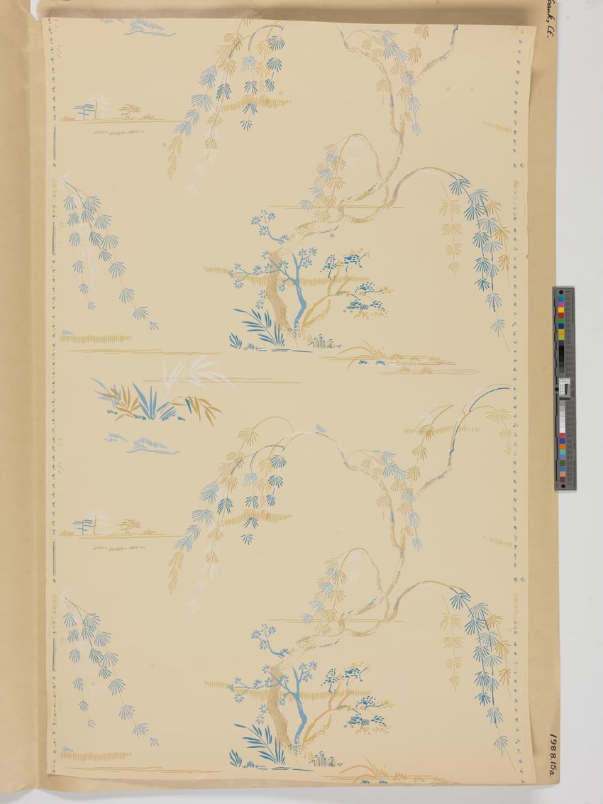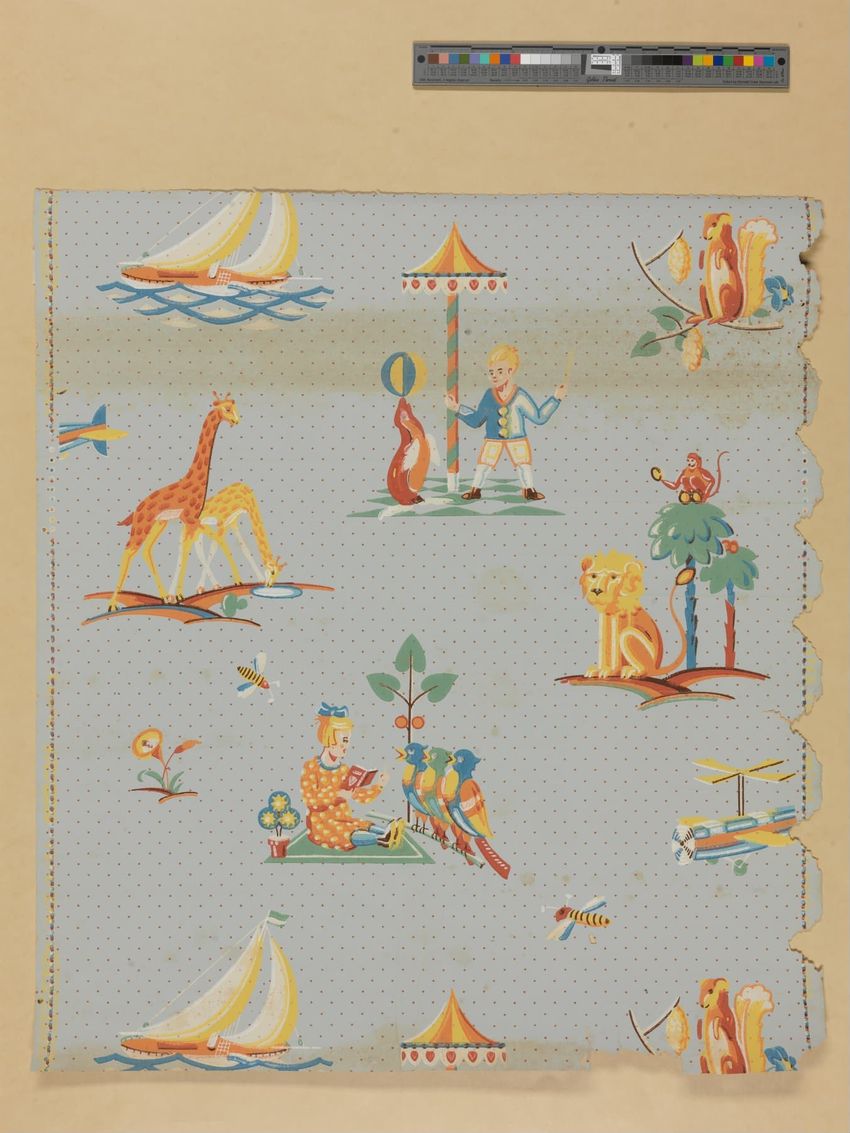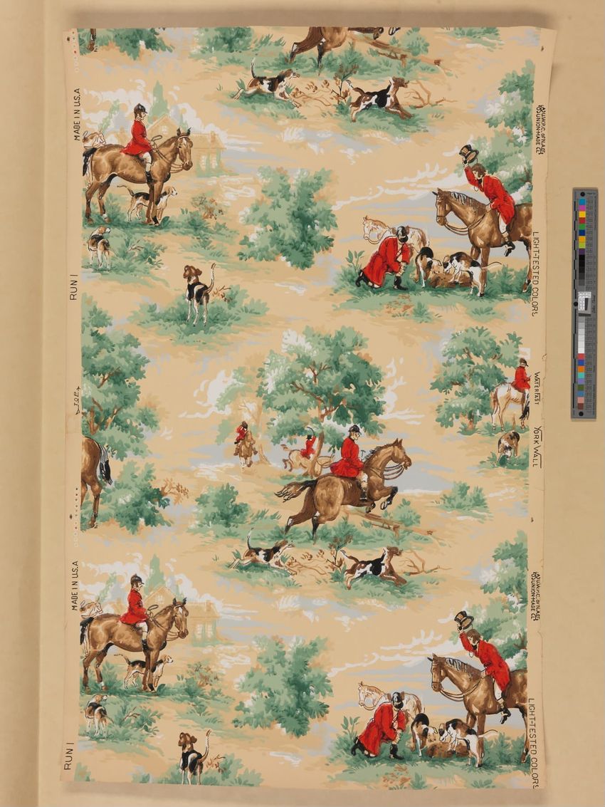 Wallpaper depicting a repeating design of a house with a gambrel roof, a cape house, a lighthouse, a church and a sail boat, each within a meandering vine border. Printed in red, green, two browns, white, and tan on beige ground. Drop pattern.