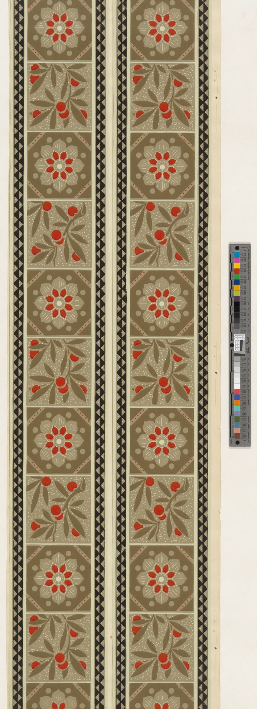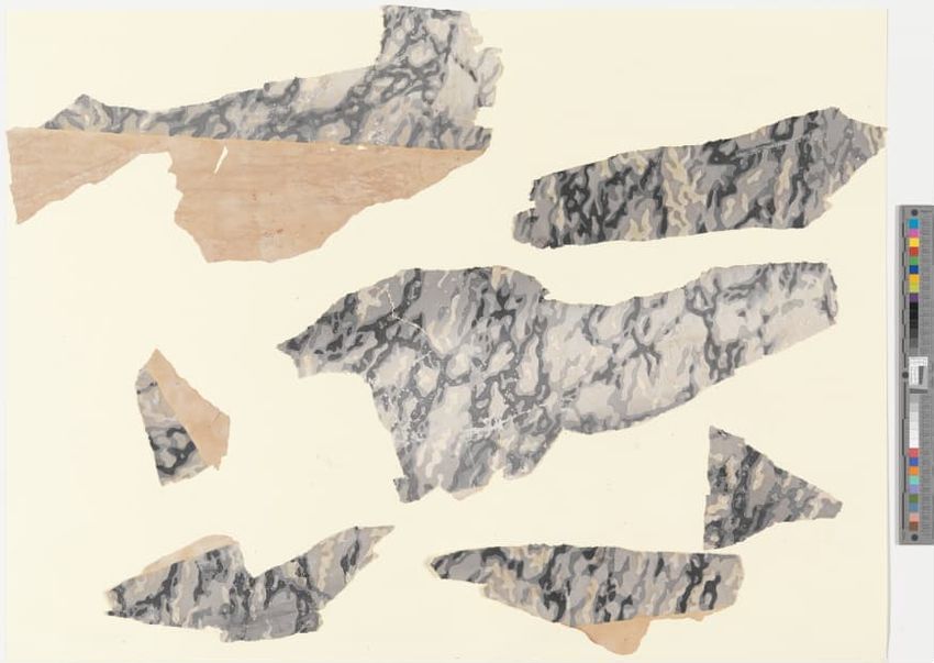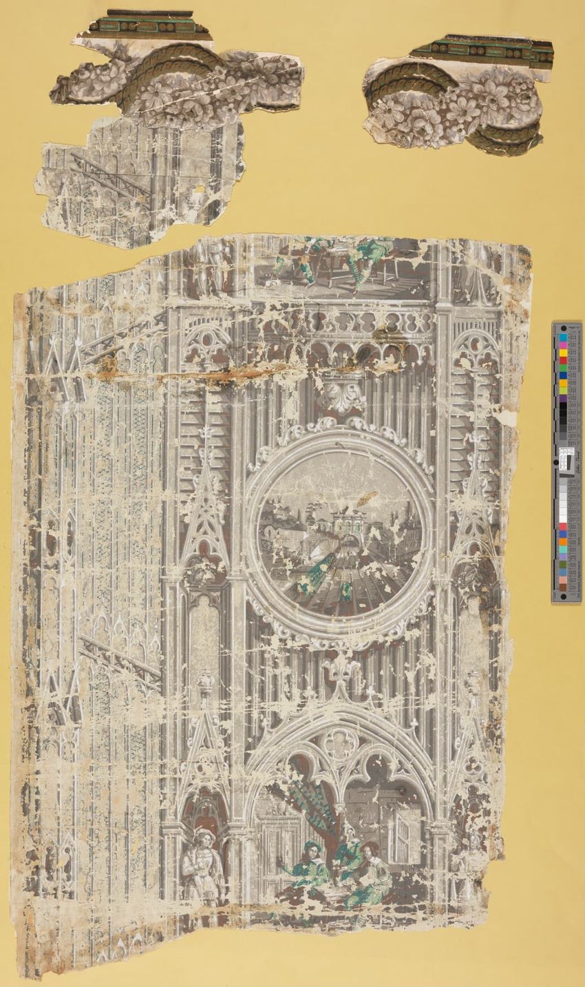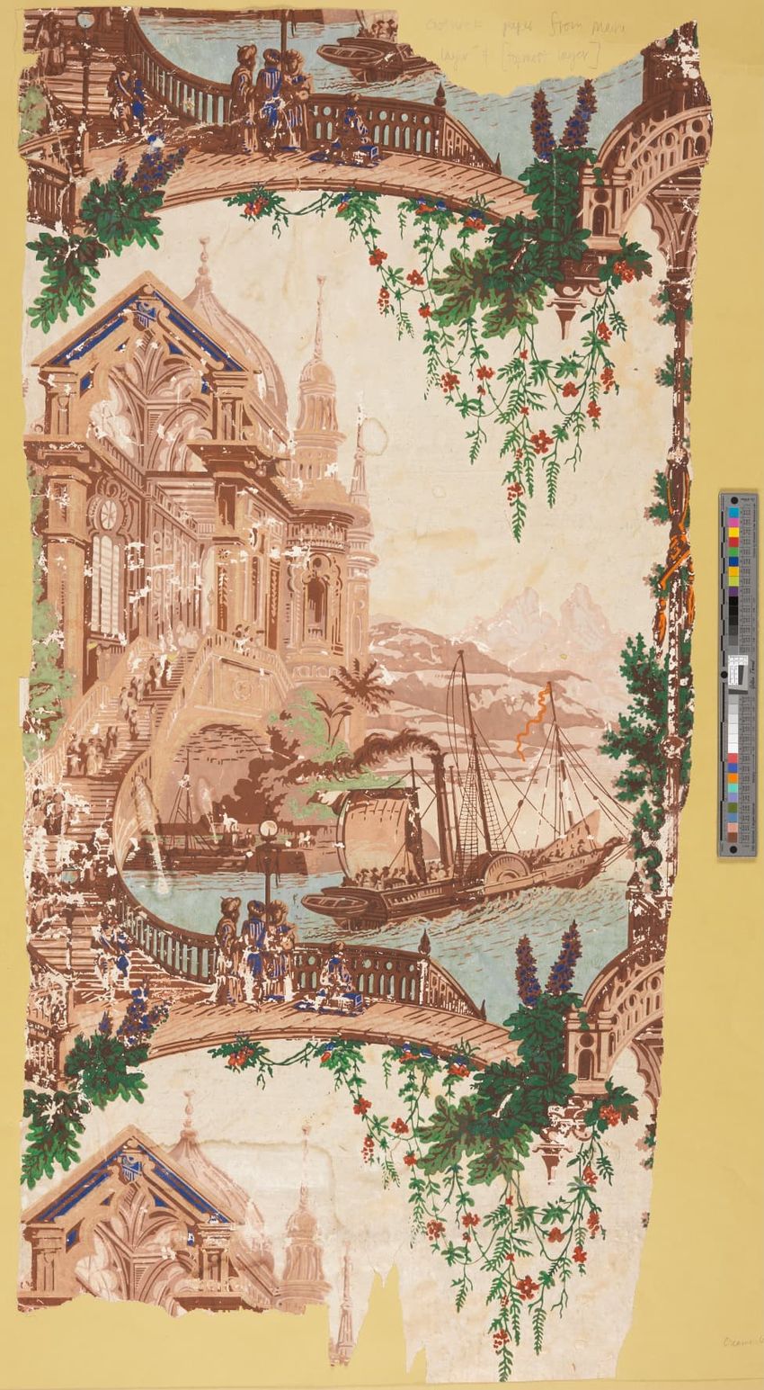 Wallpaper fragment. Scene of a large Gothic/Turkish structure (probably a cathedral) with a long, meandering bridge with stairs. A sailboat is departing and people ascend the stairs. Printed in blue, aqua, three greens, two browns, tan, grey, and pale pink on white ground.