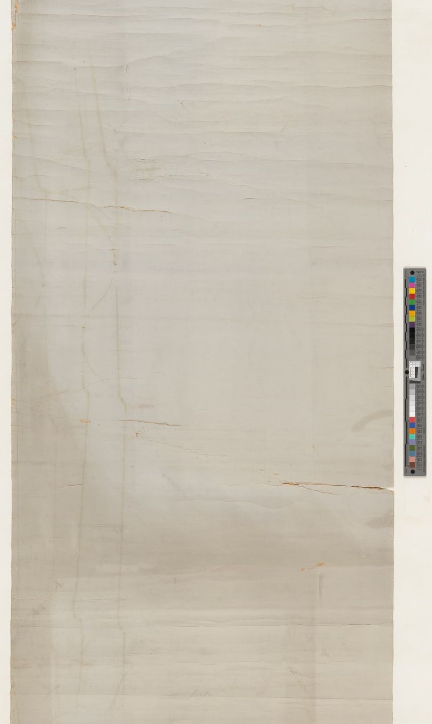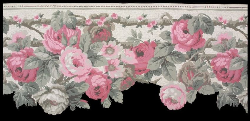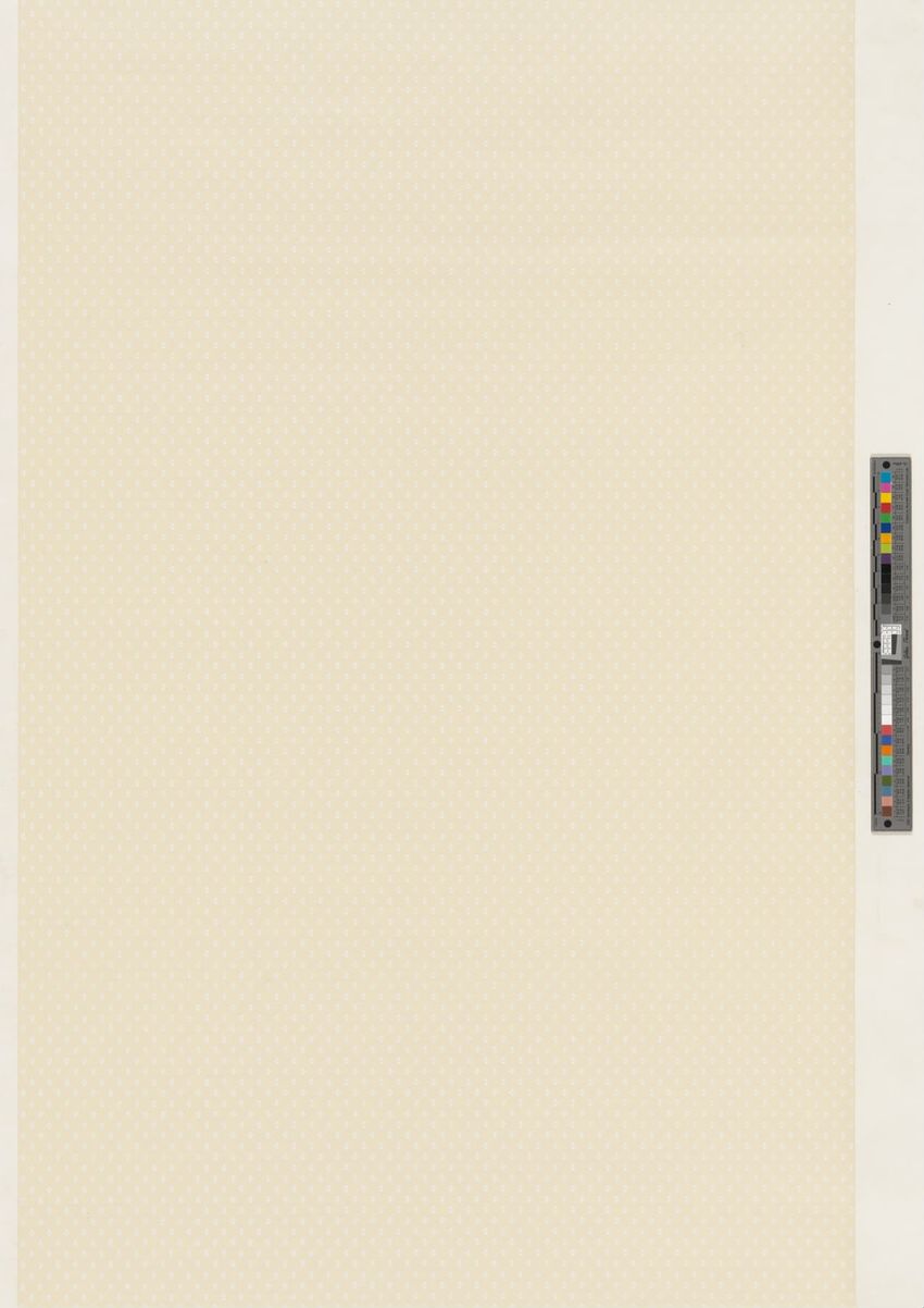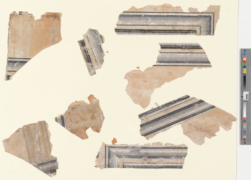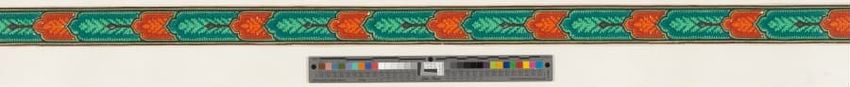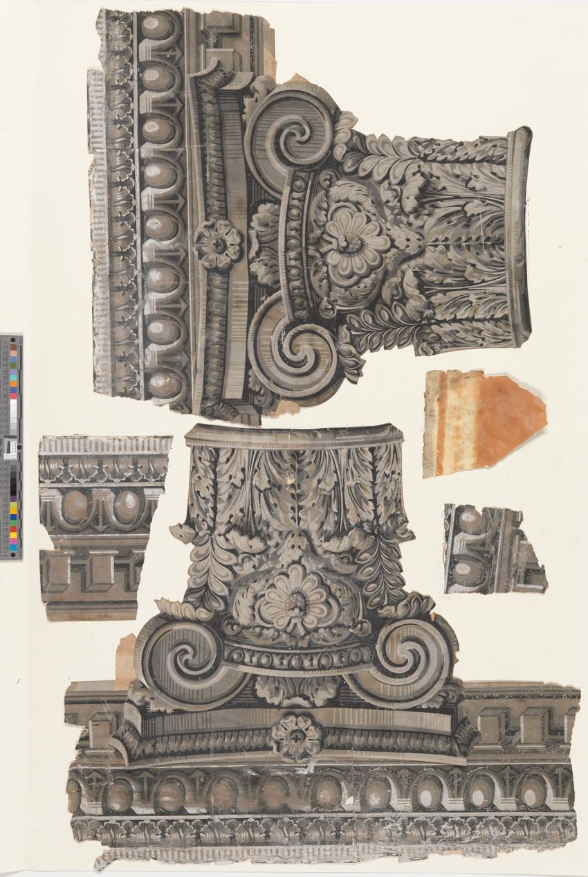 Wallpaper fragment. Scene of a large Gothic/Turkish structure (probably a cathedral) with a long, meandering bridge with stairs. A sailboat is departing and people ascend the stairs. Printed in blue, aqua, three greens, two browns, tan, grey, and pale pink on white ground.