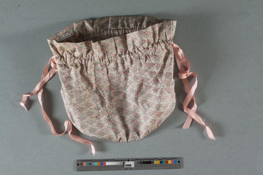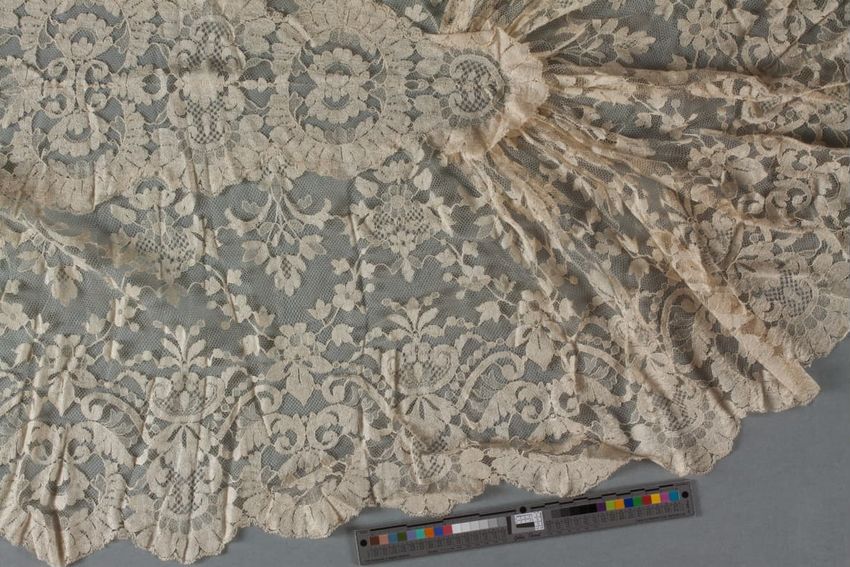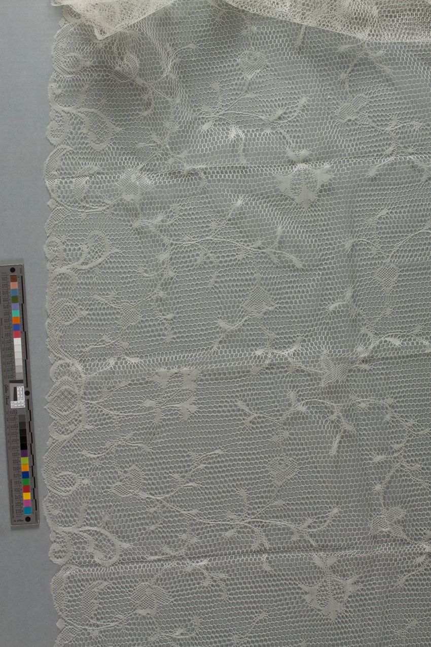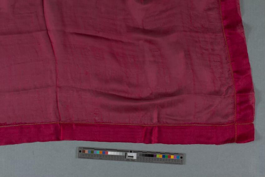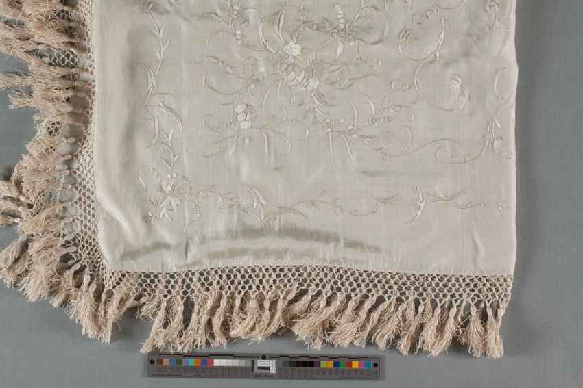 Printed silk chiffon; pastel paisley border, with satin stripes, in pinks, blues and greens; cream center, scrolling meander with narrower border of "patchwork" pattern, ends are cream with row of faggoting.