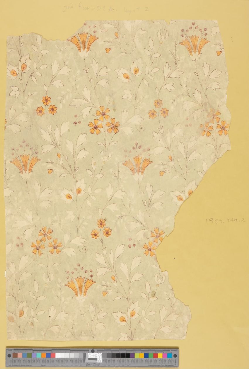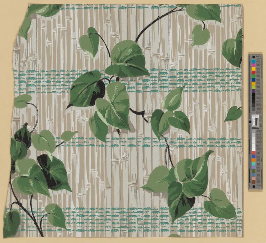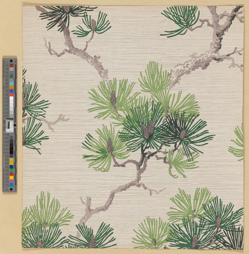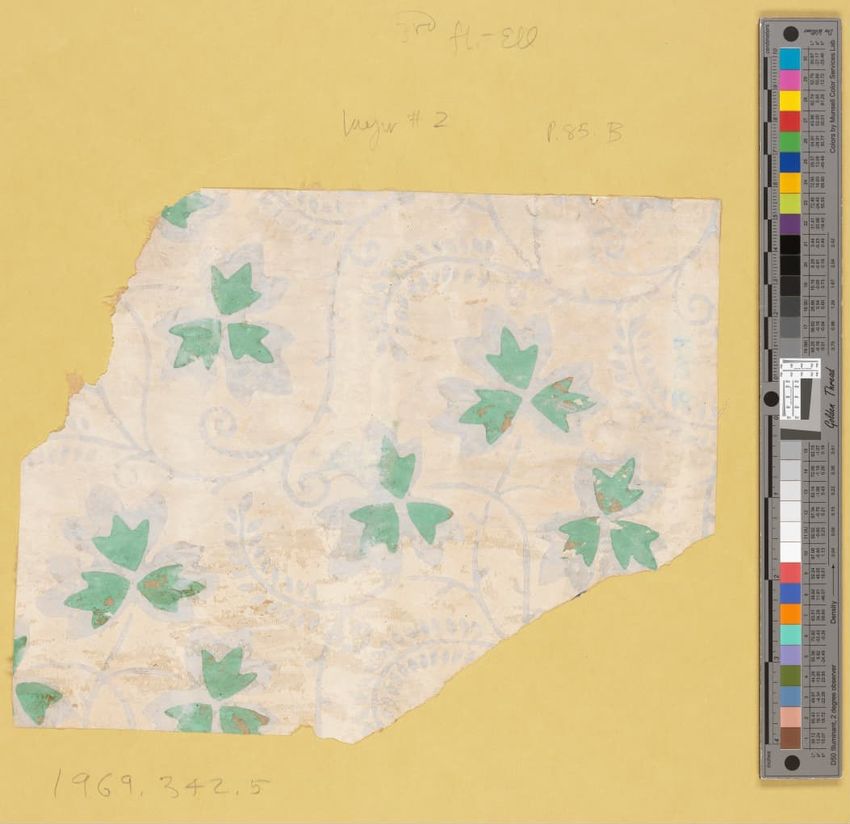 Unused sample. chinoiserie paper with asian figures, large flowers, scrolls with diaper pattern, foot bridge and trees. Printed in three greens, silver, white, beige, two grays, cream and black on a green ground