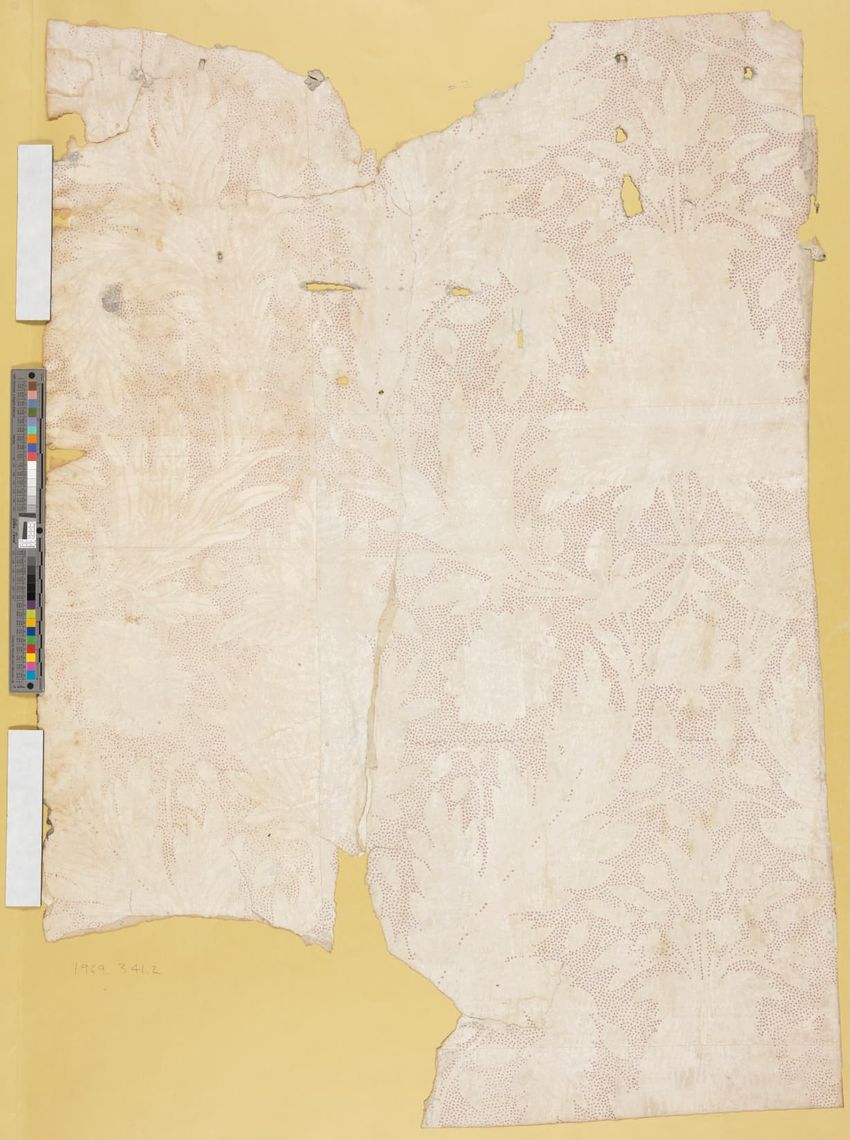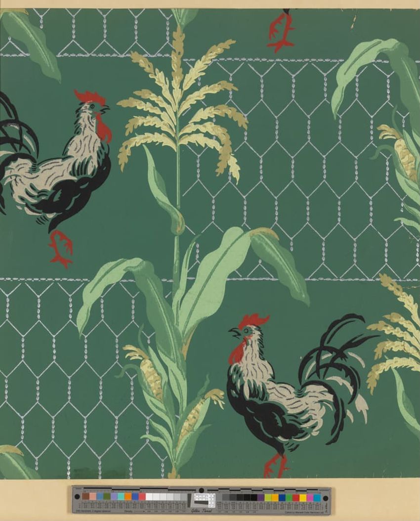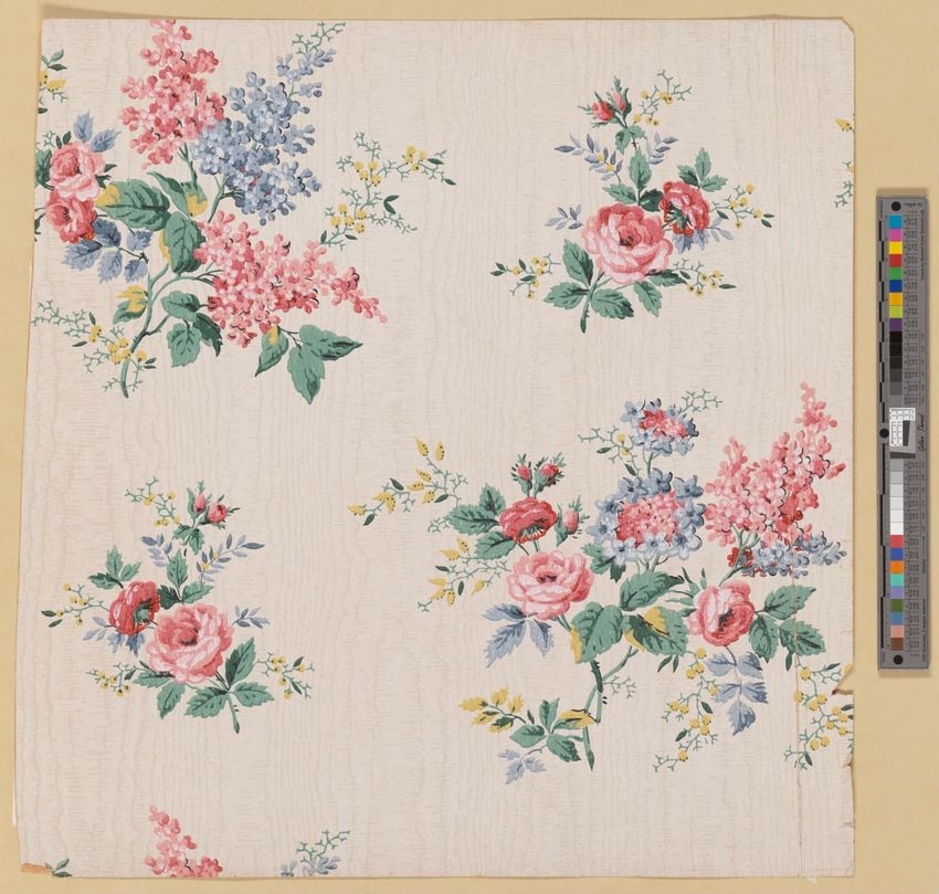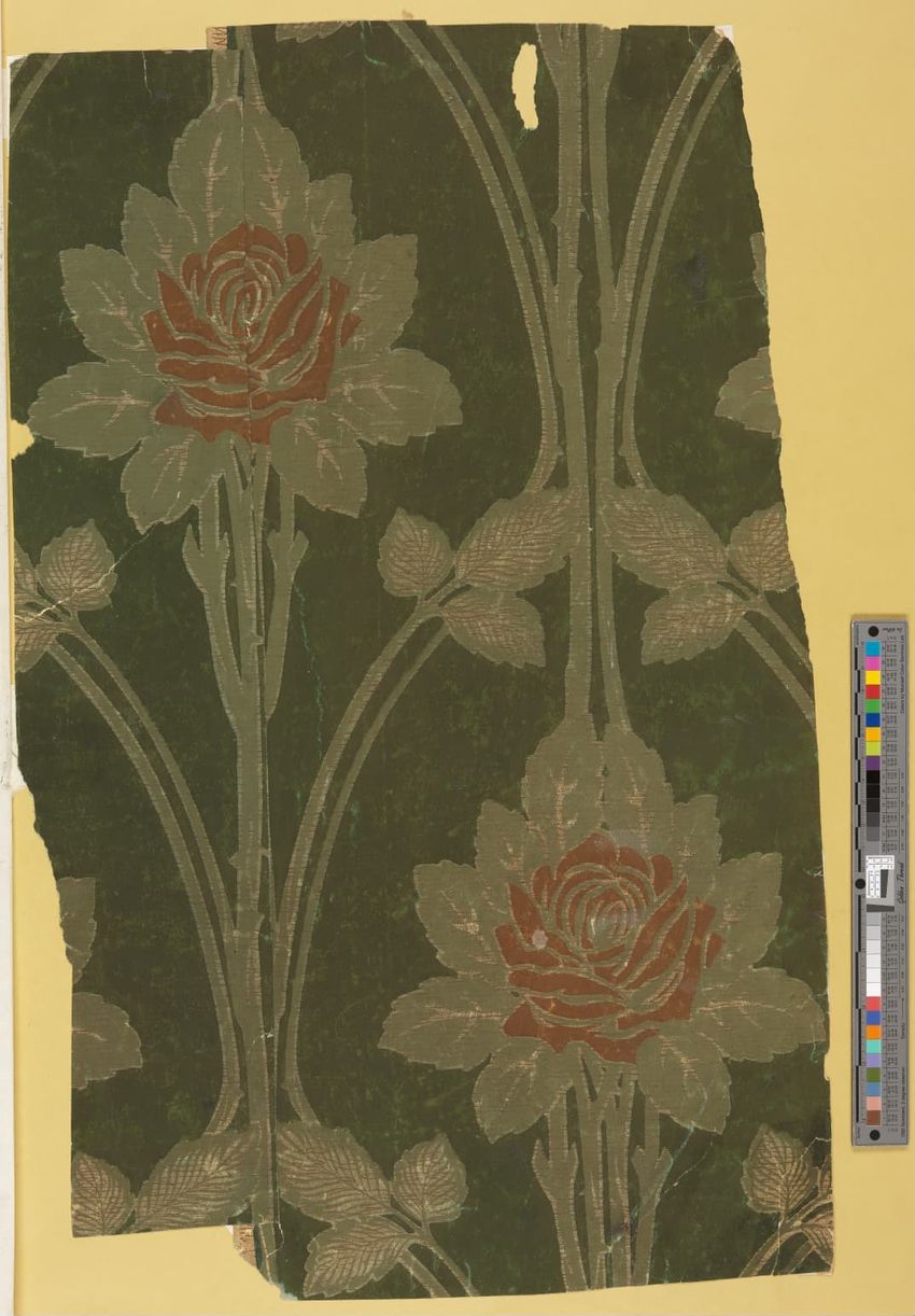 Unused sample. chinoiserie paper with asian figures, large flowers, scrolls with diaper pattern, foot bridge and trees. Printed in three greens, silver, white, beige, two grays, cream and black on a green ground