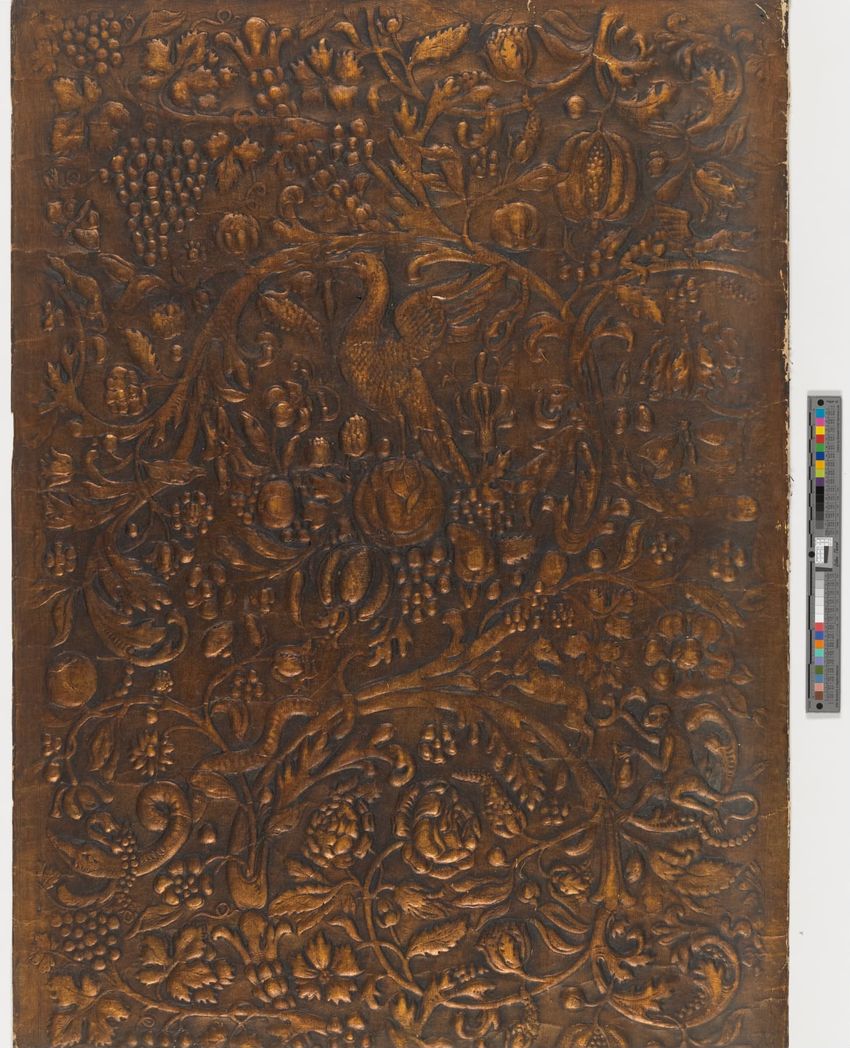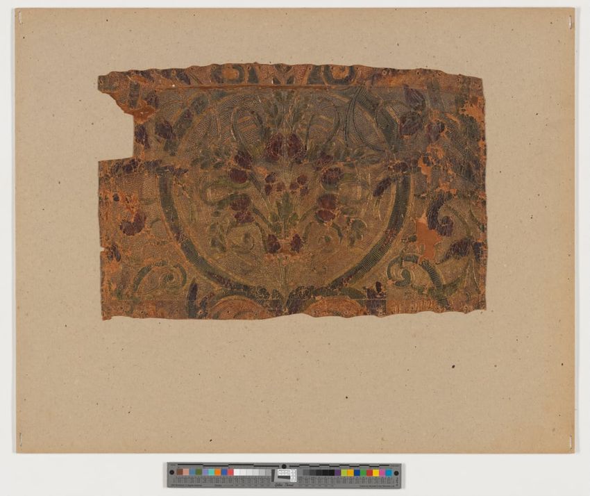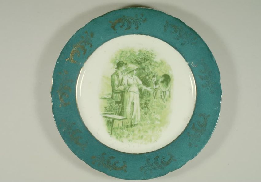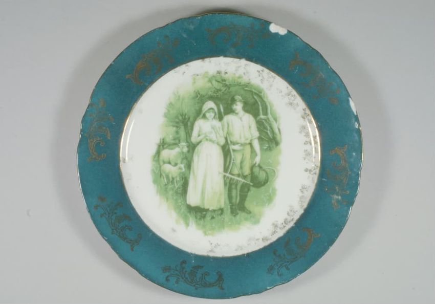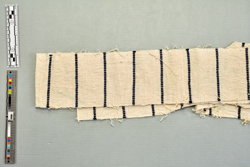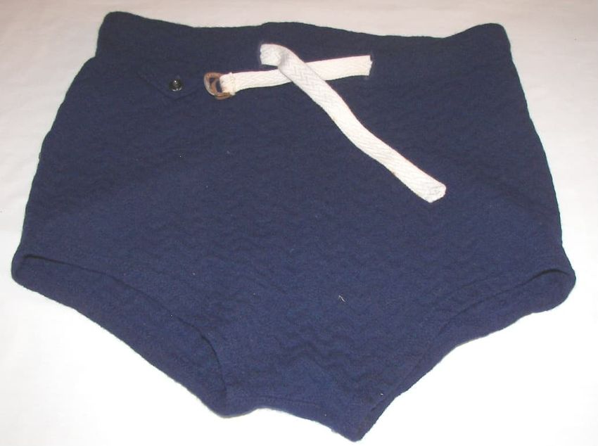 Men's wool bathing suit. Blue wool shorts with a knitted vertical stripe pattern, draw string waist band, five belt loops, a small pocket on right side with flap and button, and a fish appliqué on front left leg.