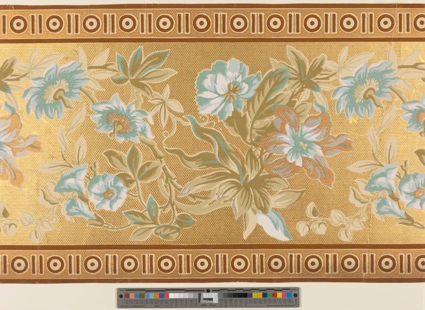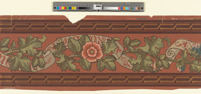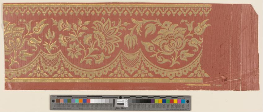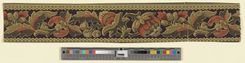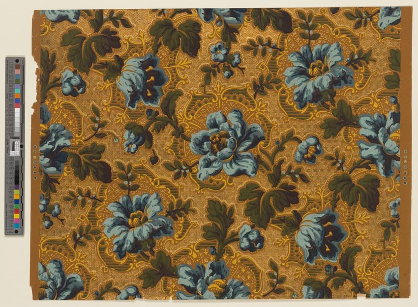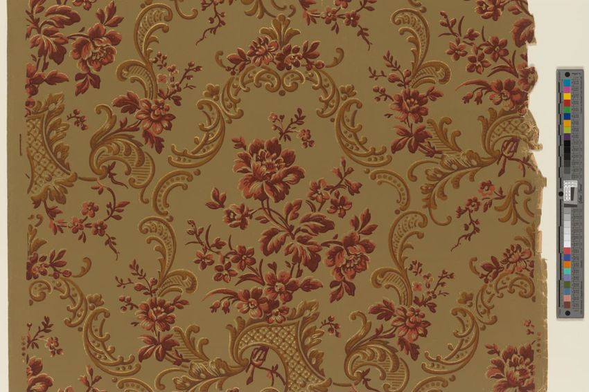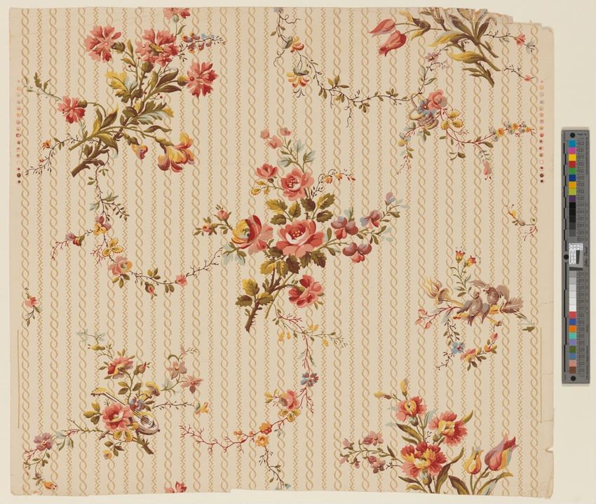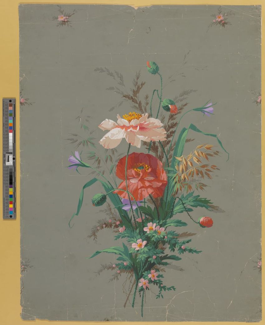 Unused sample. Bouquet of realistically rendered poppies, grass and purple flowers. Printed on grey ground with small pink floral sprigs. Printed in three pinks, fuschia, red, orange, lavender, two purples, yellow, five greens, two browns, tan, and two greys.