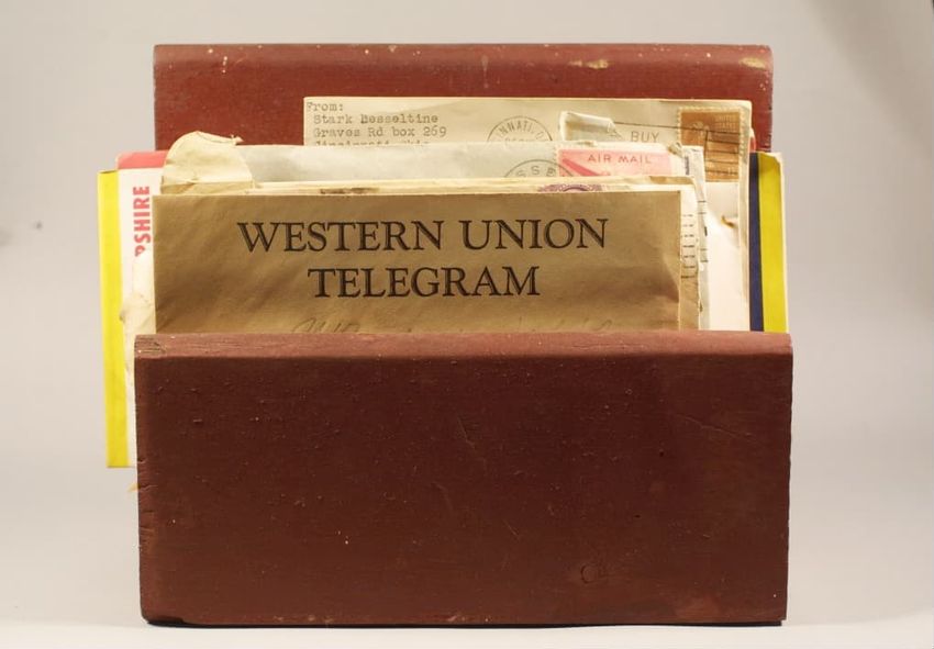 Violin with three loose strings. Rectangular case with red velvet interior. Two bows stored in lid of case, one from Paris, the other from Germany.