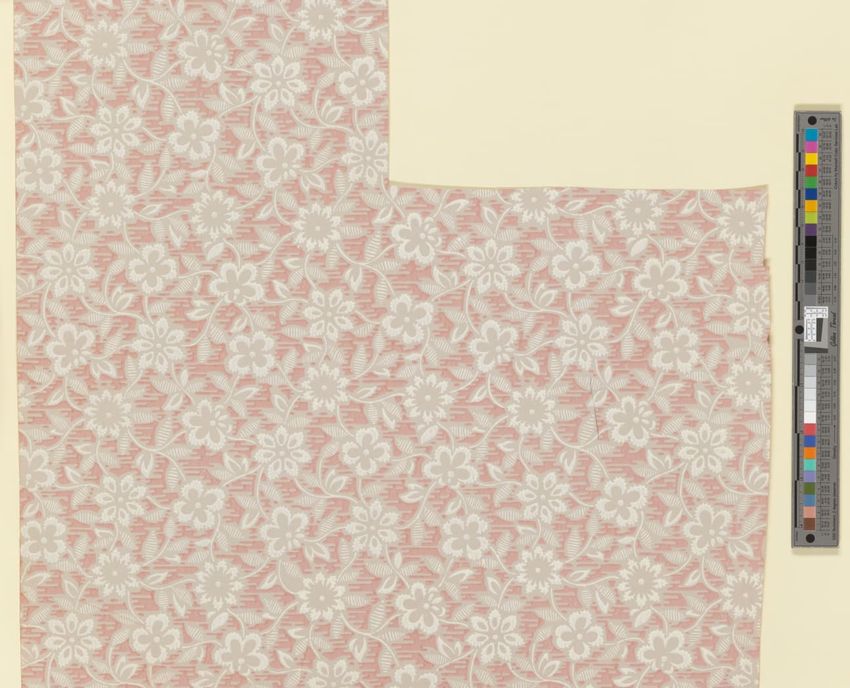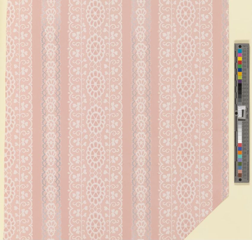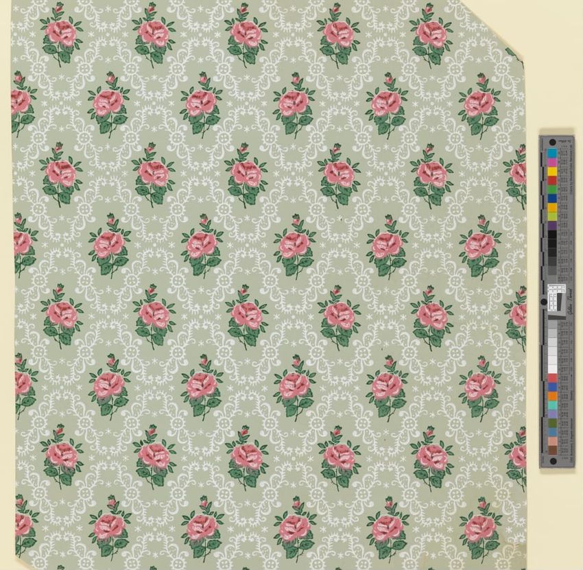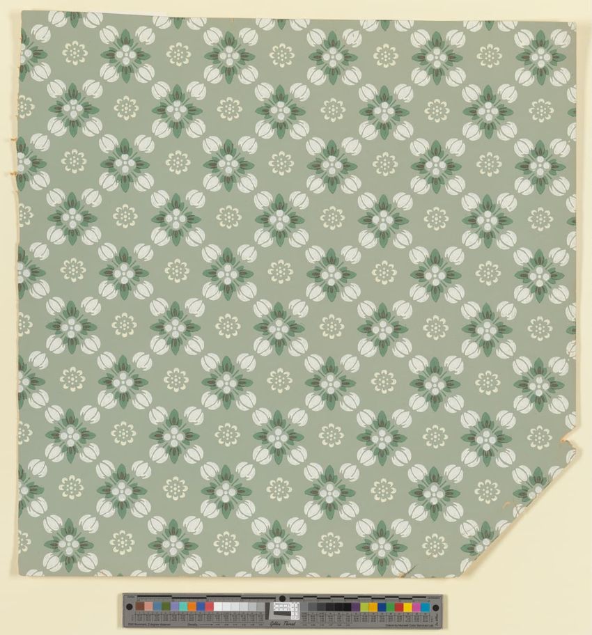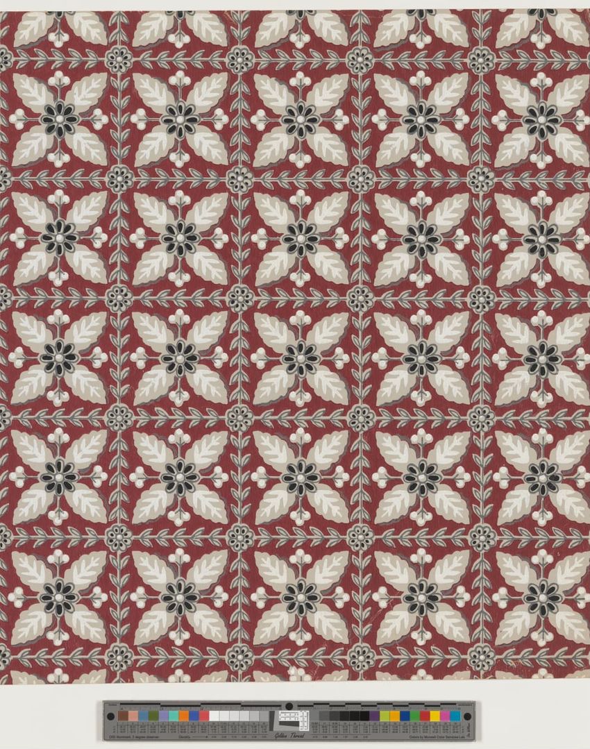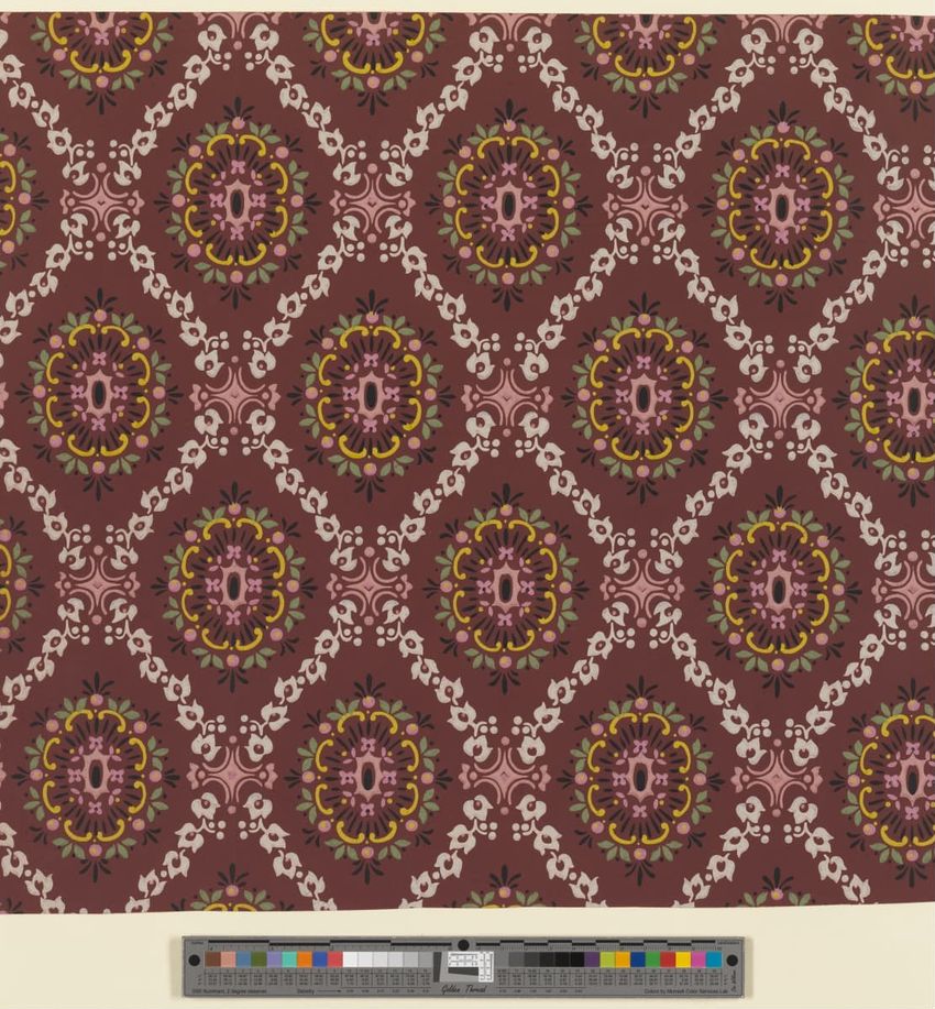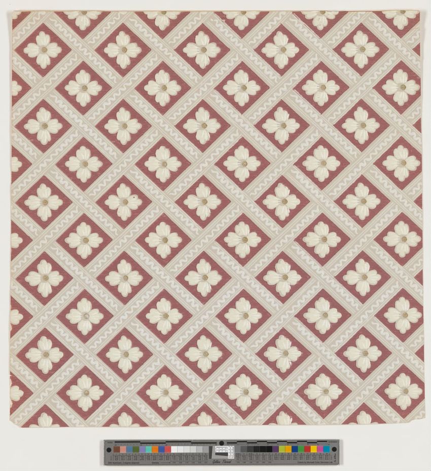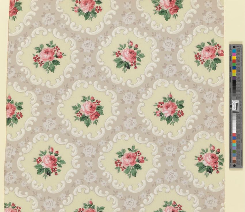 Unused sample. Circular medallions, composed of C-scrolls, encircle flowers. Diaper pattern. Printed in pink, two reds, three greens, white, black, liquid mica, two greys on a grey/white ground. Embossed.
