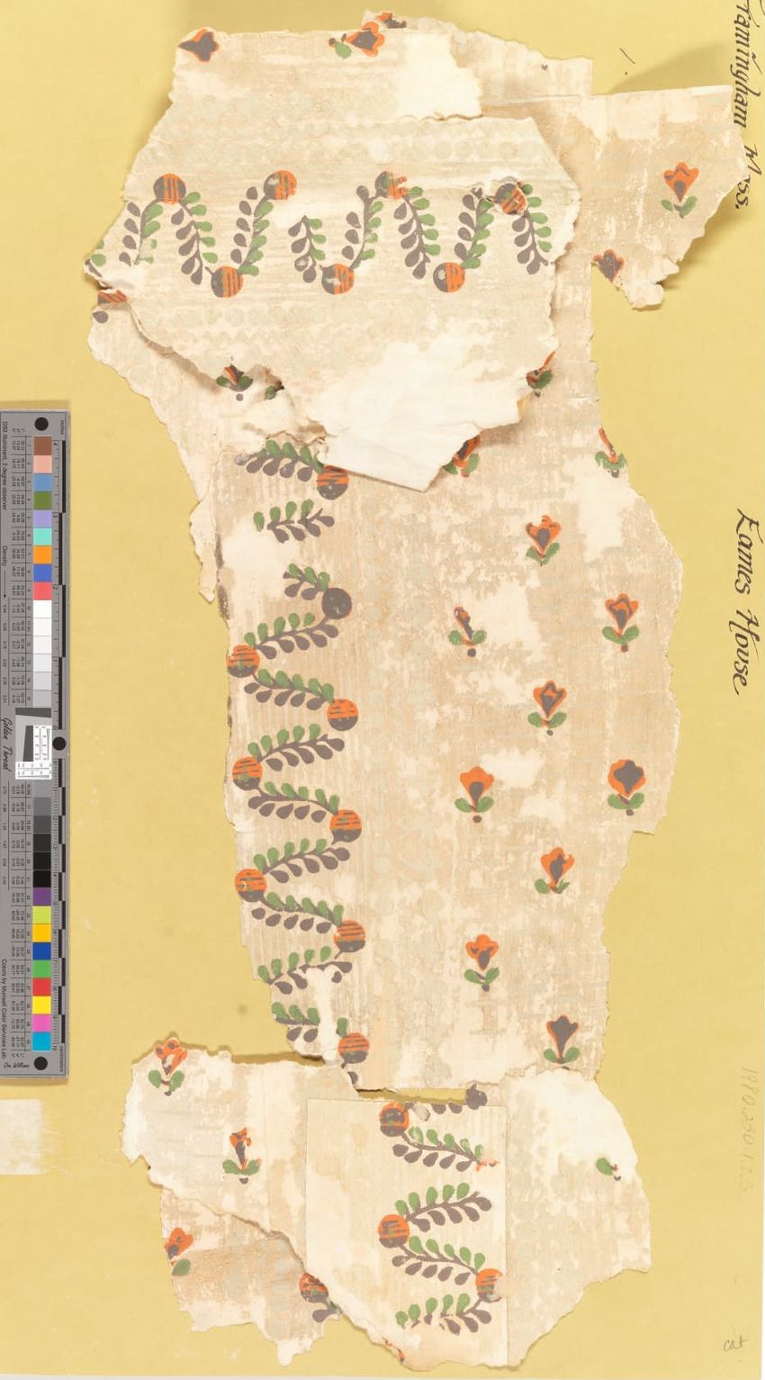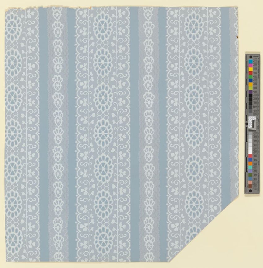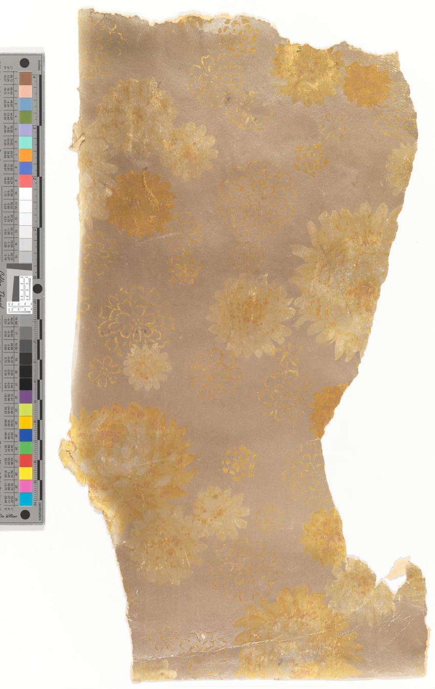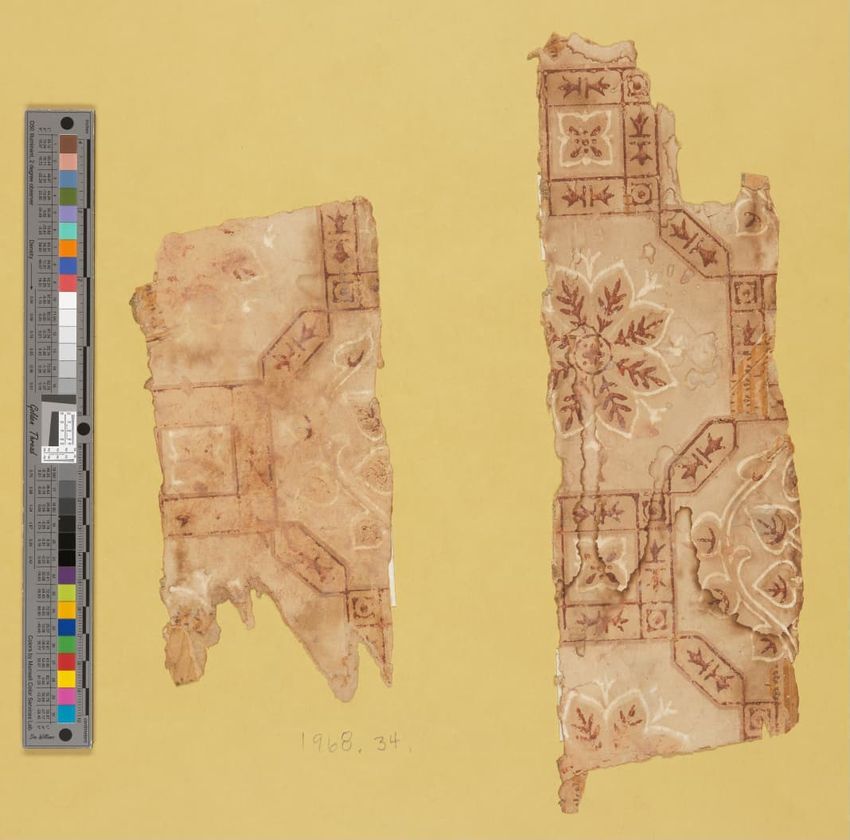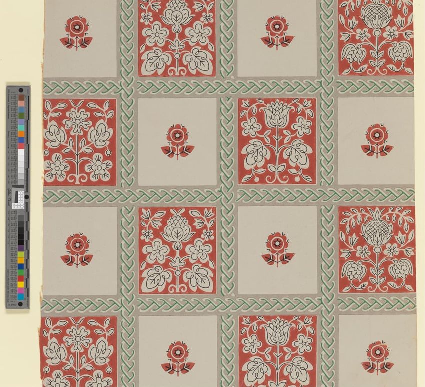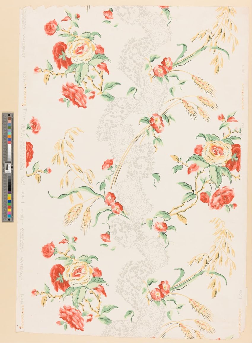 Unused sample. Circular medallions, composed of C-scrolls, encircle flowers. Diaper pattern. Printed in pink, two reds, three greens, white, black, liquid mica, two greys on a grey/white ground. Embossed.