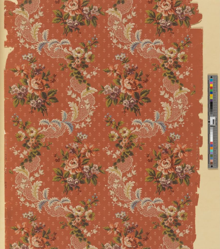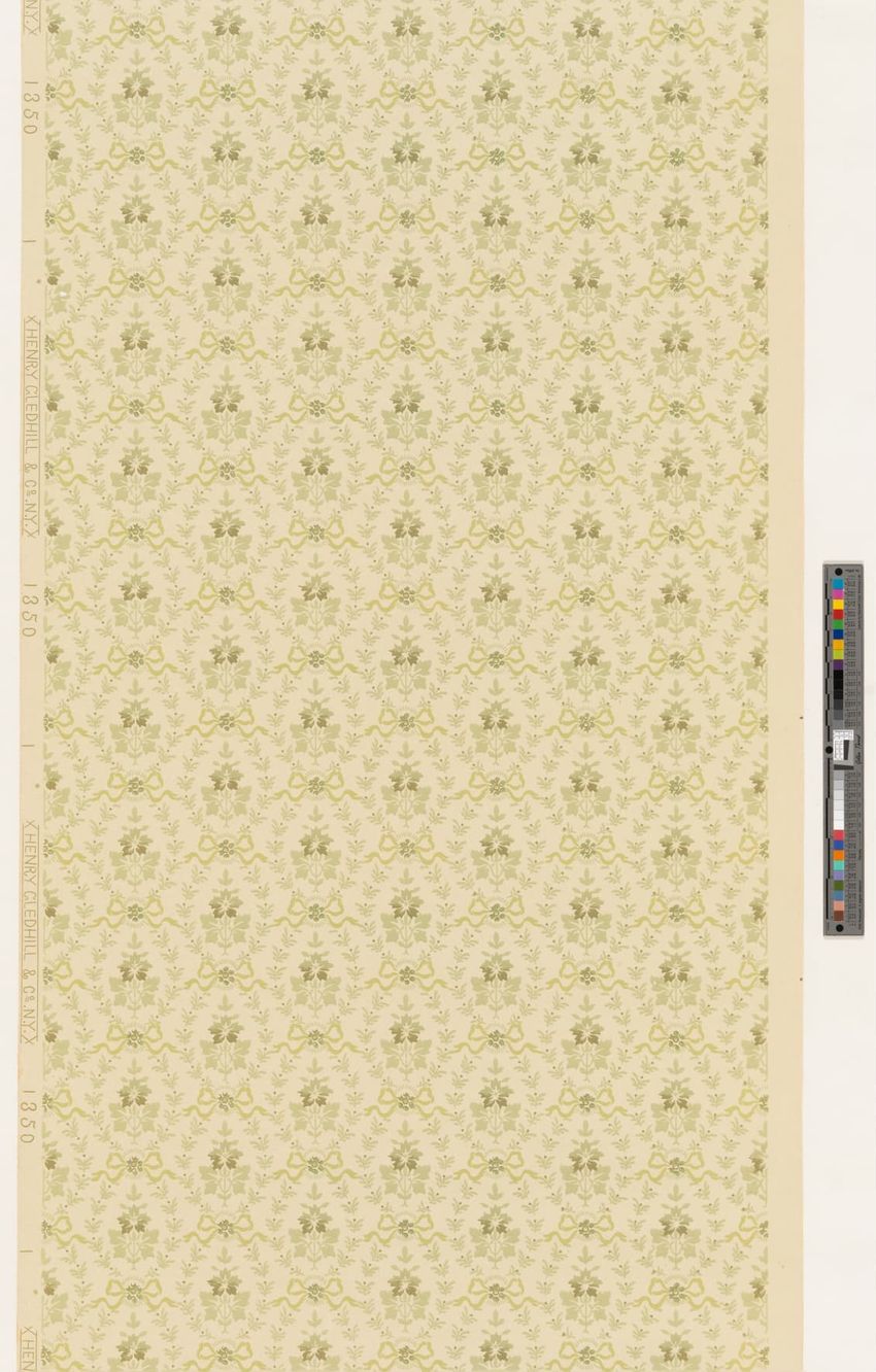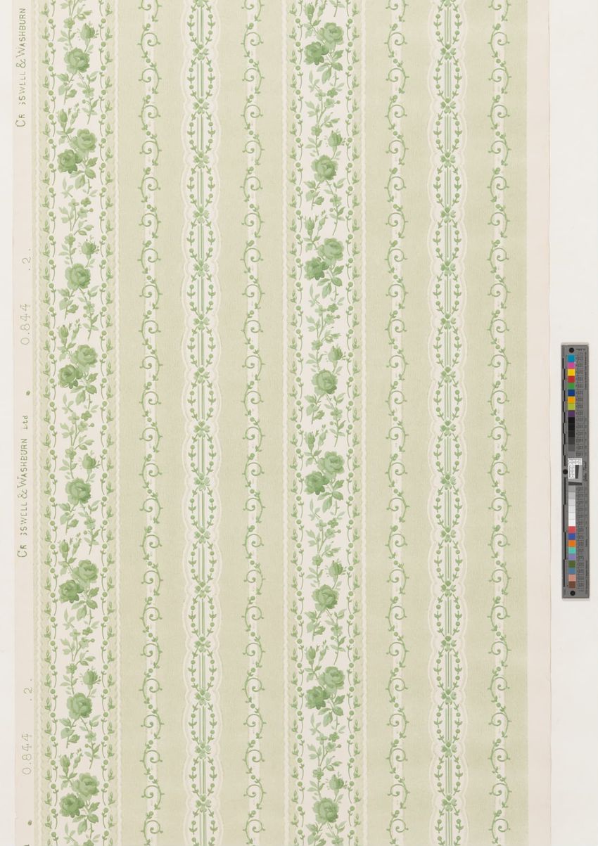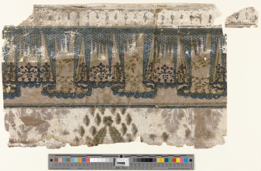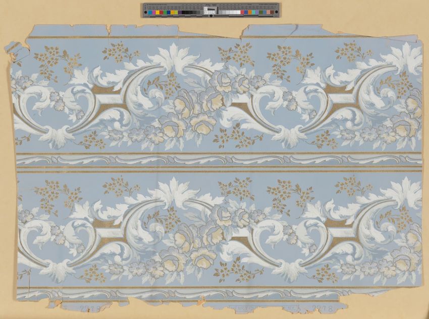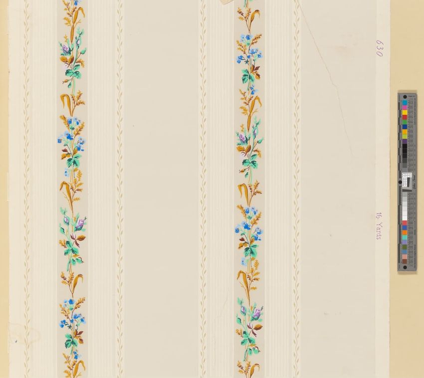 Partial roll of wallpaper border. Continuous row of tulips, daffodils and peonies, bordered above and below by brattishing. Printed in two greens, two blues, pink, red, yellow and white.