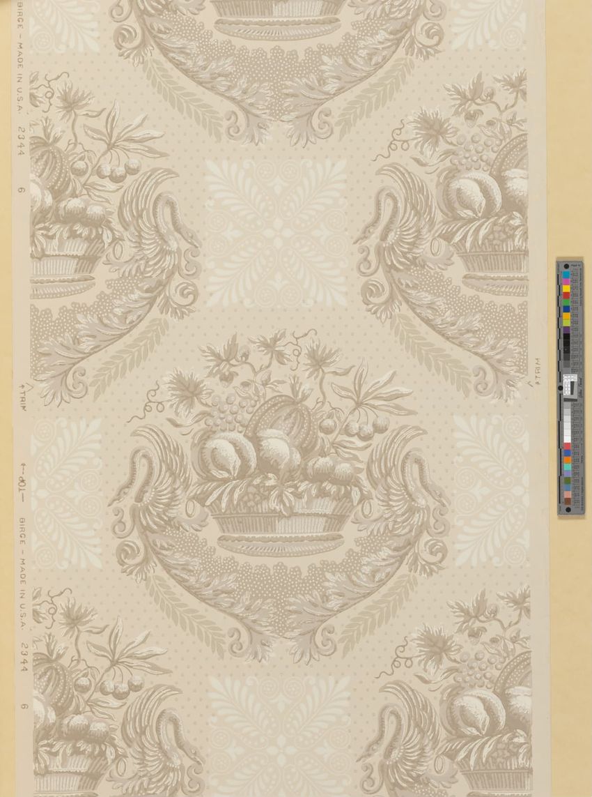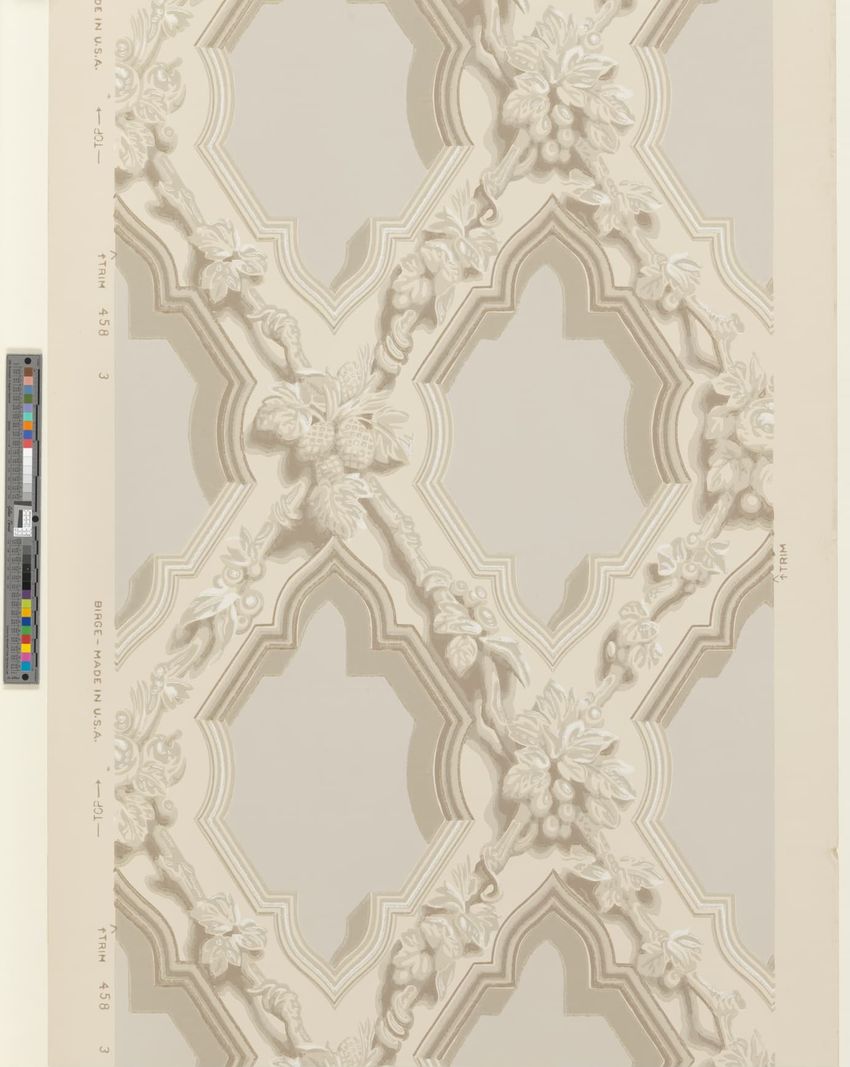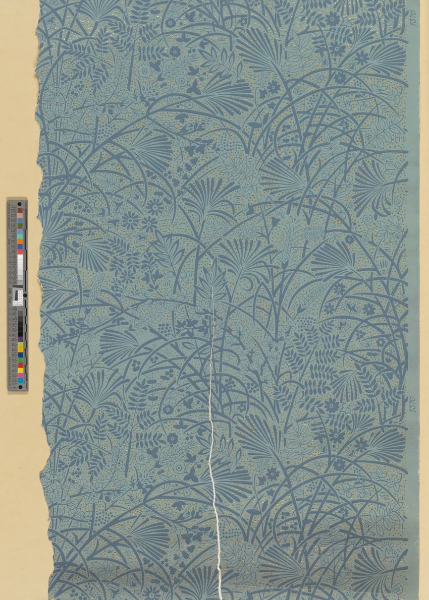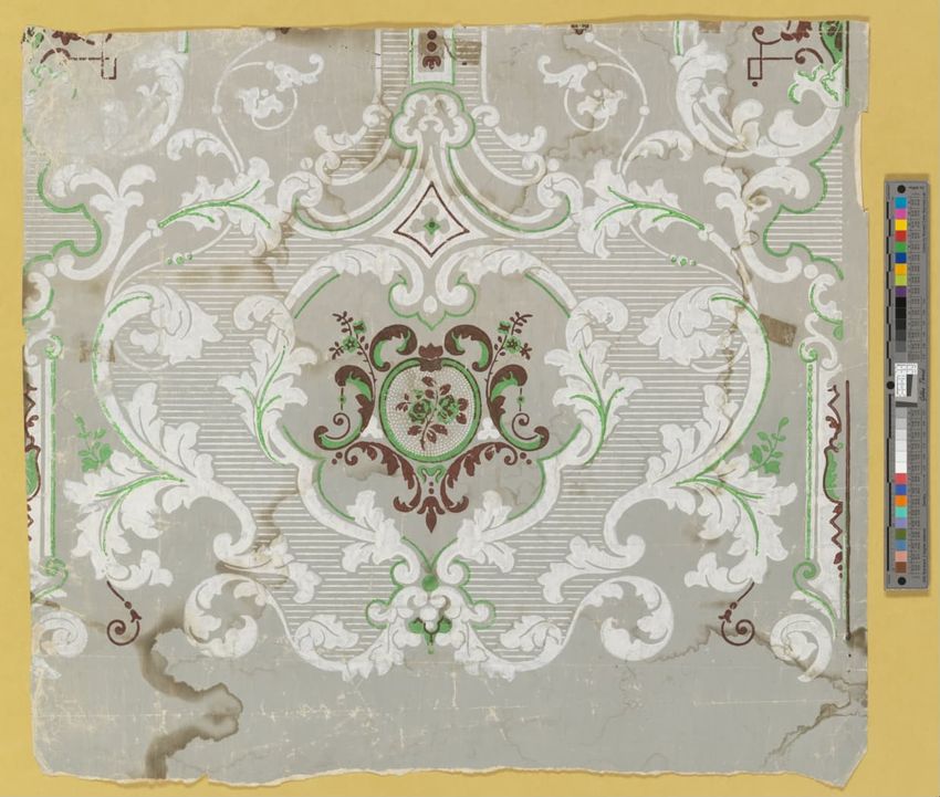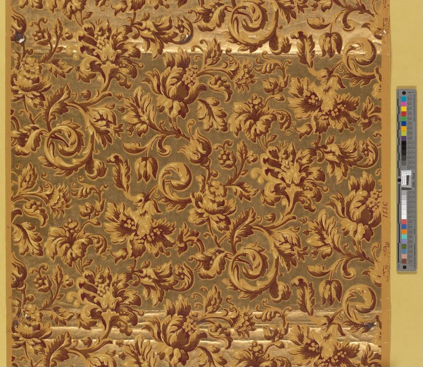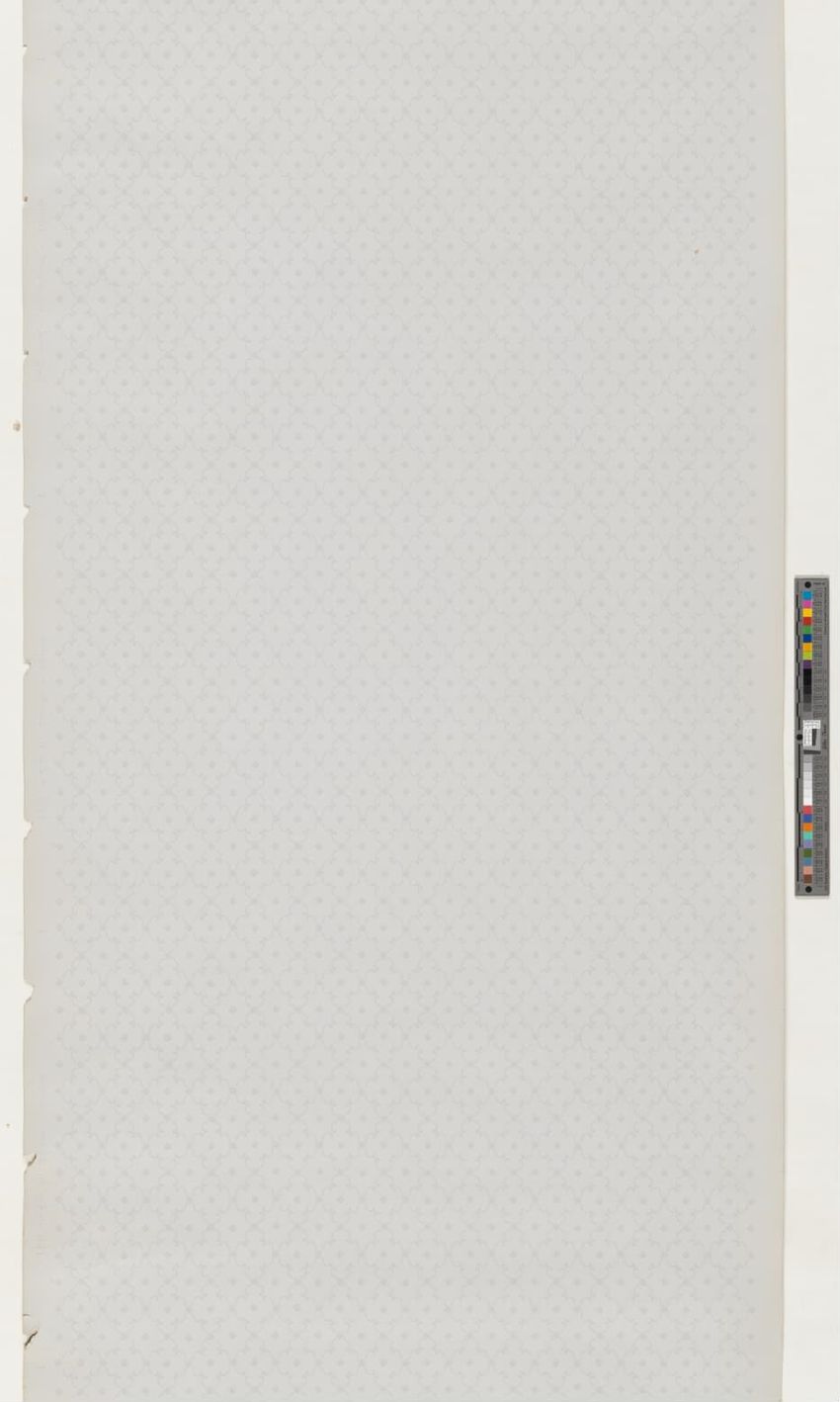 Partial roll of wallpaper border. Continuous row of tulips, daffodils and peonies, bordered above and below by brattishing. Printed in two greens, two blues, pink, red, yellow and white.