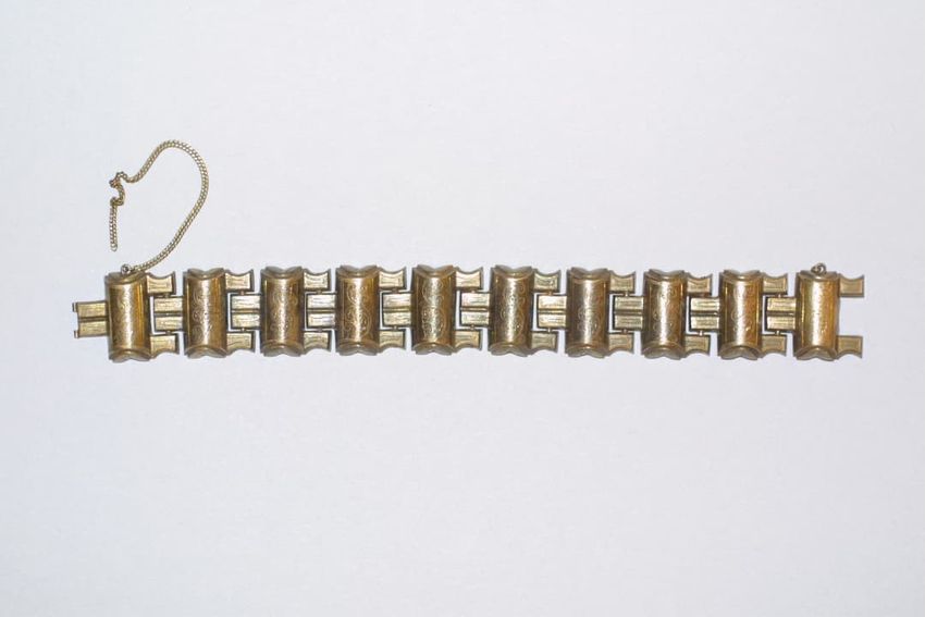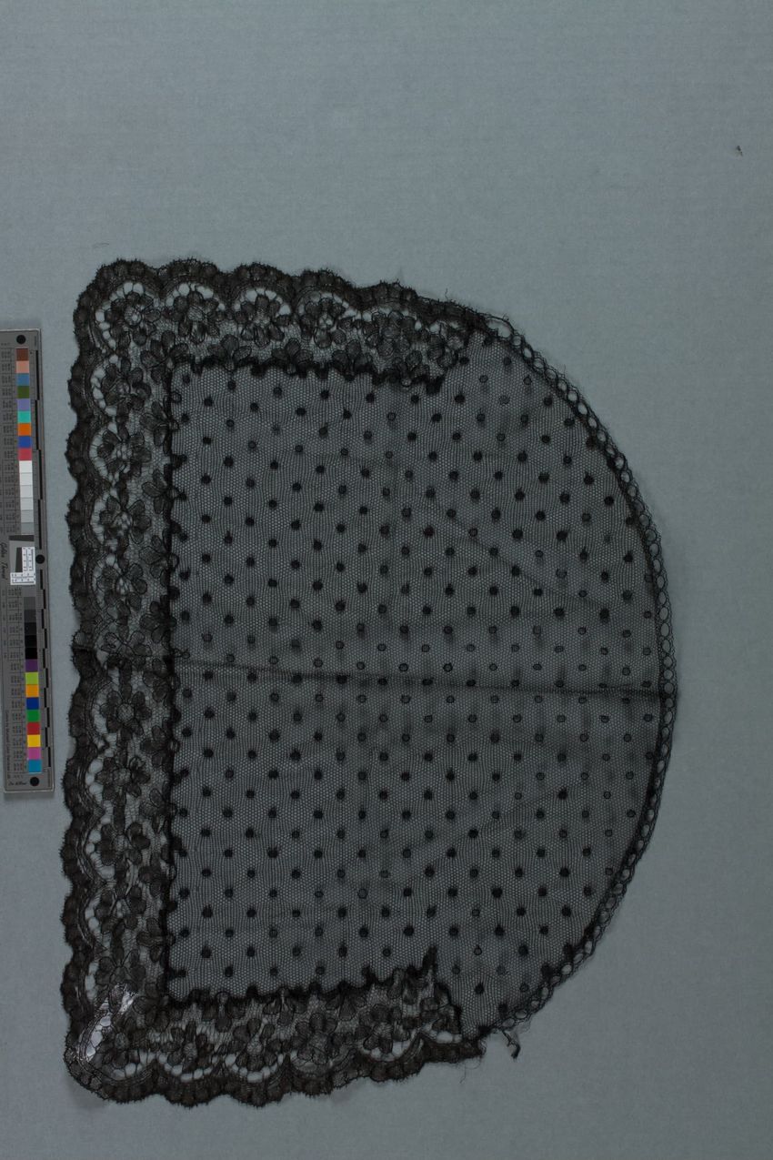 Irridescent purple taffeta with white pinstripes; sheer lawn collar, embroidered with floral sprays, french knots and scalloped edge; inner collar (chemisette) of same with overlap snap closure; long sleeves with scalloped, piped edge, and undersleeves of net with same embroidered lawn at cuffs; dr...
