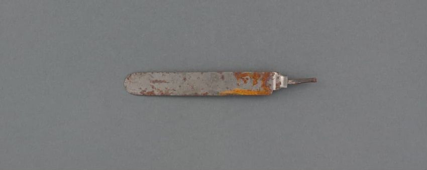 Metal pen nib attached to original cardboard card featuring a castle and lake scene over a bust portrait of a young man and a scrolling leaf and thistle border in white on an orange background.